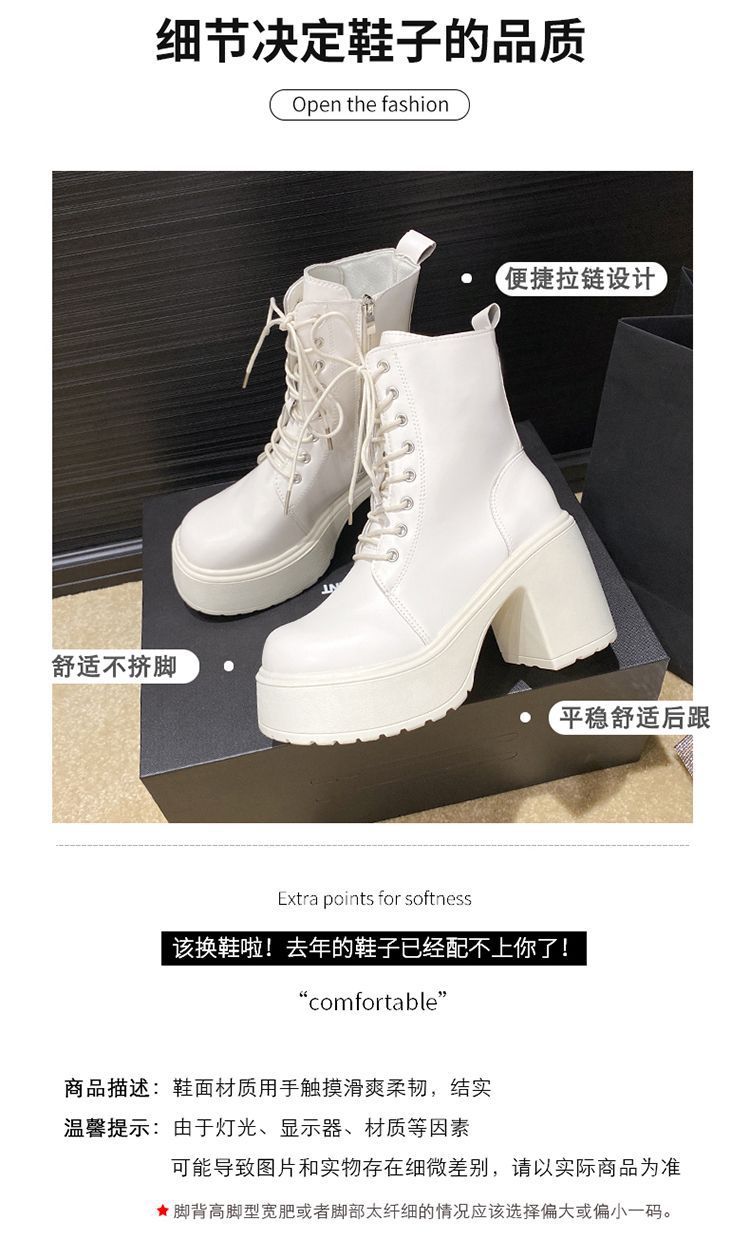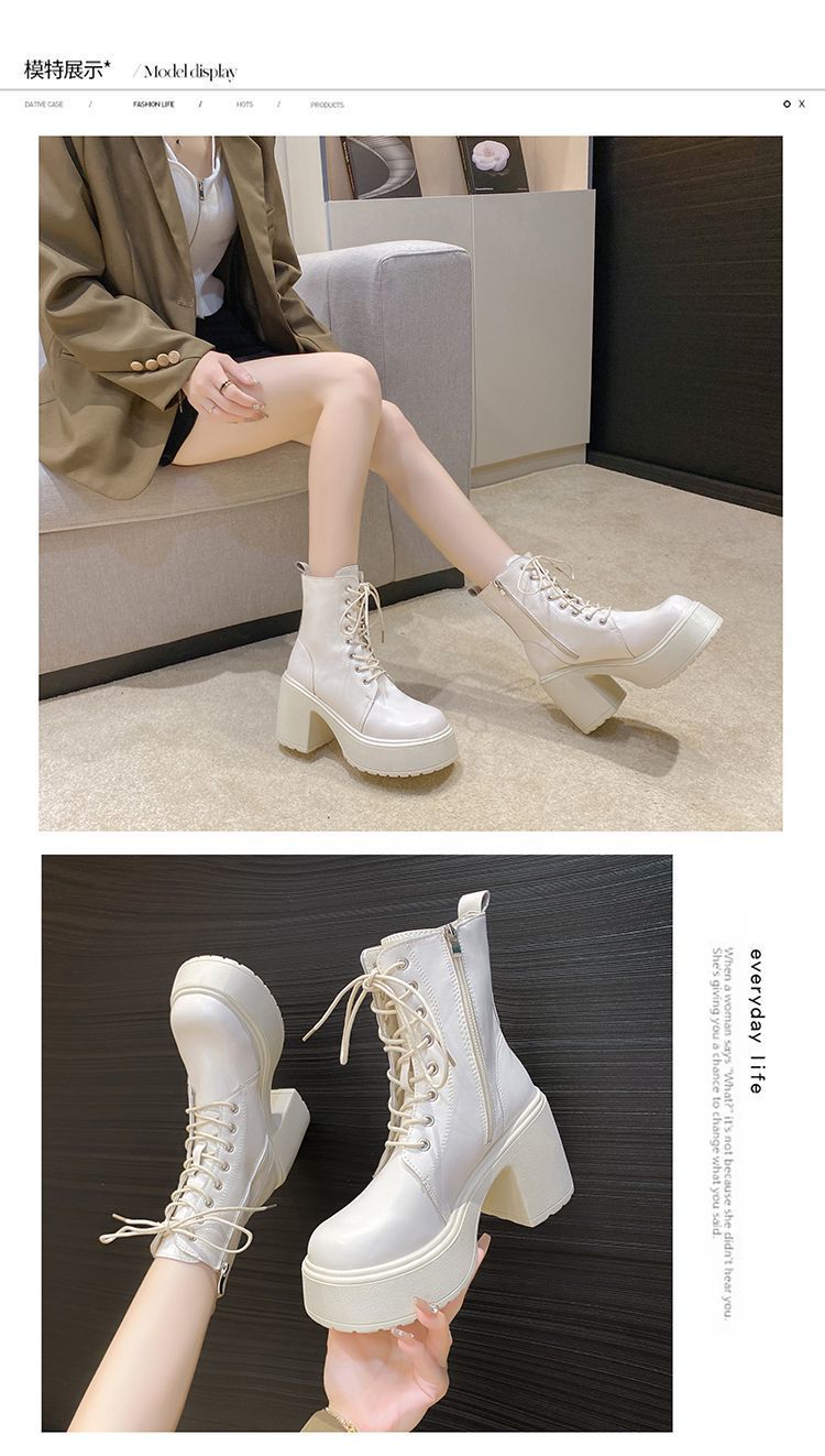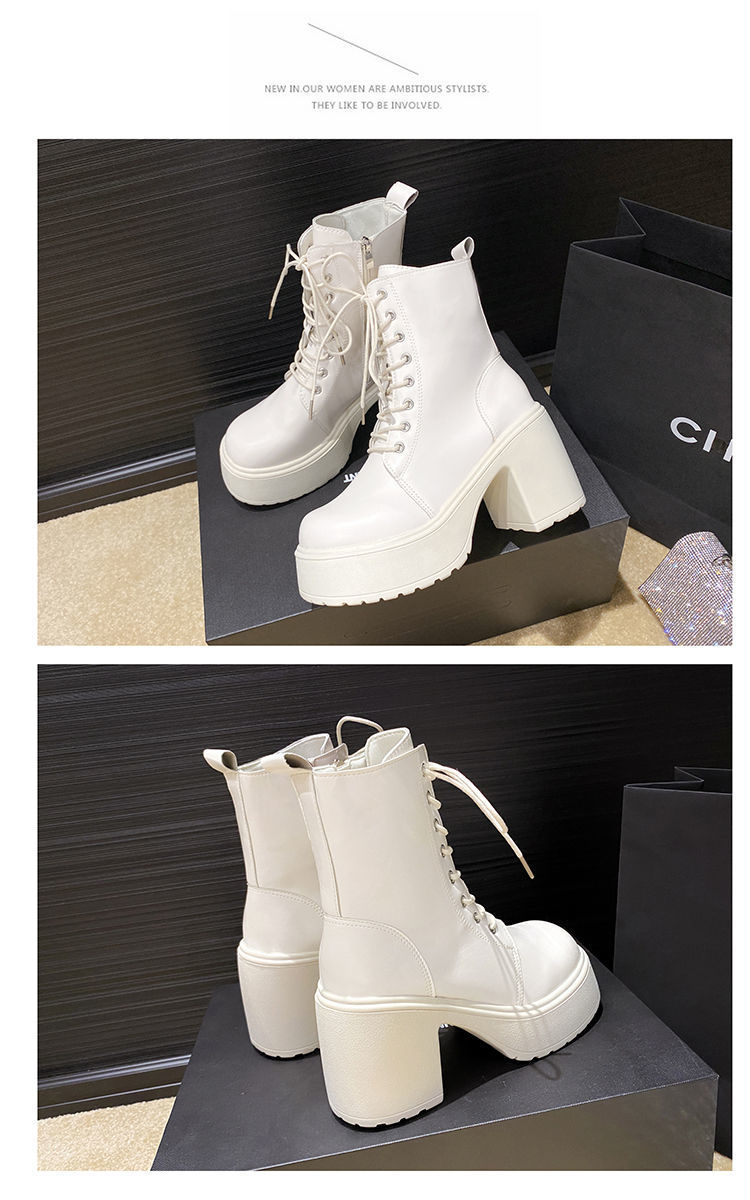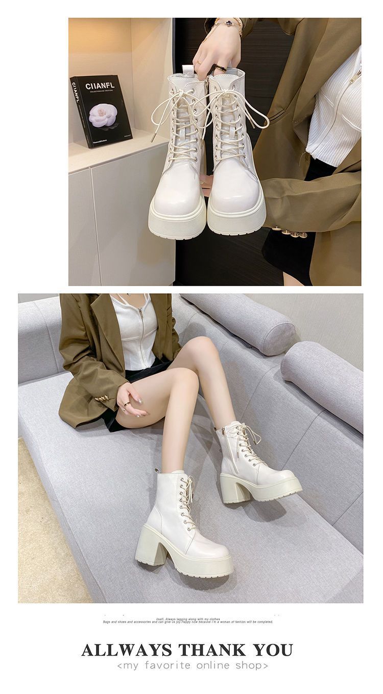 둥근 발가락 두꺼운 힐 레이스 업 마틴 부츠 여성용 하이힐 플랫폼 두꺼운 바닥 짧은 부츠 쁘띠 빈티지 화이트 소프트 가죽 부츠스토어 가기