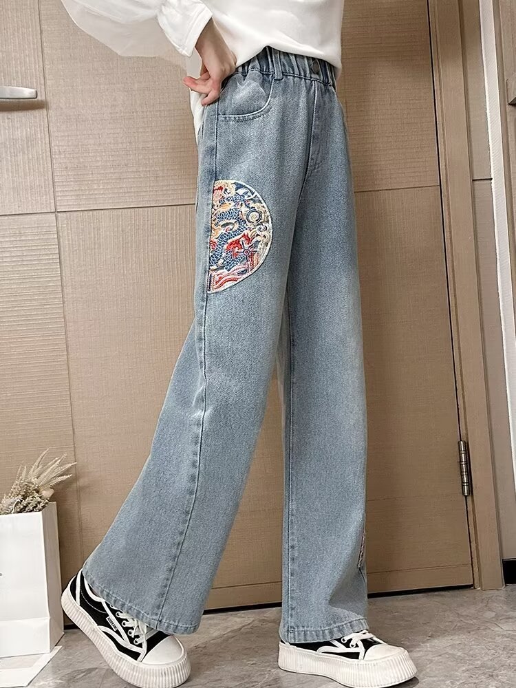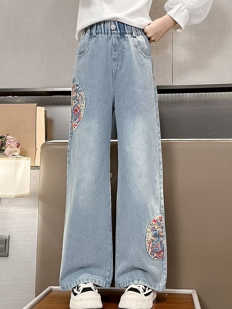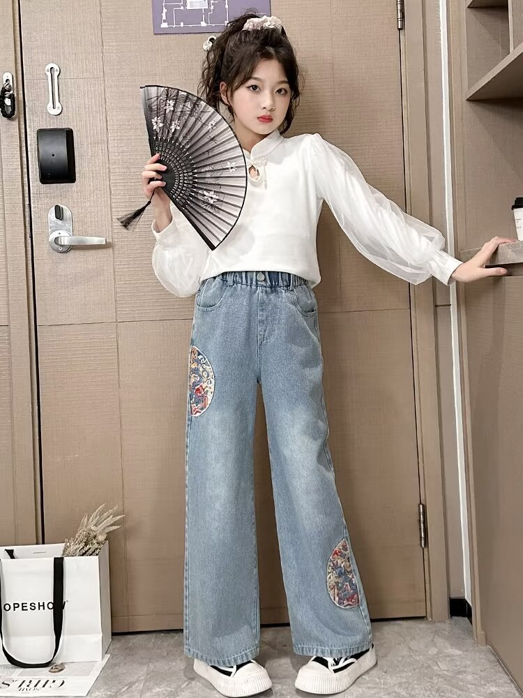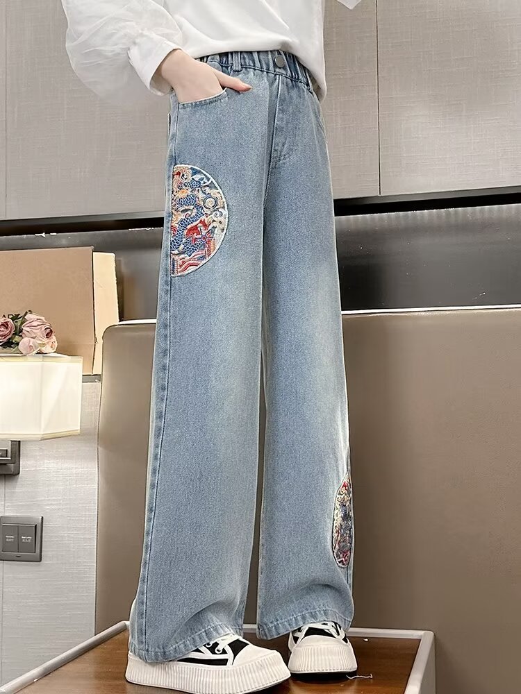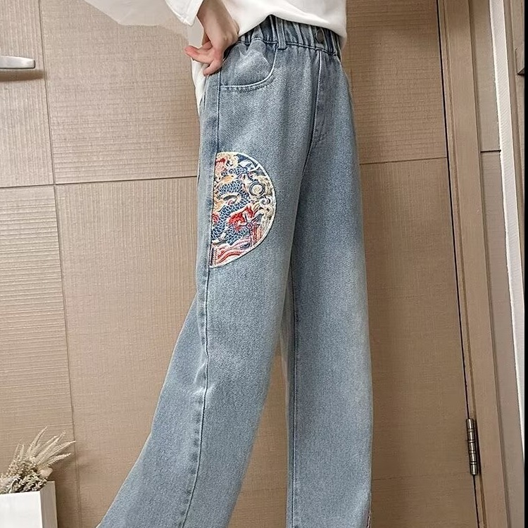 소녀 청바지 하이 엔드 봄과 여름 2024 새로운 어린이 스트레이트 튜브 대형 와이드 레그 스프링 루즈 바지스토어 가기