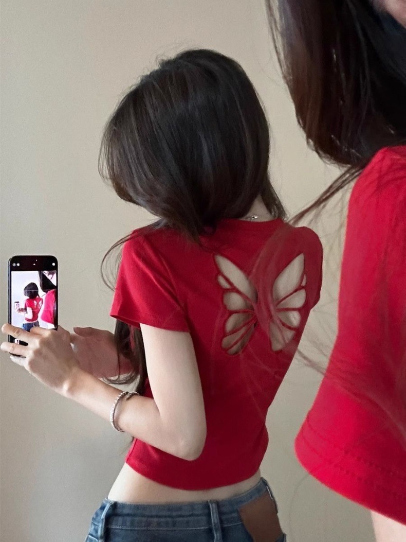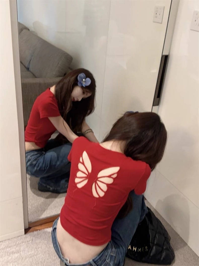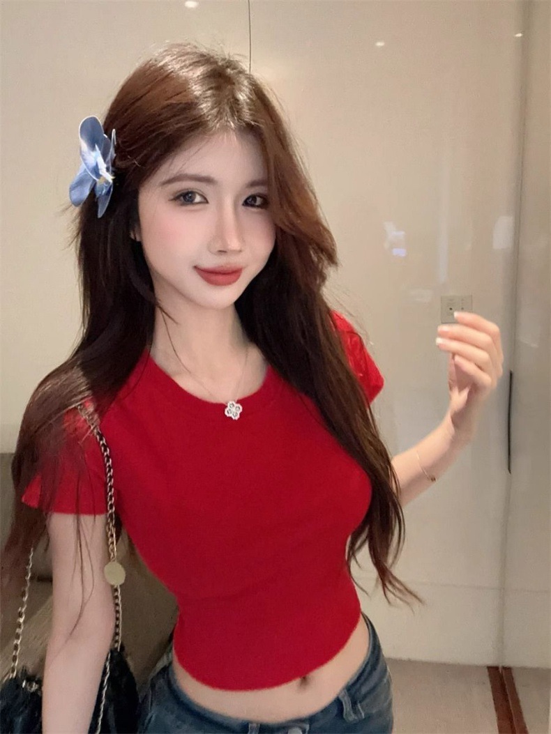 할로우 활 자수 어깨 반팔 티셔츠 여성용 여름 배꼽 노출 짧은 슬림 핏 슬리밍 스파이스 걸 탑