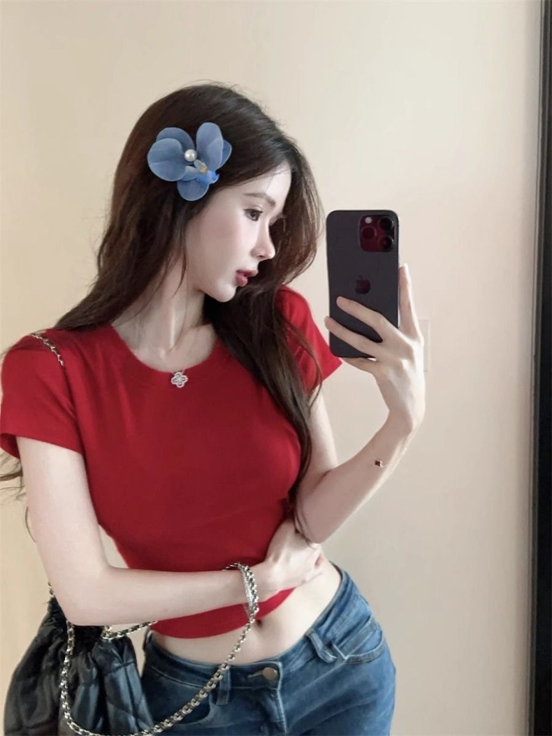 할로우 활 자수 어깨 반팔 티셔츠 여성용 여름 배꼽 노출 짧은 슬림 핏 슬리밍 스파이스 걸 탑스토어 가기