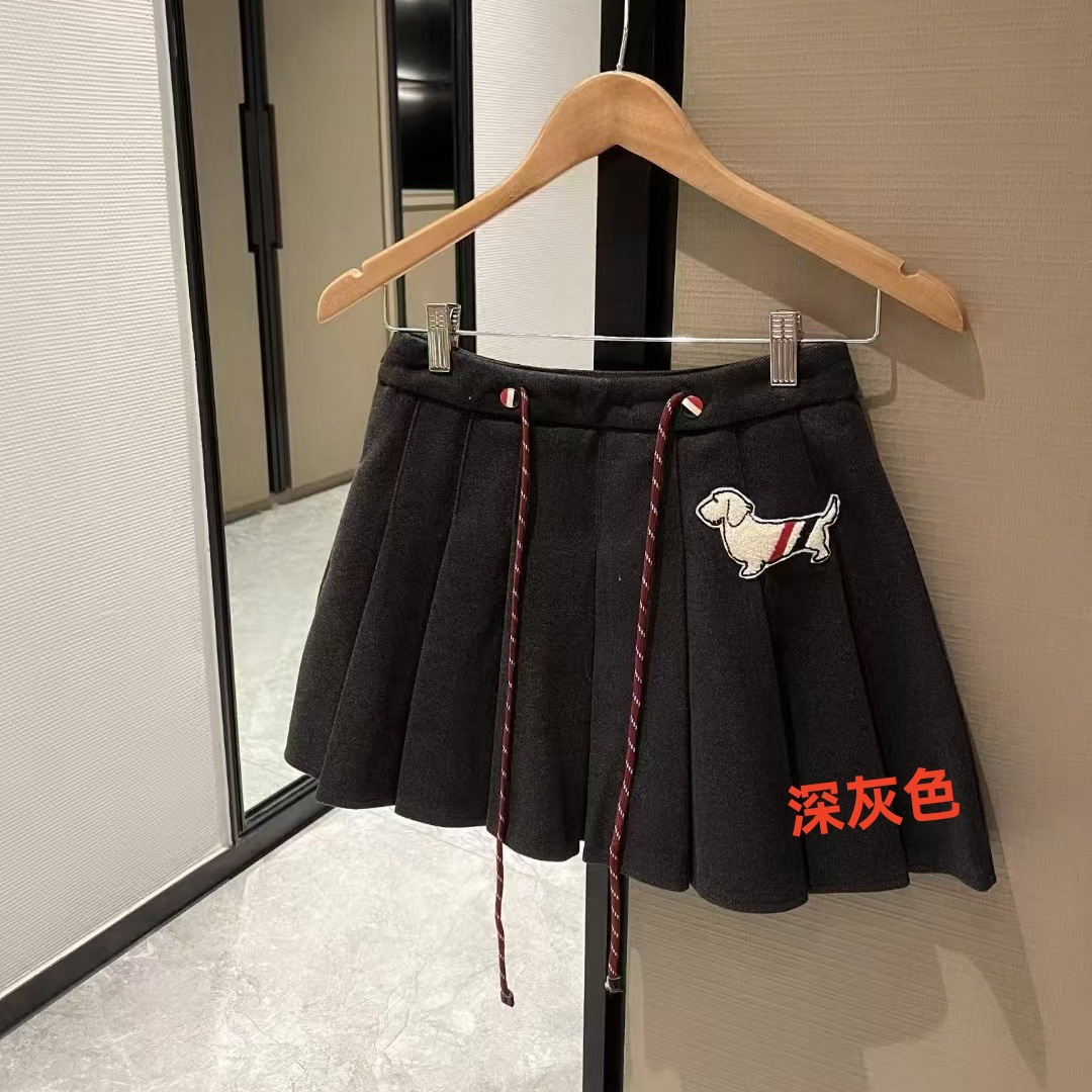 • 드로스트링 모직 플리츠 스커트. 회색.