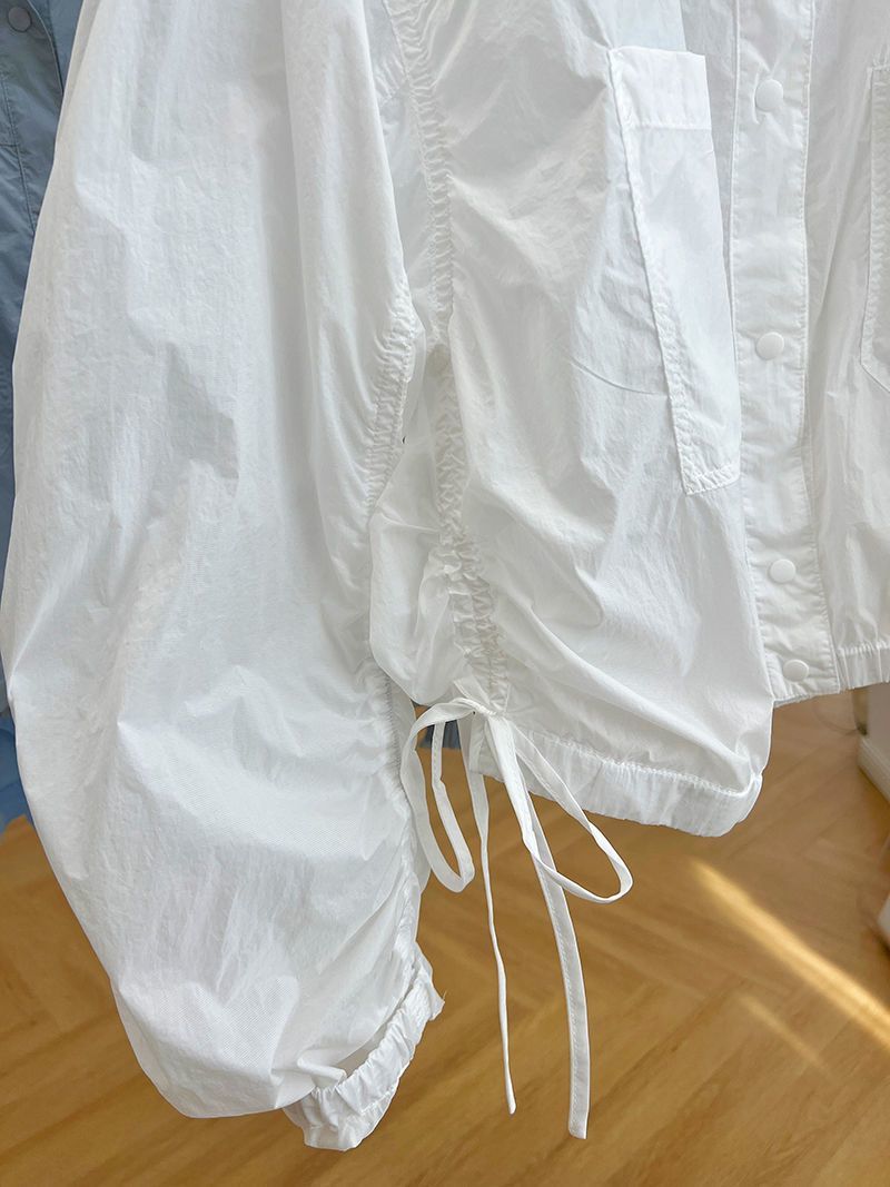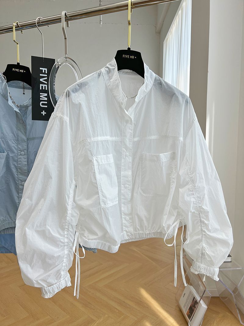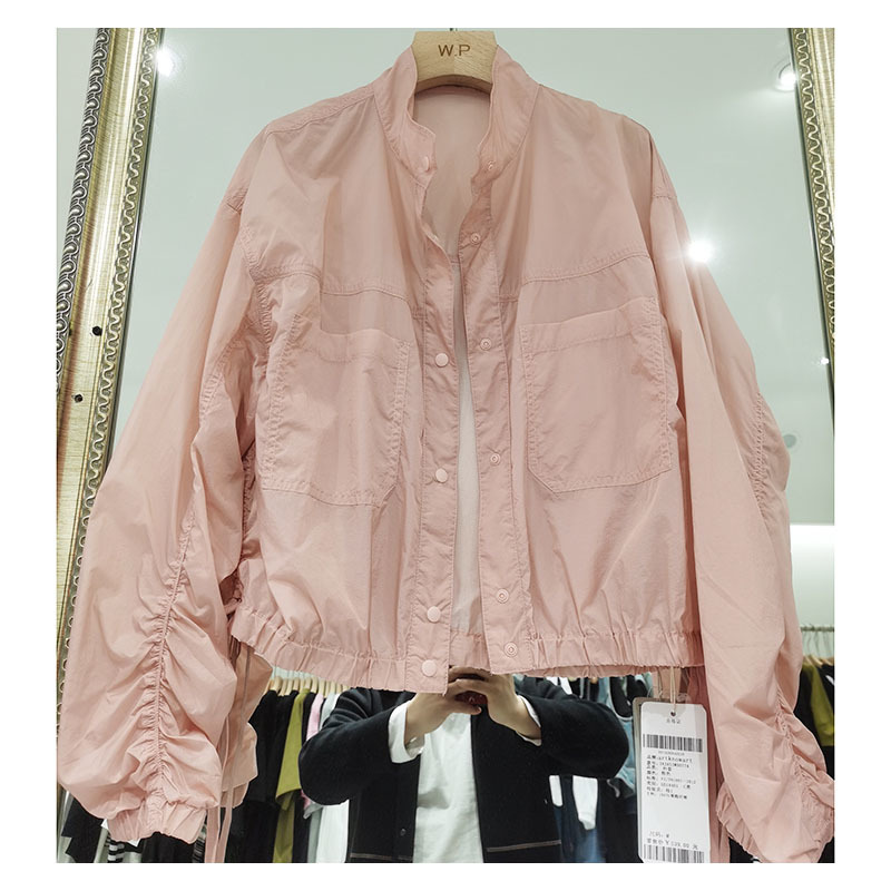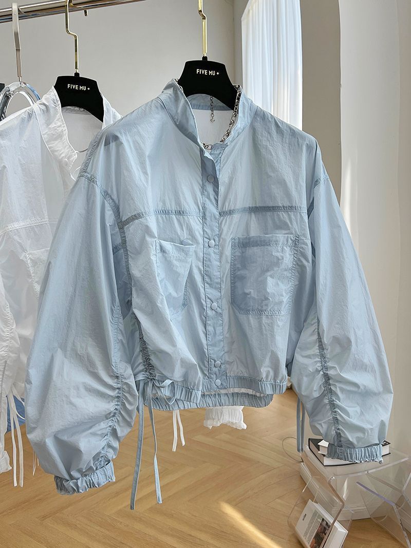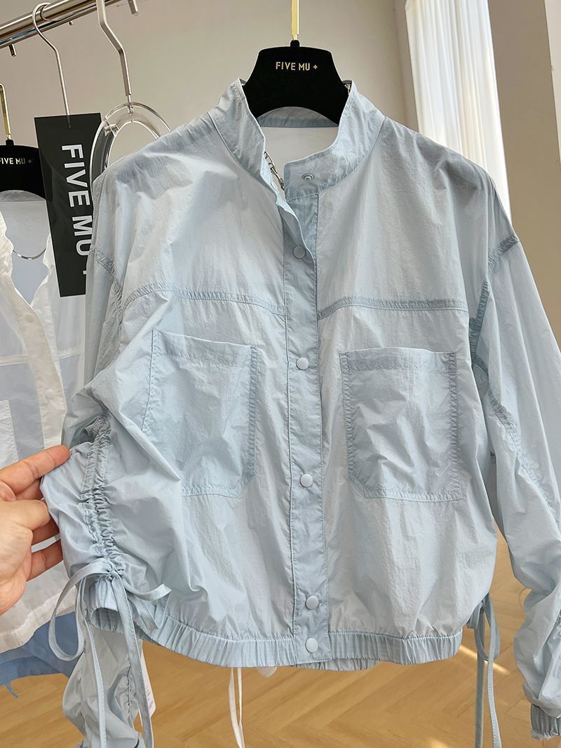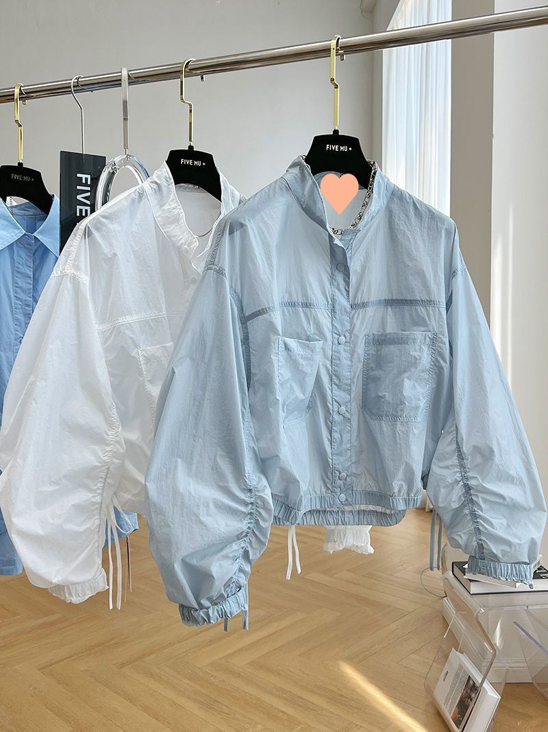 디자인 감각 틈새 하이 엔드 주름 얇은 수직 칼라 태양 보호 의류 여성의 여름 유럽 느슨한 짧은 재킷 코트 트렌디스토어 가기