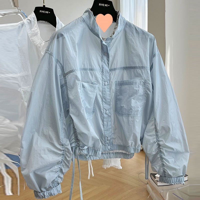 디자인 감각 틈새 하이 엔드 주름 얇은 수직 칼라 태양 보호 의류 여성의 여름 유럽 느슨한 짧은 재킷 코트 트렌디