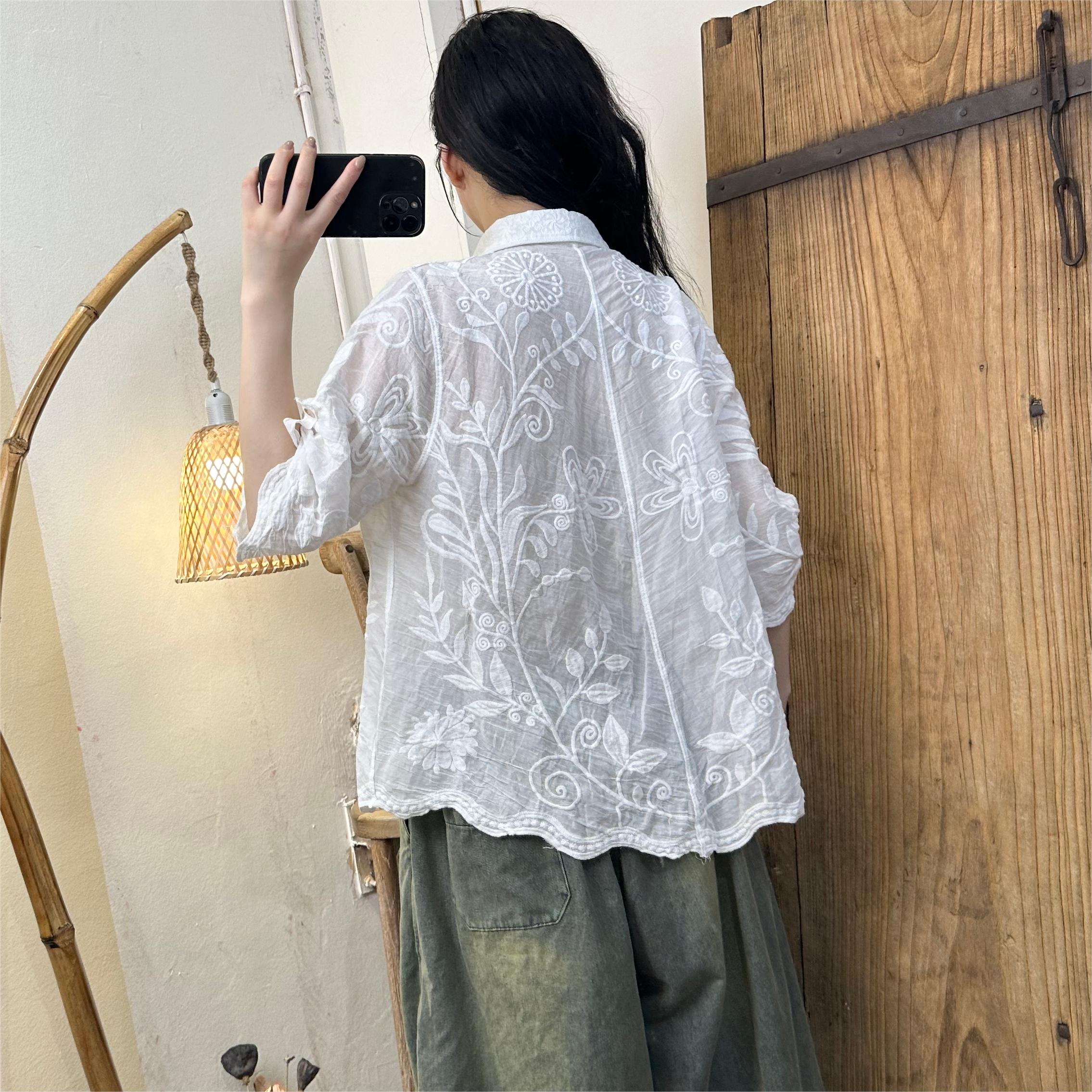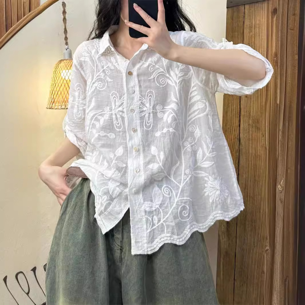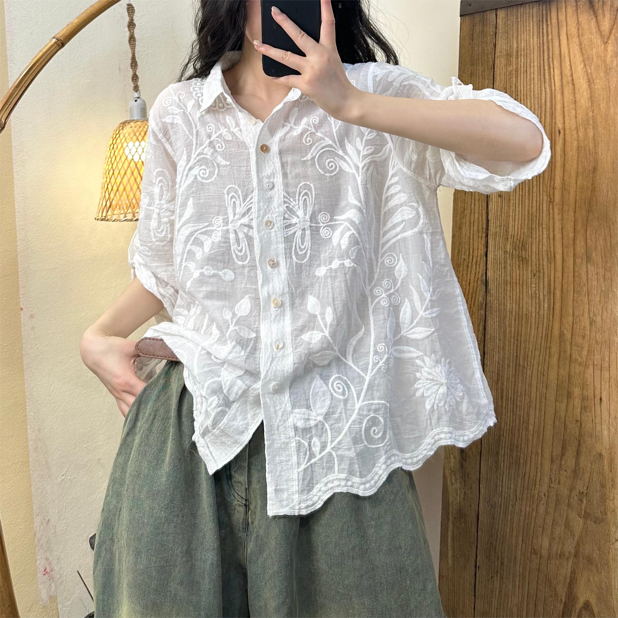 2024 여름 새로운 캐주얼 올 매치 디자인 수 놓은 얇은 옷깃 예술적 스타일 셔츠스토어 가기