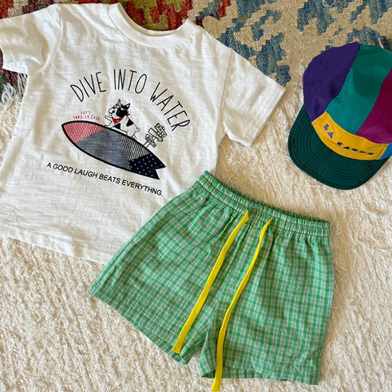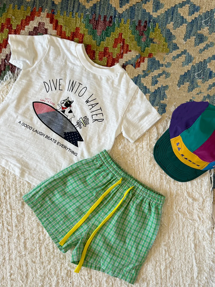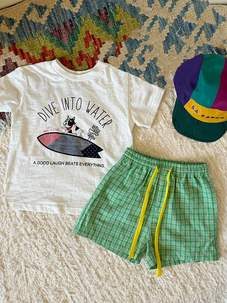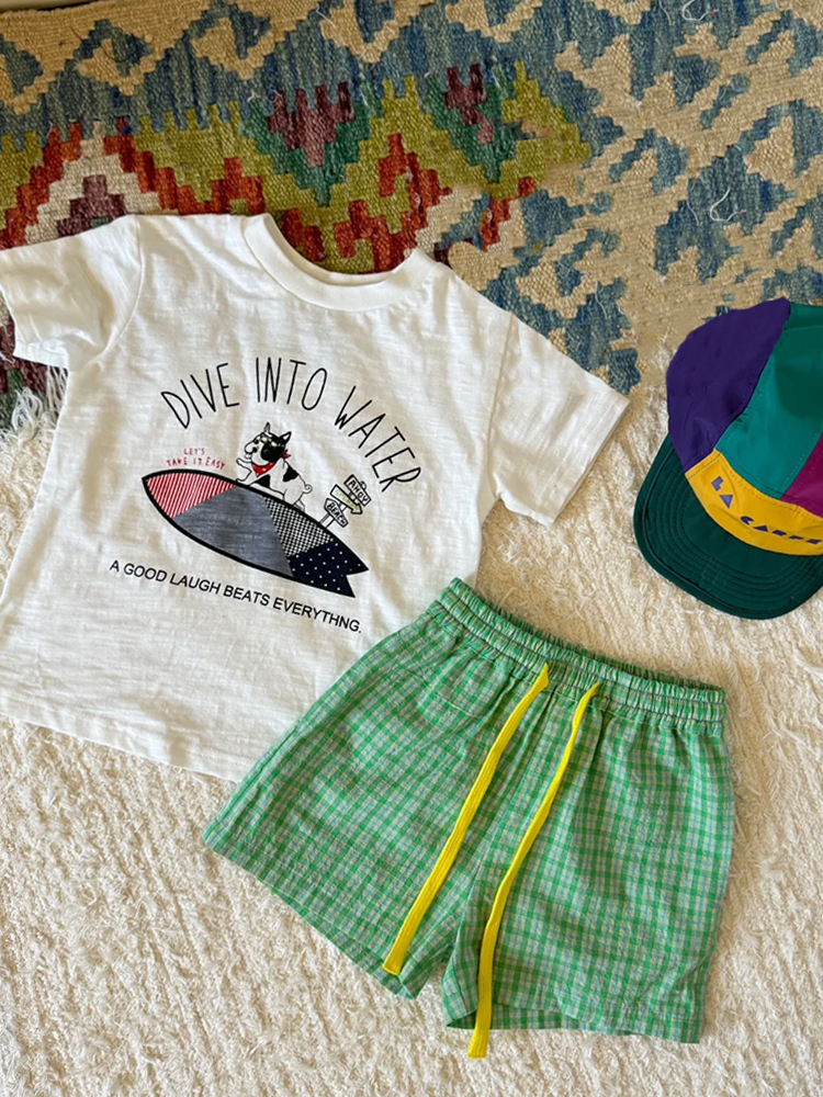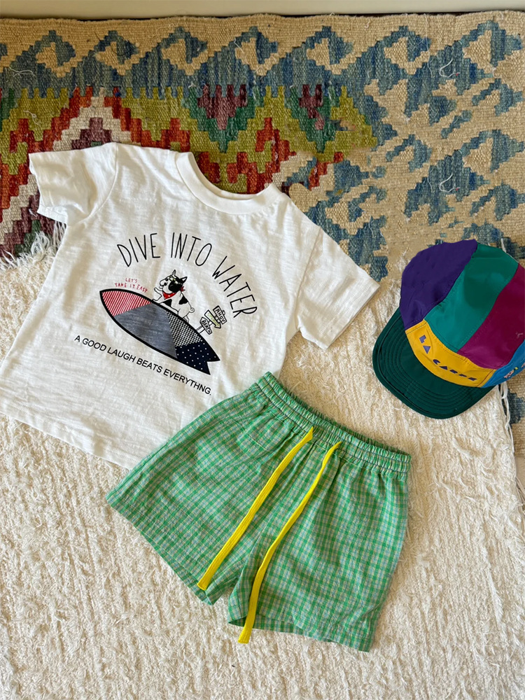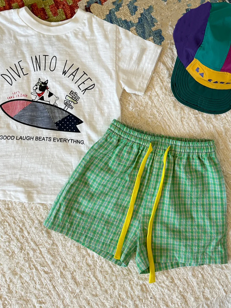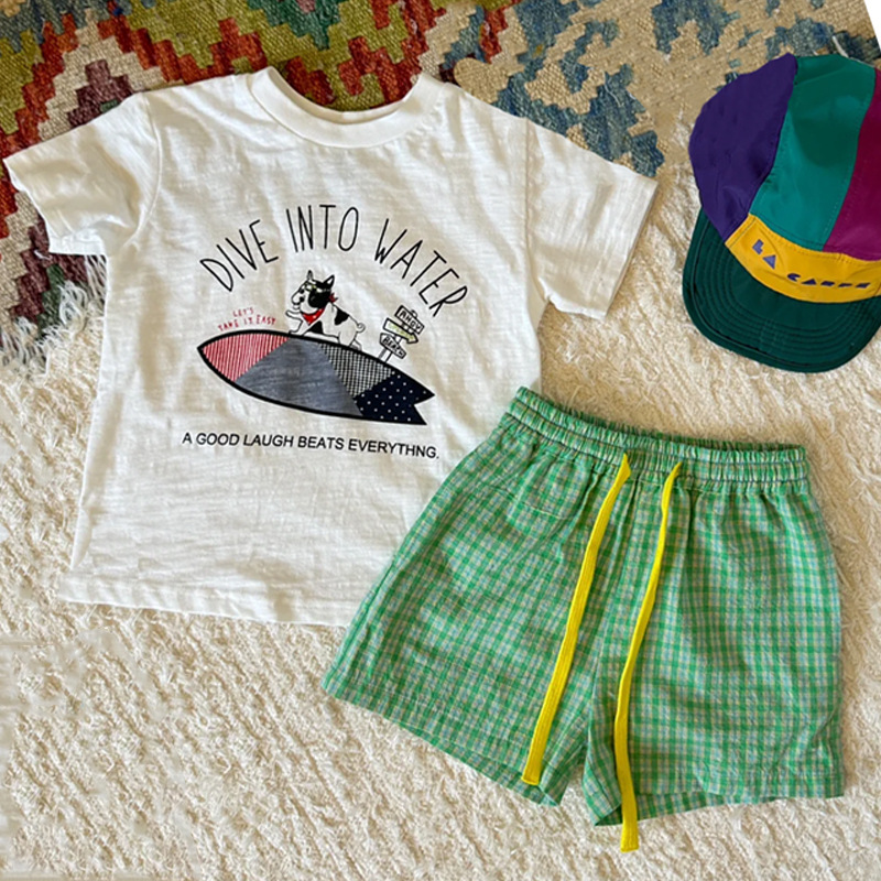 소녀 여름 세트 2024 새로운 세련된 소년 만화 인쇄 반팔 녹색 격자 무늬 반바지 아기 투피스 세트스토어 가기