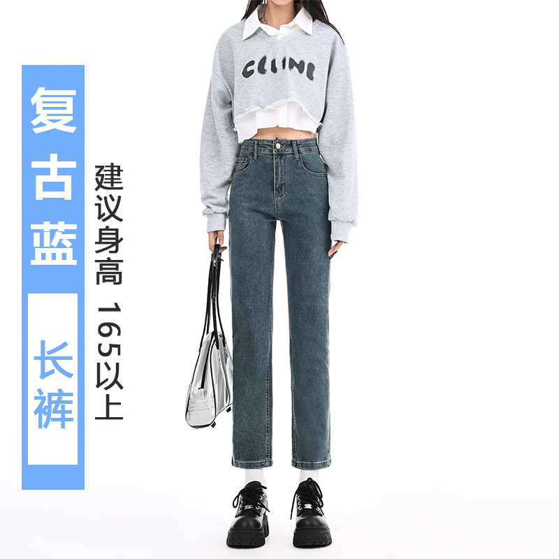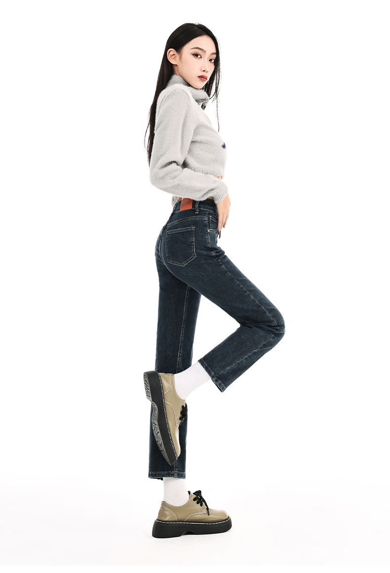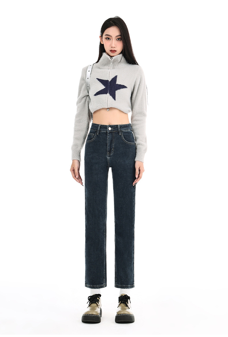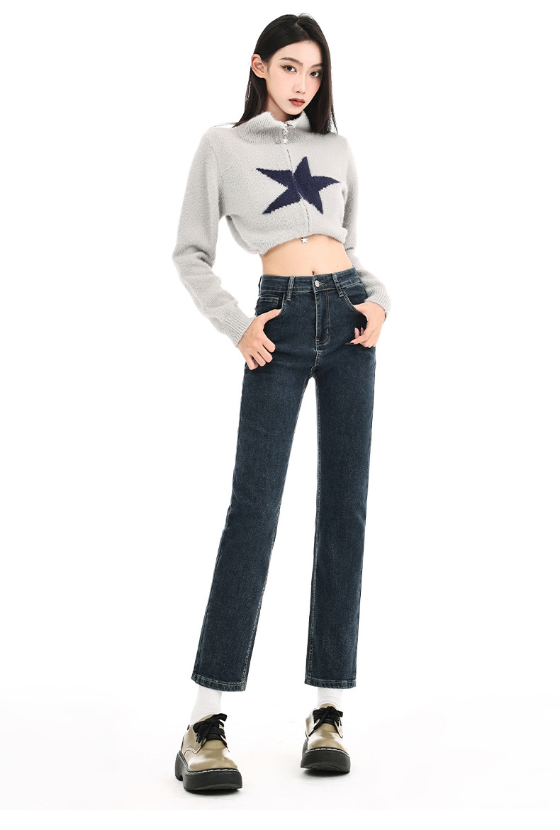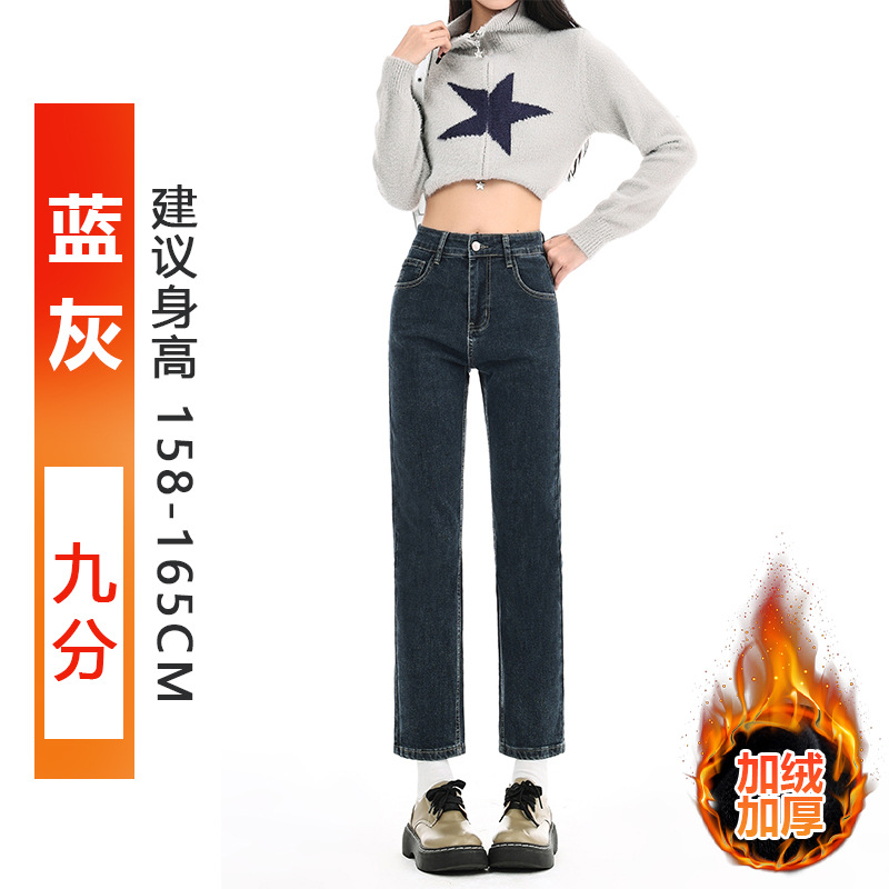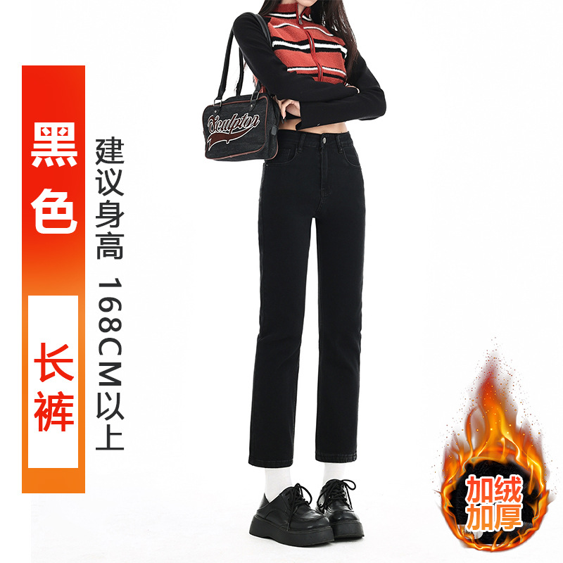 블랙 스트레이트 팬츠 플리스 데님 팬츠 여성용 가을 겨울 2025 신상품 작은 키 여성을 위한 하이웨이스트 슬림핏 스모크 파이프 팬츠스토어 가기
