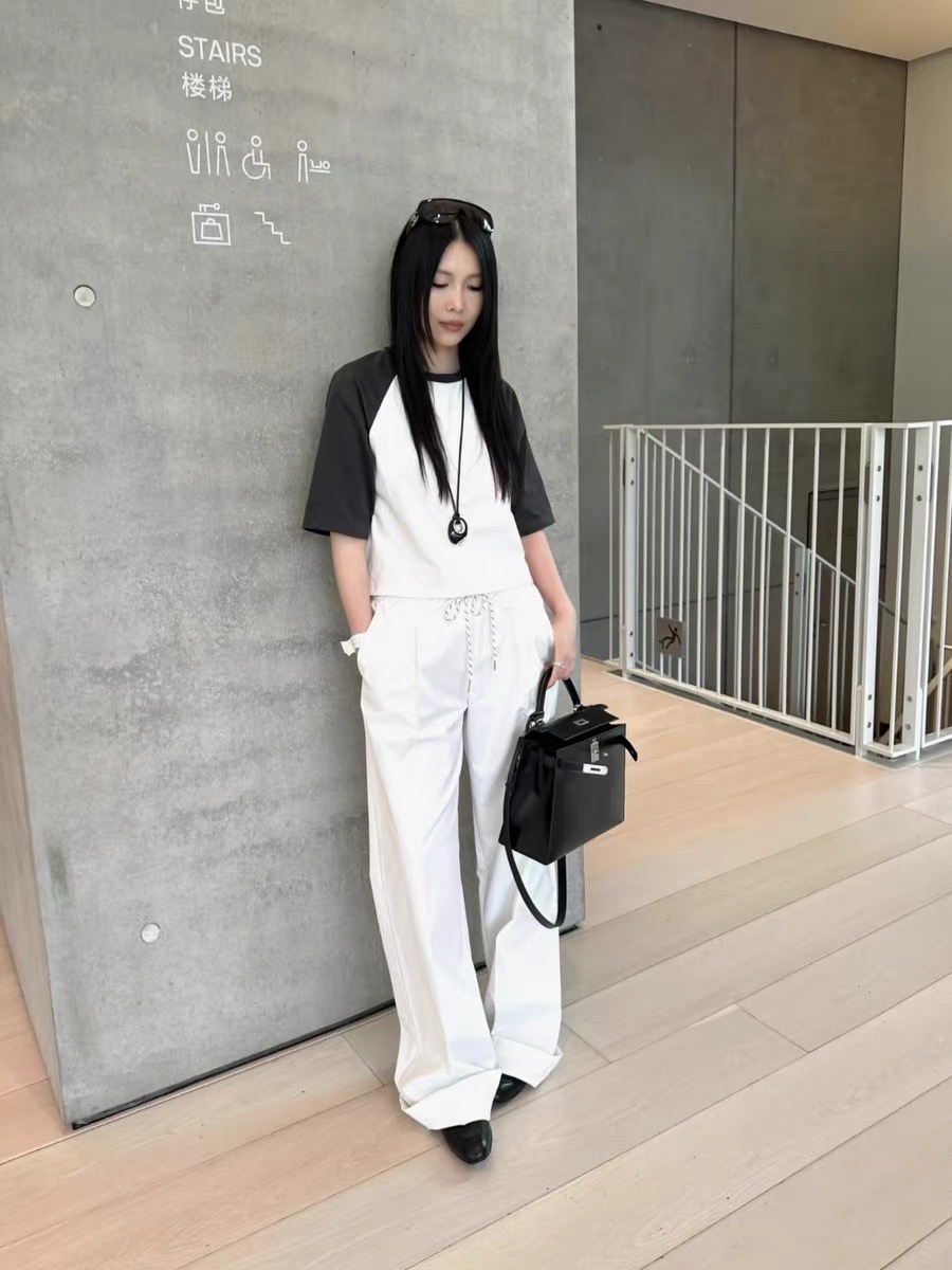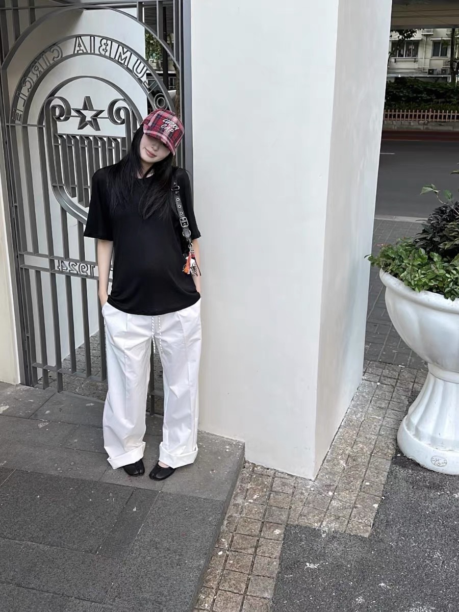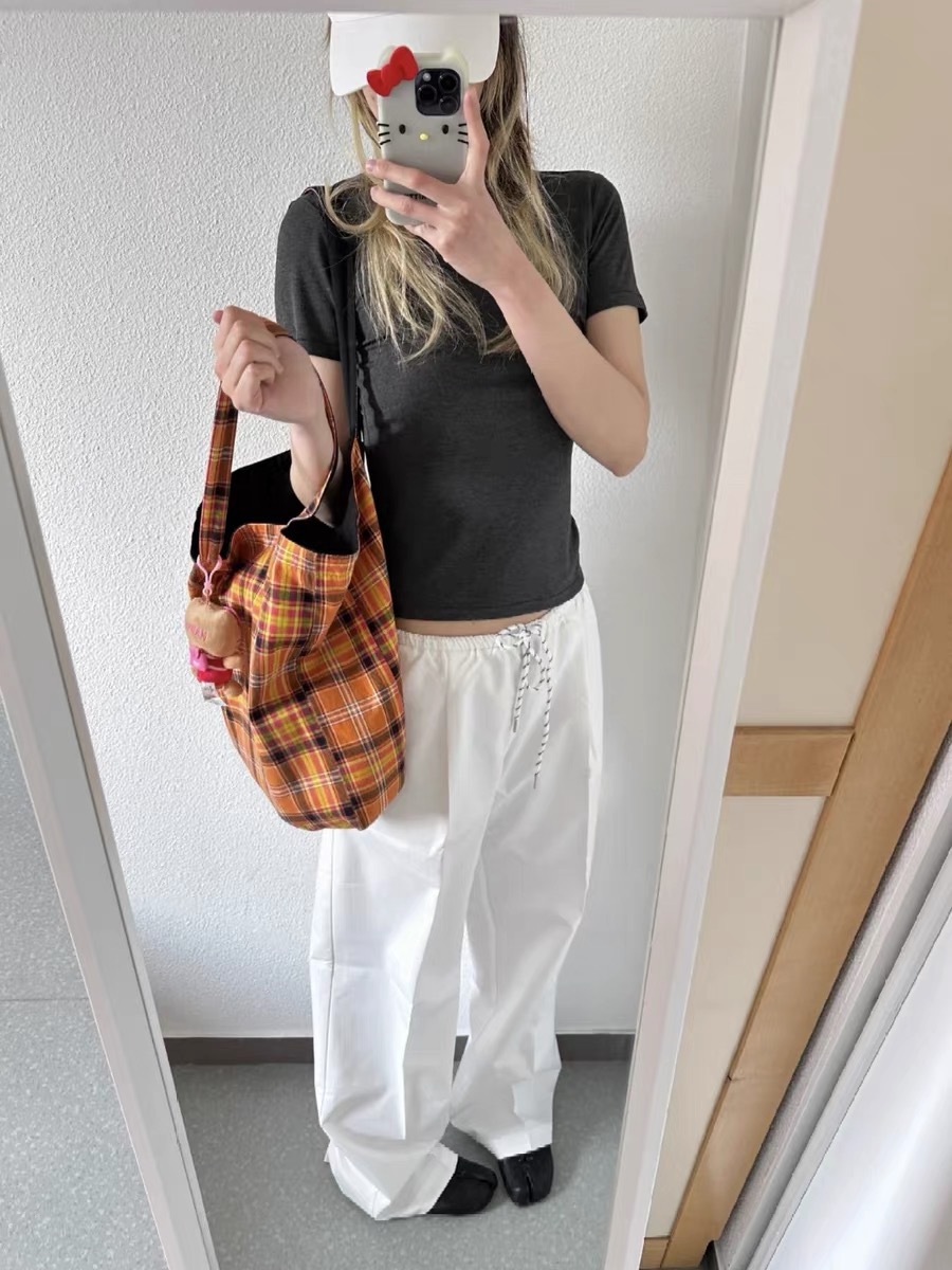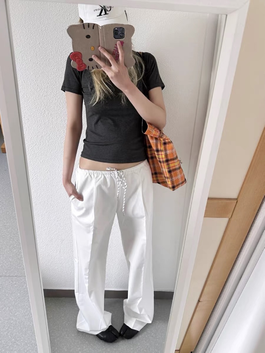 올 매치 단순 중립 스타일 슬리밍 대조 컬러 드로우 스트링 나일론 에어 편안한 캐주얼 바지 여성용 스트레이트 다리 바지 4220스토어 가기