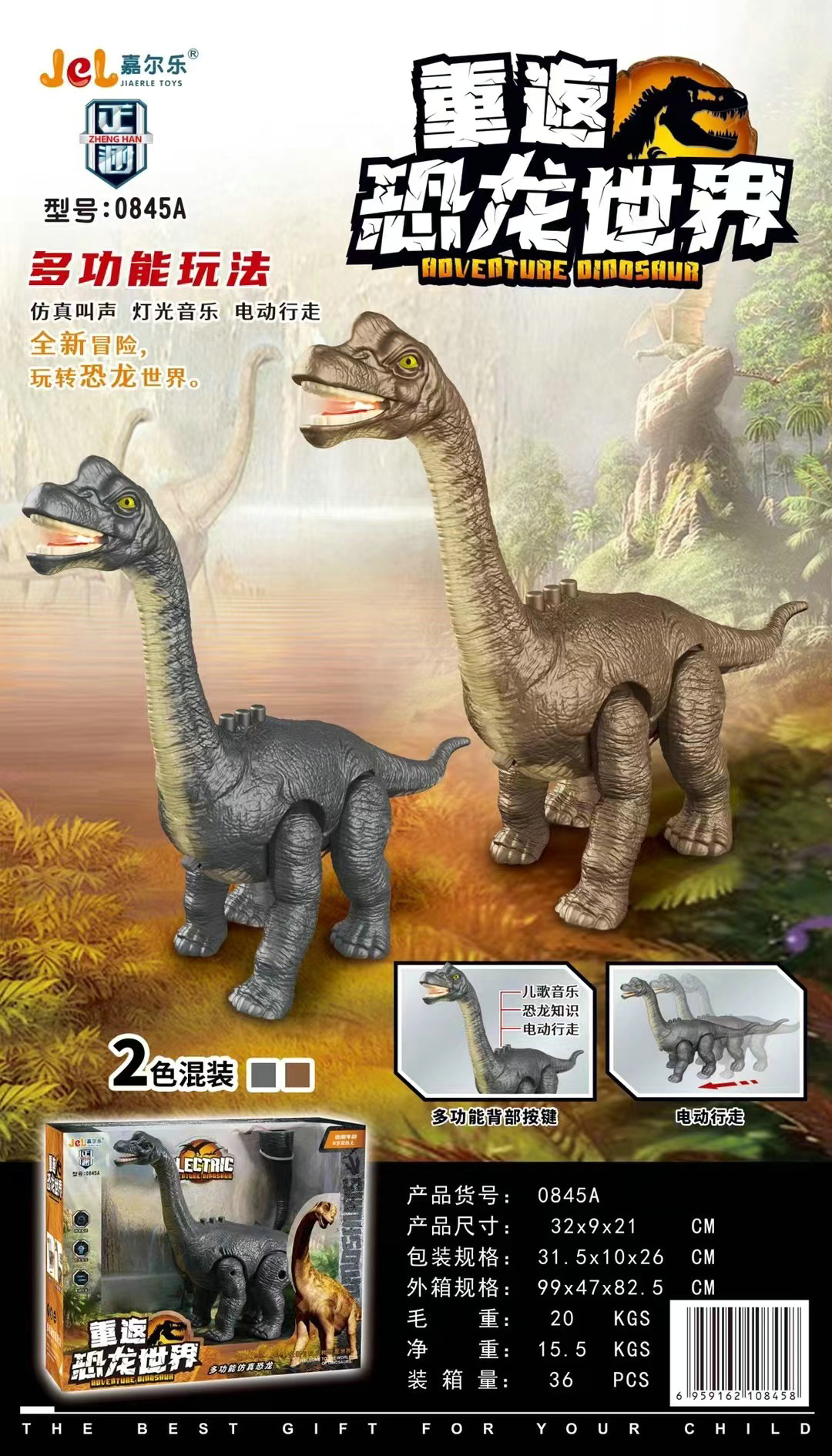전기 걷는 긴 목 용 0845A 걷는 공룡 음악 조명 교육 기관 선물 어린이 장난감 도매