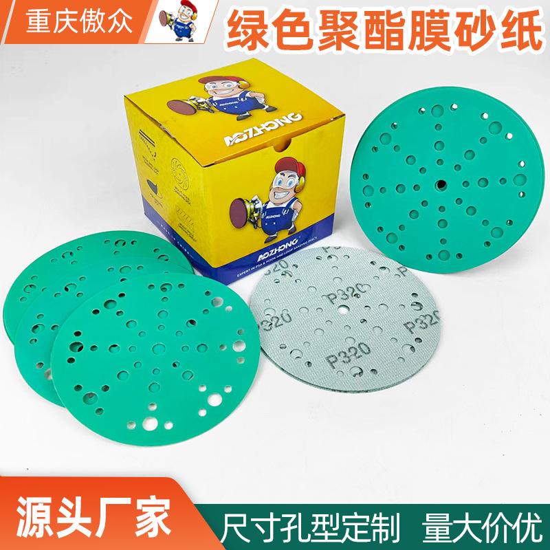 국경을 넘는 녹색 사포 5인치 6홀 자동차 아토믹 그레이 공압식 건식 연마 녹색 폴리에스터 필름 플로킹 사포스토어 가기