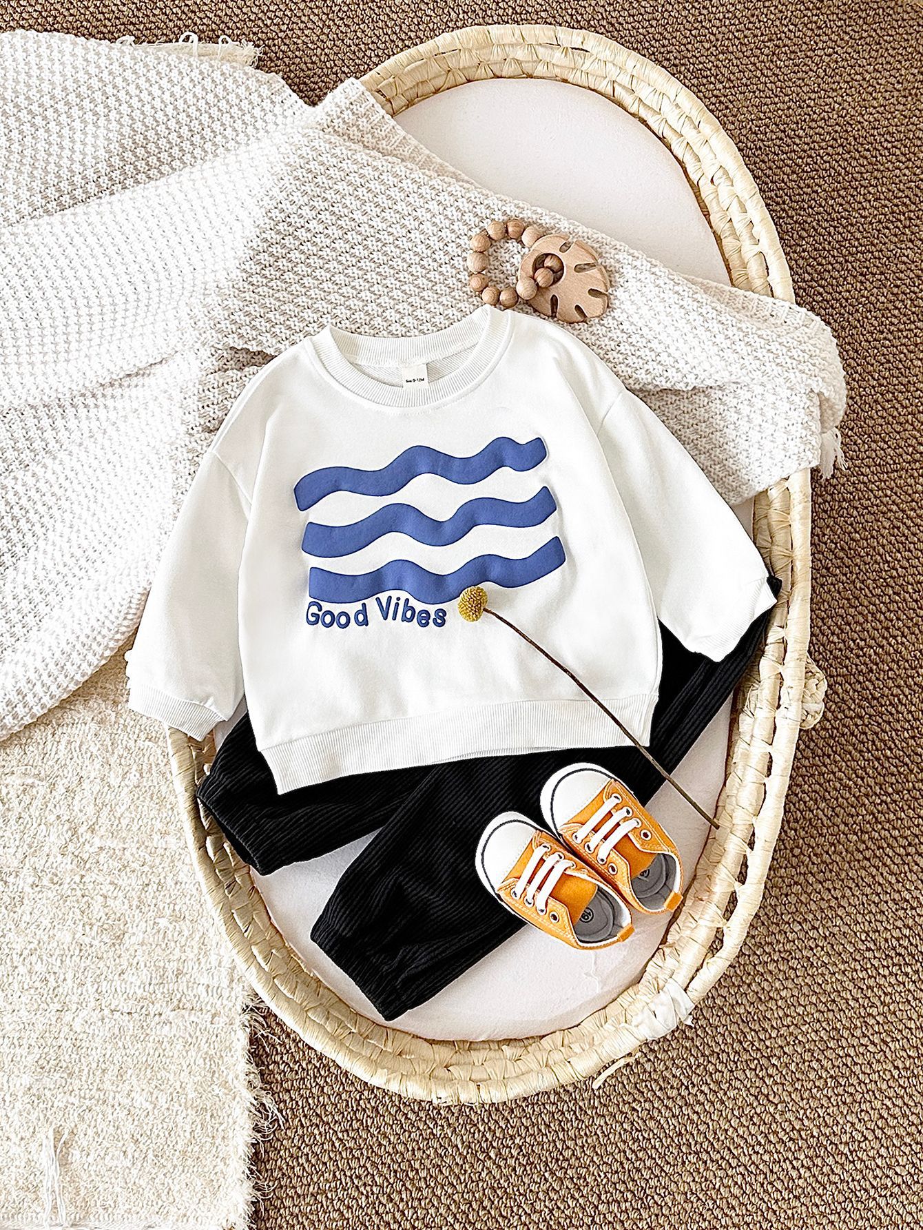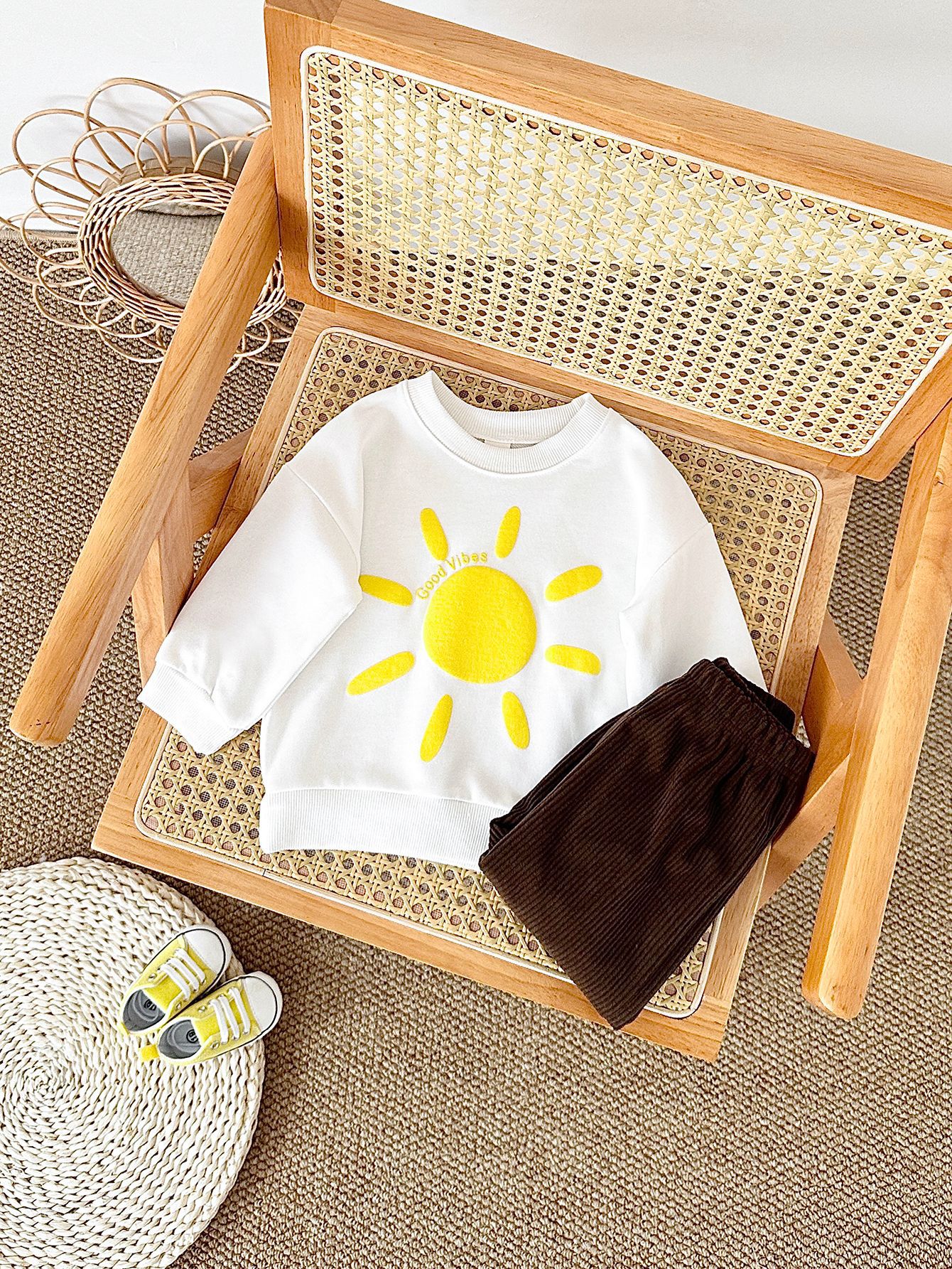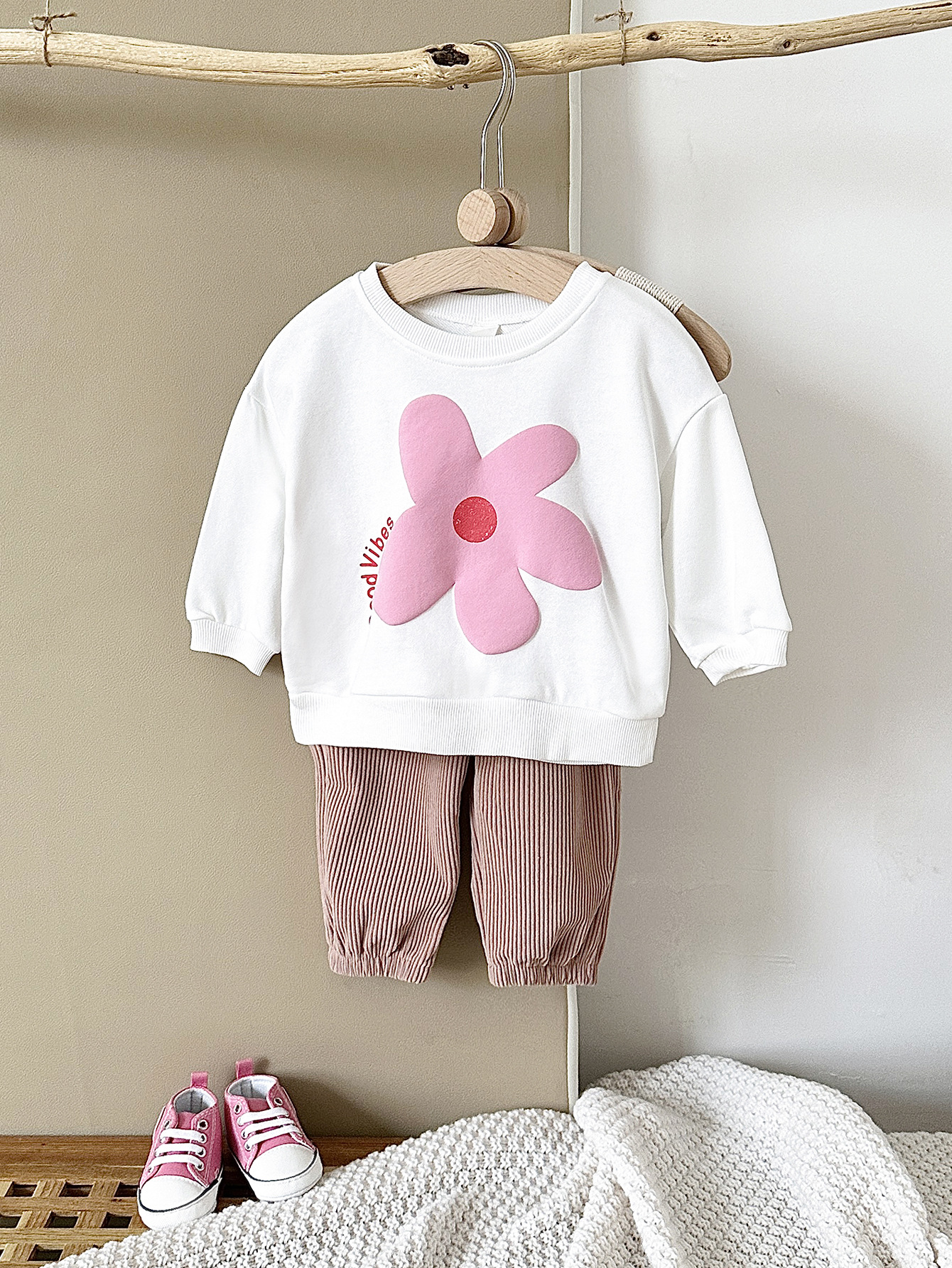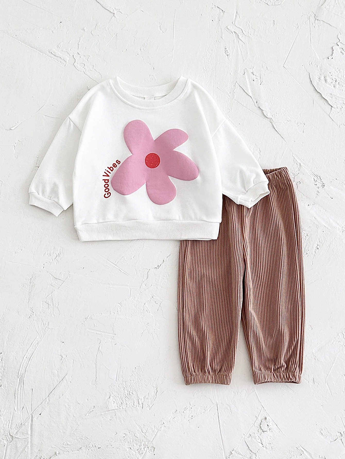 한국식 봄과 가을 어린이 꽃 프린트 스웨트 셔츠 코듀로이 바지 투피스 세트 아기 둥근 목 긴팔 세트 국경스토어 가기