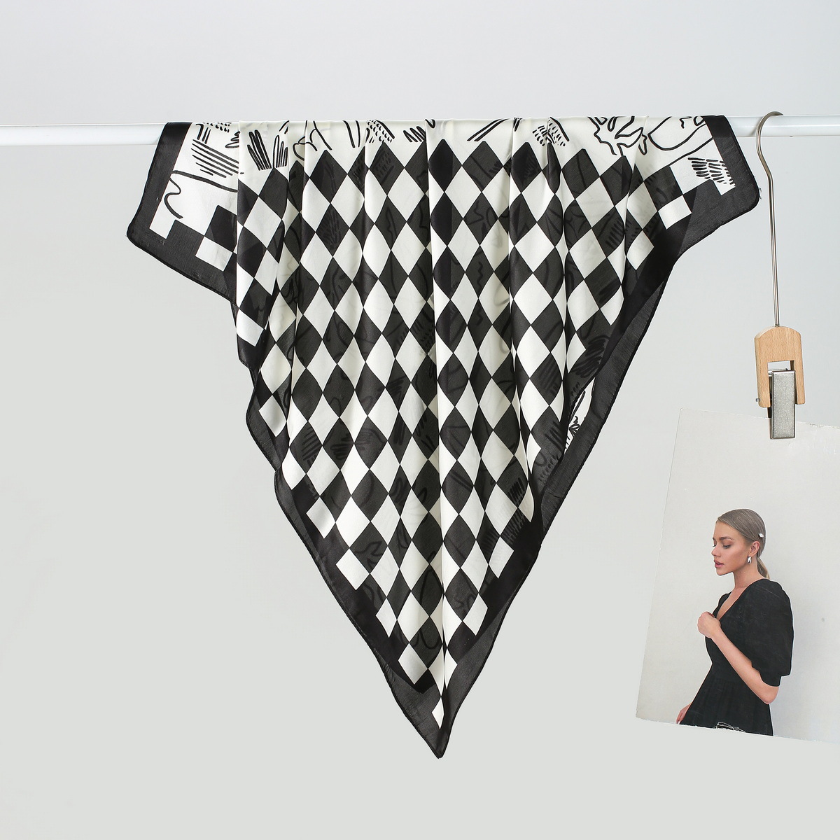 유명 인사 같은 스타일 여성 실크 스카프 흑백 체커 보드 프린트 스카프 Liu Yifei와 같은 스타일