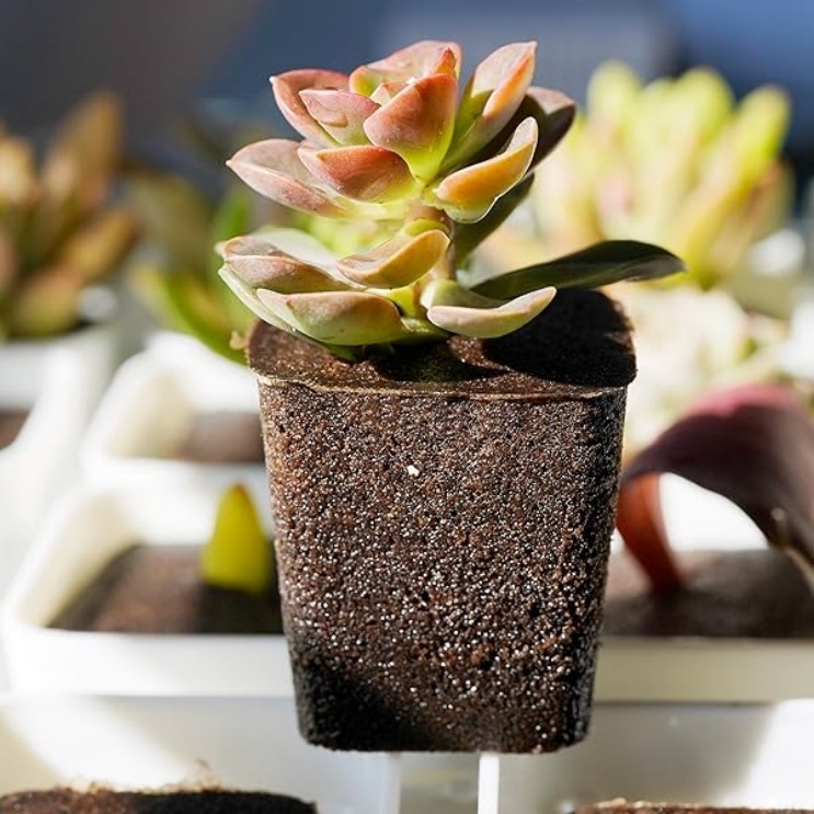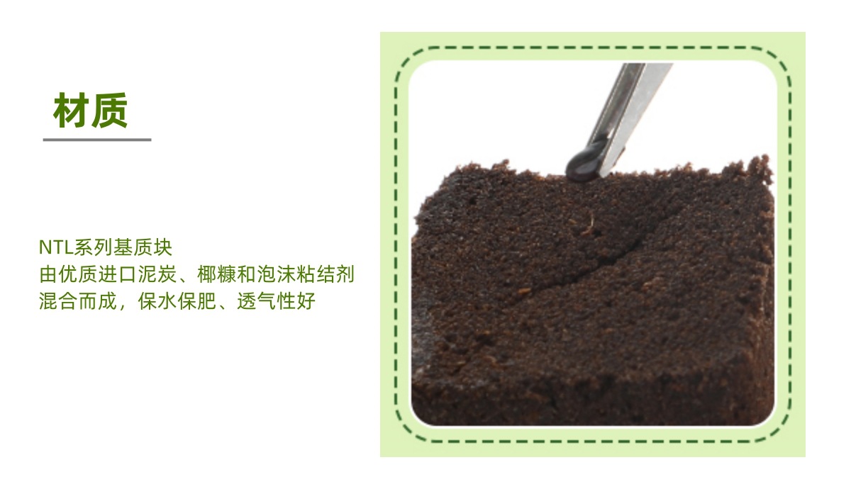 该系列基质块由优质椰糠、泥炭和泡沫粘结剂混合而成,充分含氧量和保水性都特别适用于种苗生根。同样提供了适合播种和插条的插孔,移栽中保护根系并可优化自动化生产。