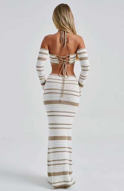 2026년 신상 유럽 및 미국 스타일 여성복 세트, 여름 스트라이프 긴팔 홀터넥 탑과 스커트 투피스 세트스토어 가기