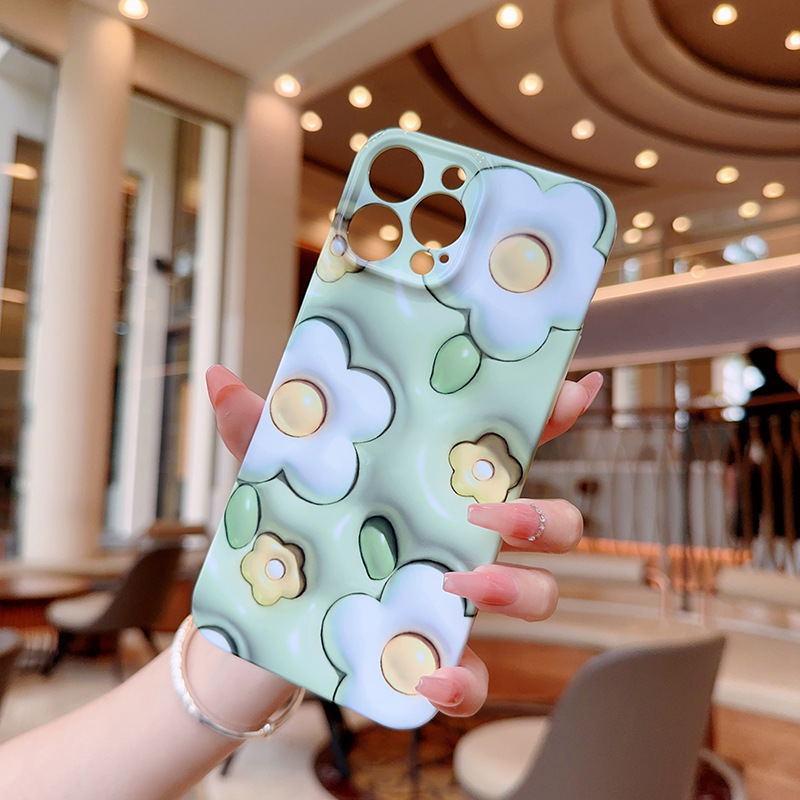 小清新3D绿底白花适用苹果15promax手机壳新款全包手机壳高级感