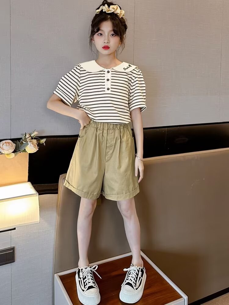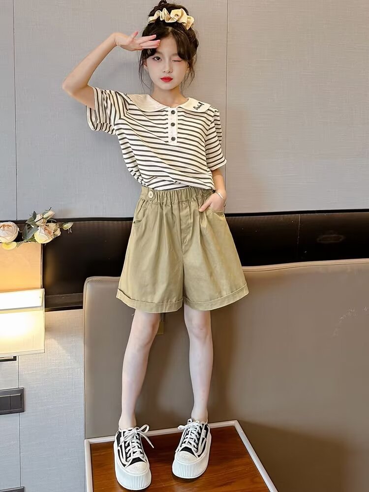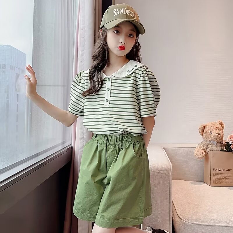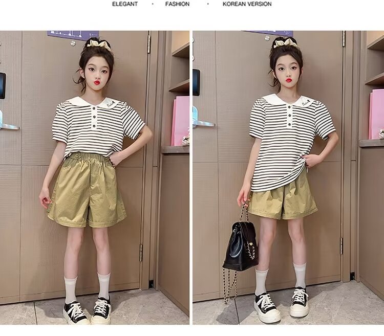 여자 반바지 세트 2024 새로운 어린이 서양식 소녀 여름 착용 반팔 캐주얼 투피스 세트