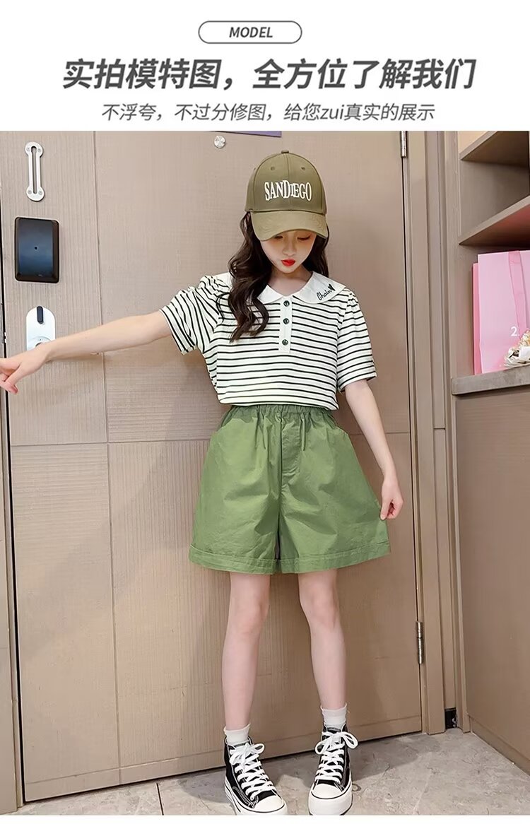 여자 반바지 세트 2024 새로운 어린이 서양식 소녀 여름 착용 반팔 캐주얼 투피스 세트스토어 가기