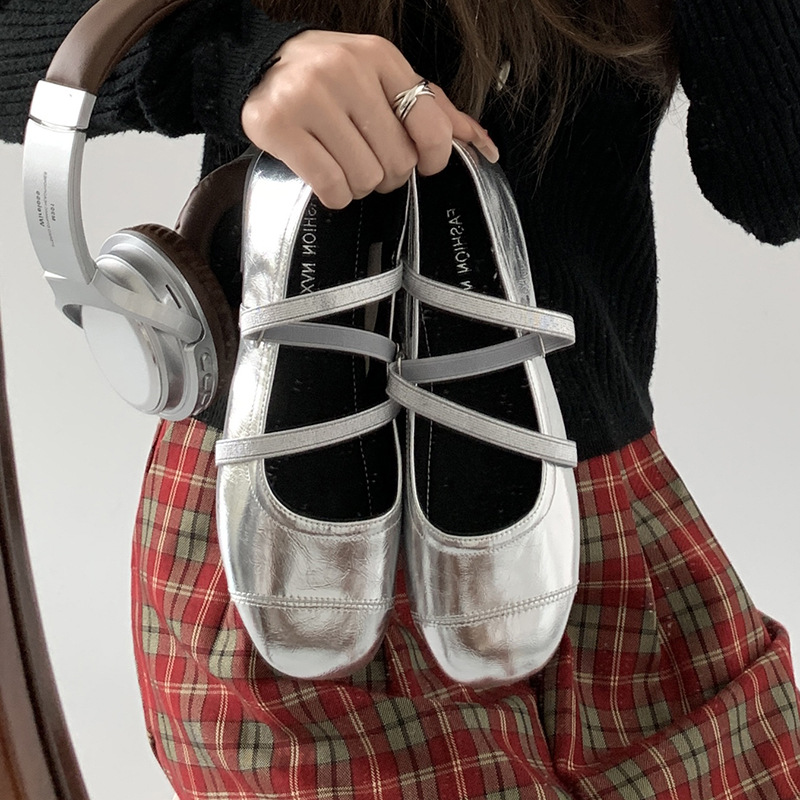 실버 라운드 토 레트로 프렌치 얕은 플랫 슈즈 여성 2024 년 새 여름 소프트 하단 발레 메리 제인 여성 신발스토어 가기