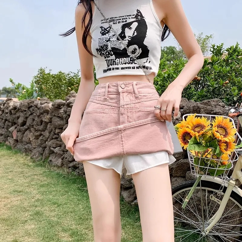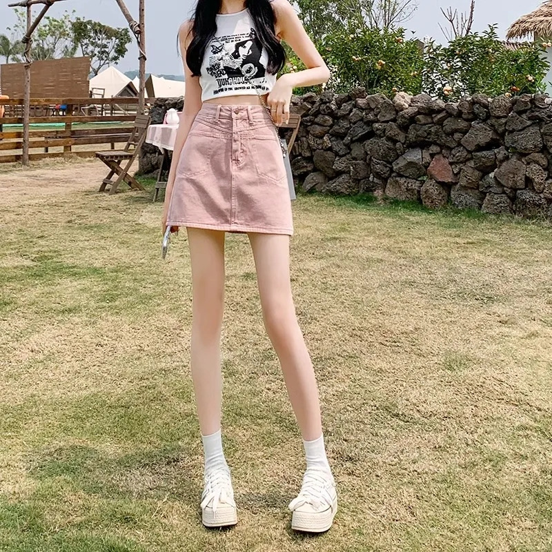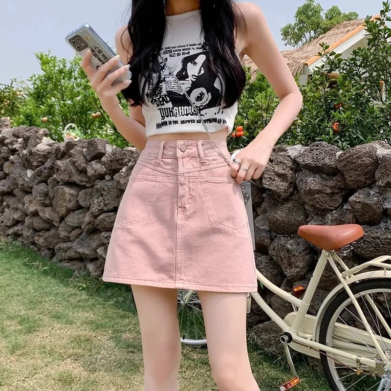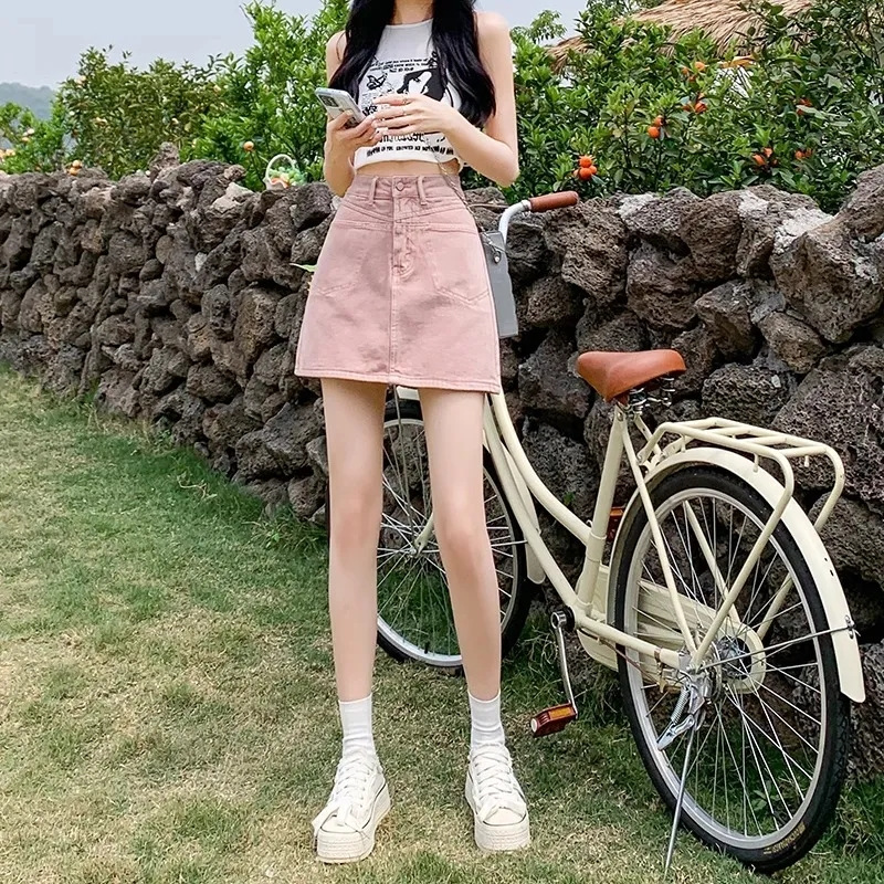 핑크 하이 스트리트 데님 치마 여자 2024 여름 새 스타일 뜨거운 소녀 높은 허리 엉덩이 커버 슬리밍 눈부심 A 라인 스커트 트렌디스토어 가기