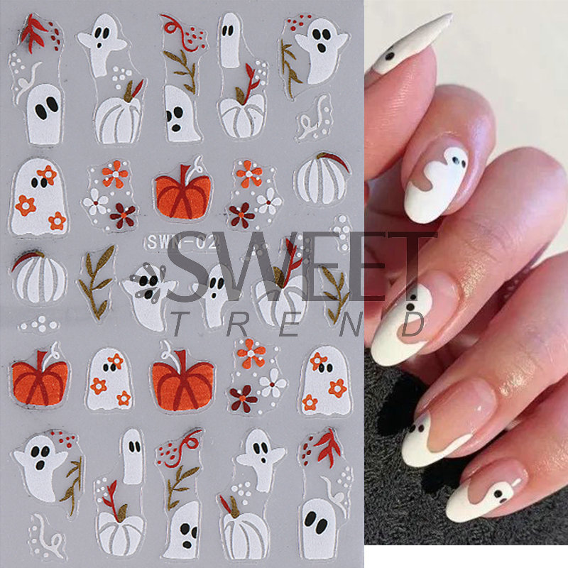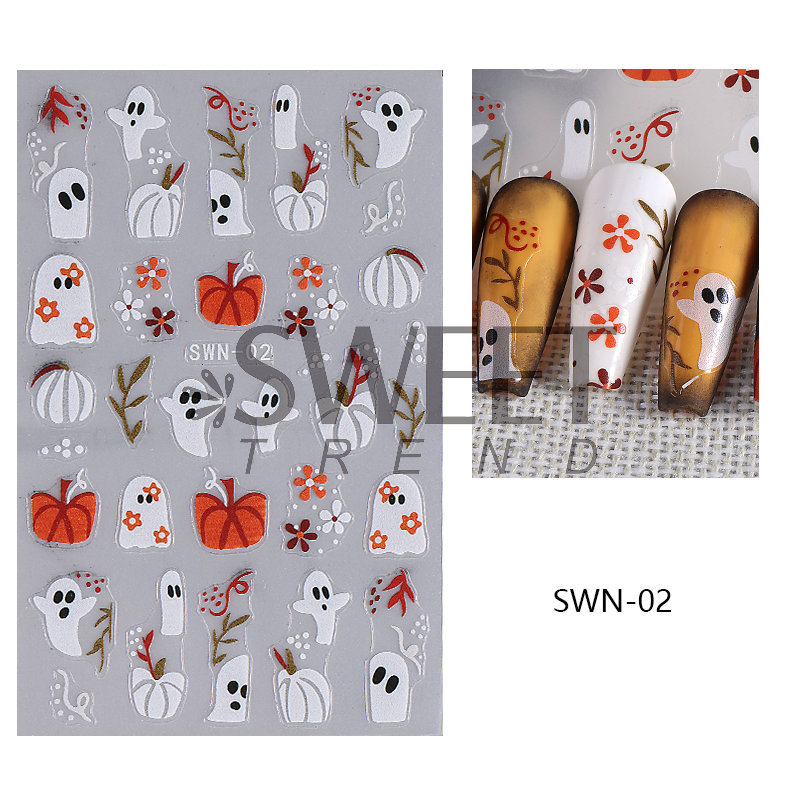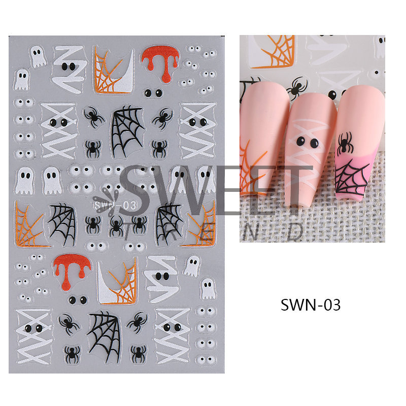 국경 간 새로운 할로윈 네일 아트 스티커 Ins 만화 유령 호박 거미 눈 엠보싱 네일 백 접착 스티커