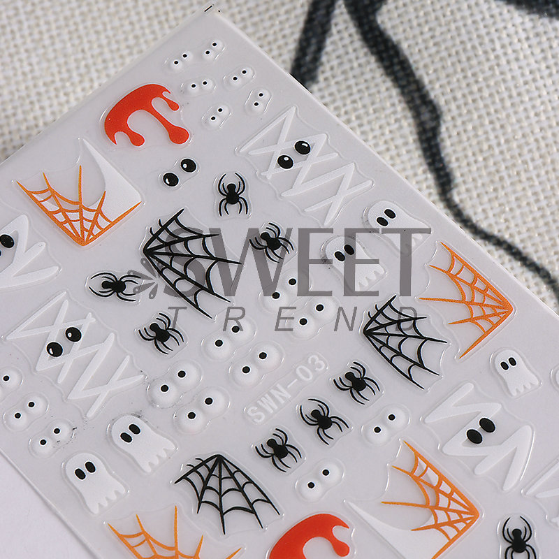 국경 간 새로운 할로윈 네일 아트 스티커 Ins 만화 유령 호박 거미 눈 엠보싱 네일 백 접착 스티커스토어 가기