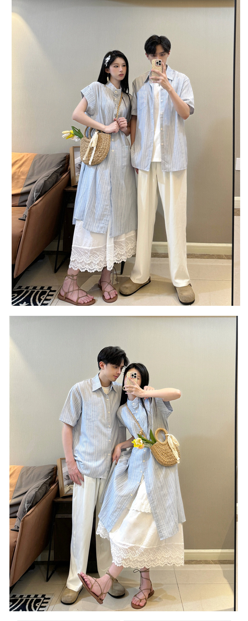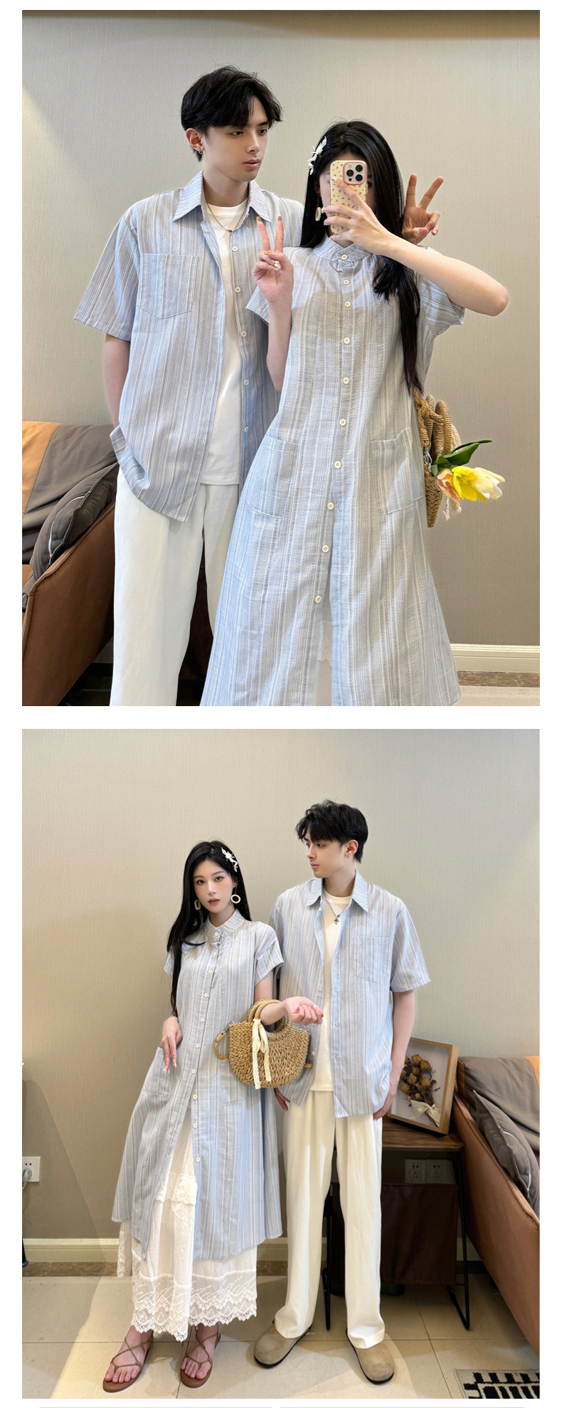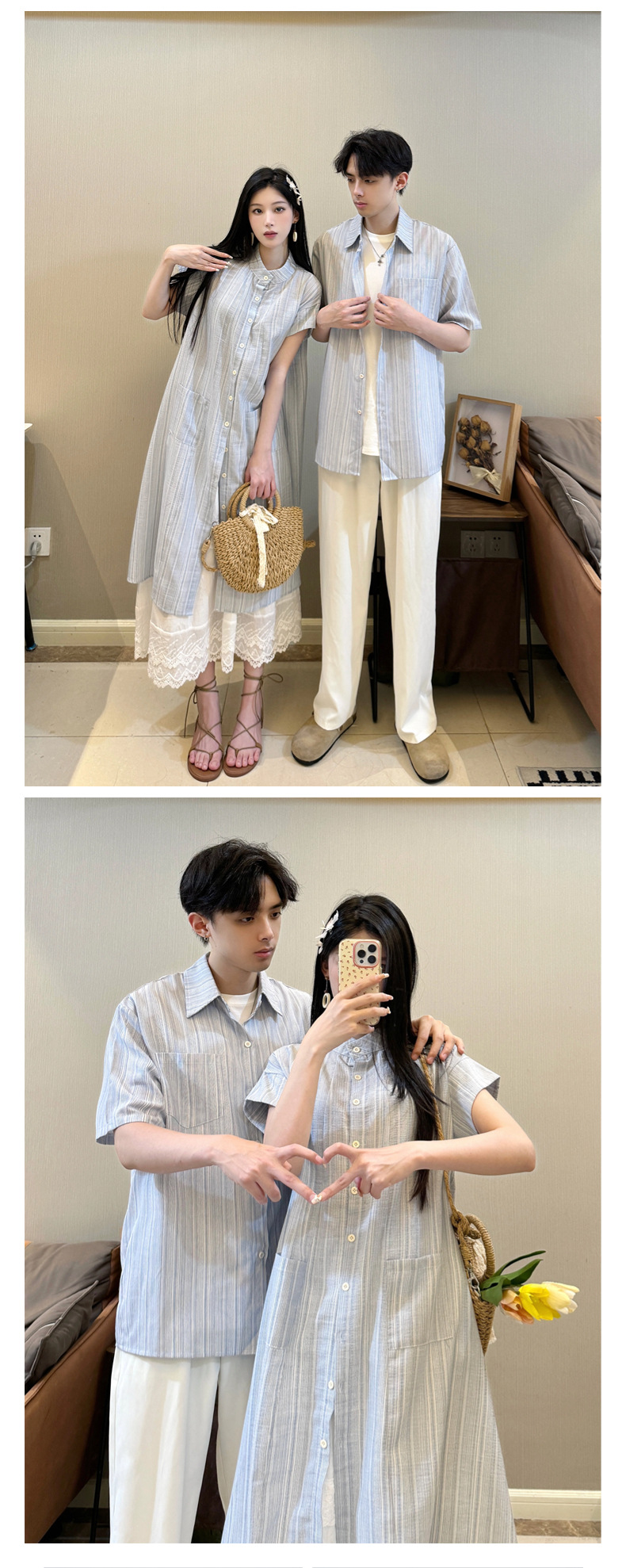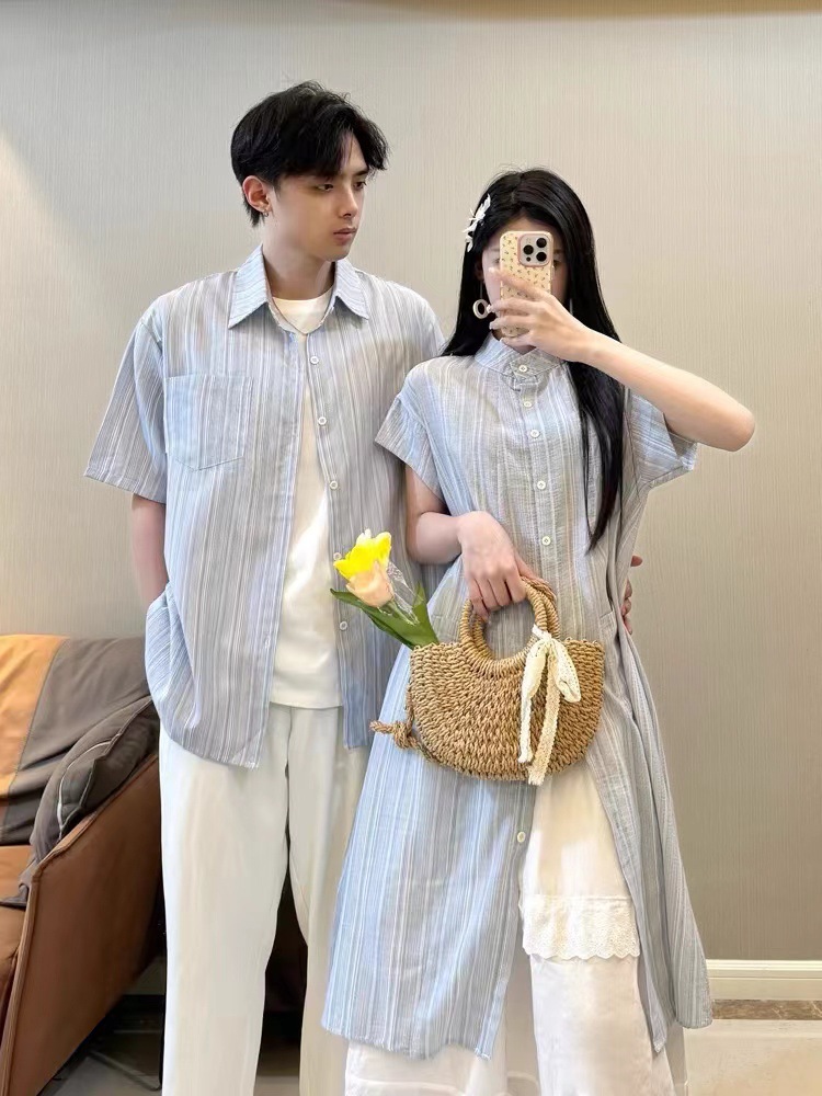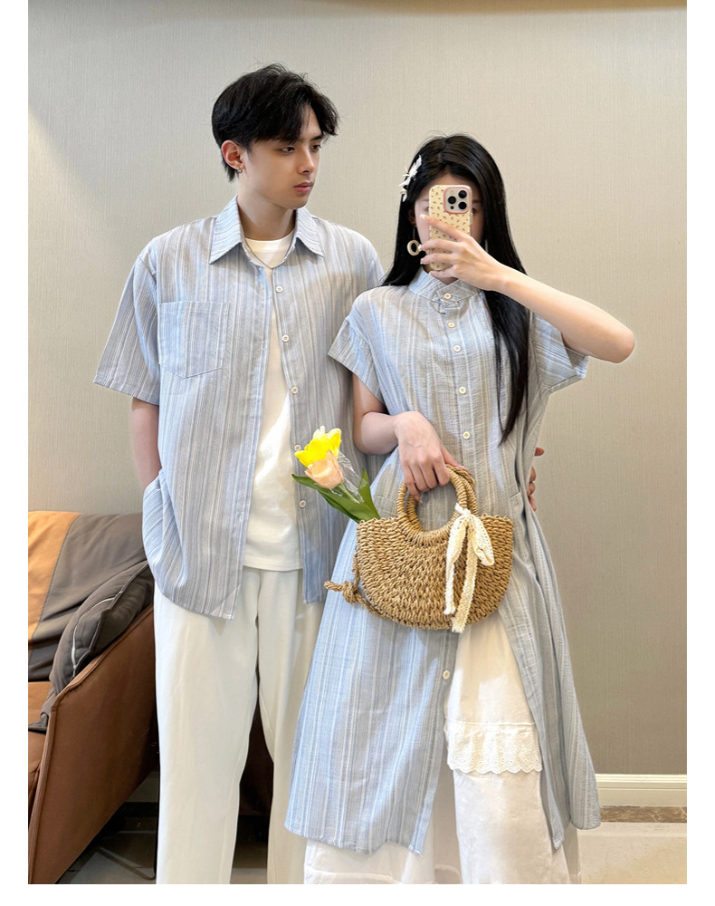 커플 의류 여름 1 원피스 1 스커트 줄무늬 남자 짧은 소매 셔츠 여자의 긴 셔츠스토어 가기