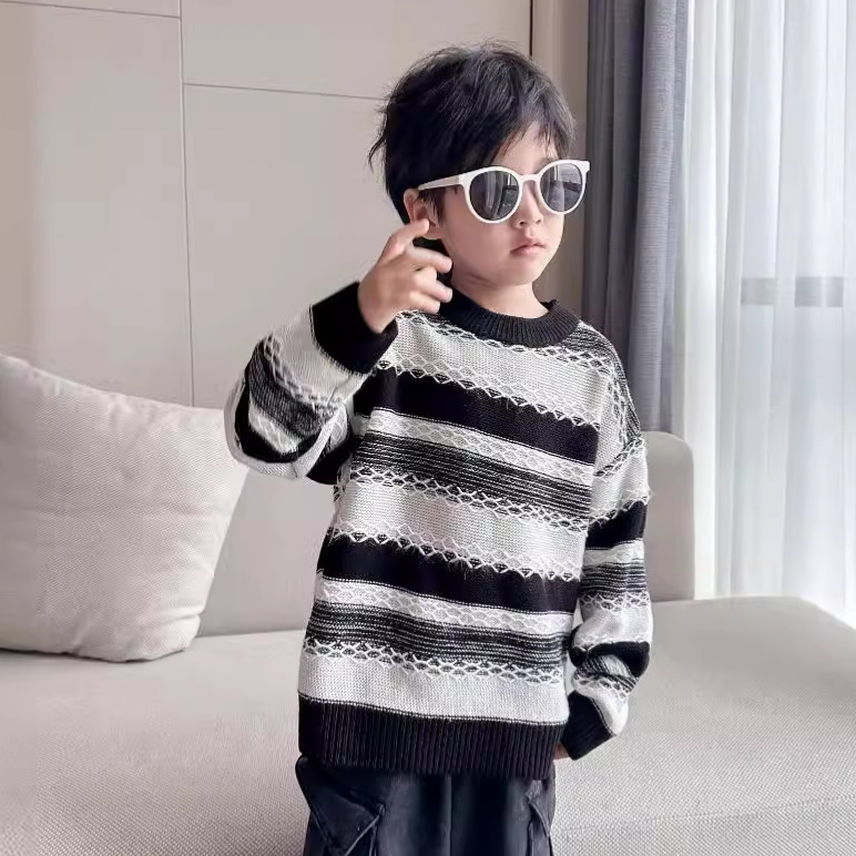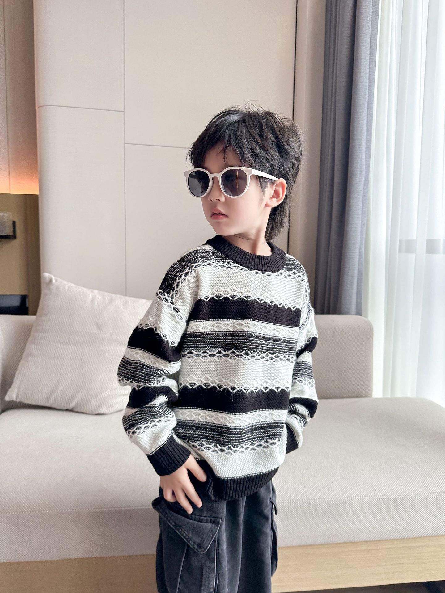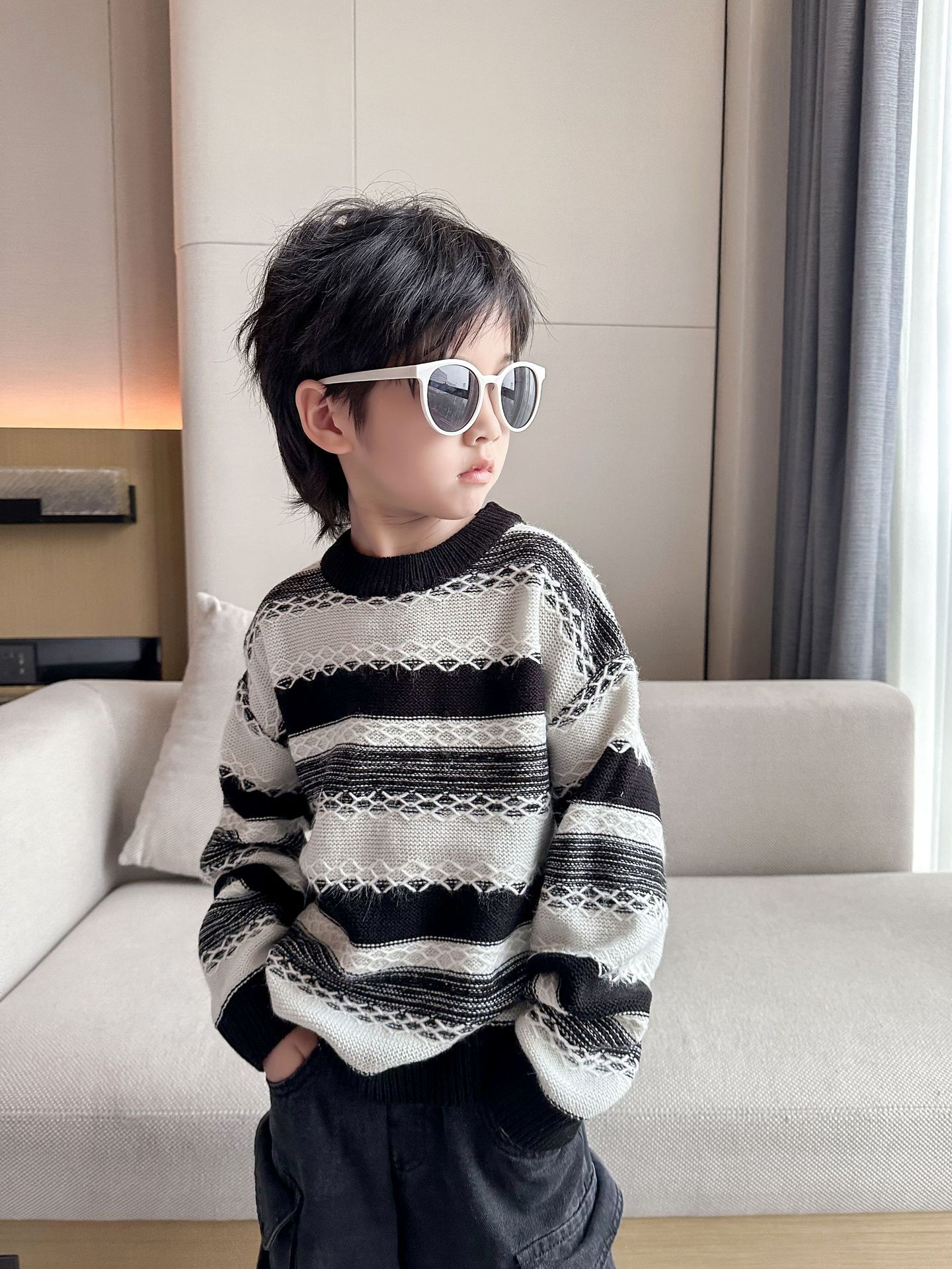 남학생 스웨터 스트라이프 어린이 솔리드 컬러 니트 풀오버 2024 겨울 새 잘 생긴 어린이 아우터 탑