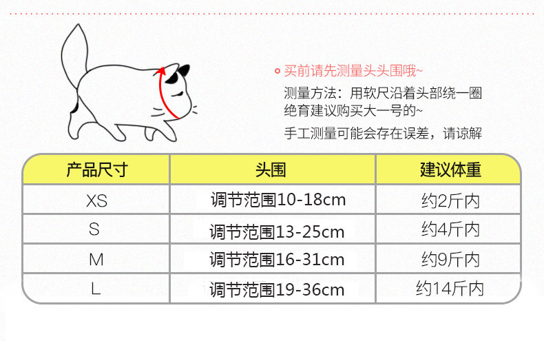• XS: 머리 둘레 10-18cm (고양이 2 월 주위에 적합
