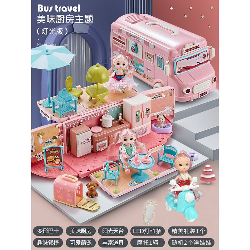 • [조명 버전] 맛있는 주방 오토바이 테마 - 아기 2명, 오토바이 1대 + 공주 2명 + LED + 절묘한 선물 가방 + 강아지 2마리(컬러 박스 + 전자 상거래 상자)