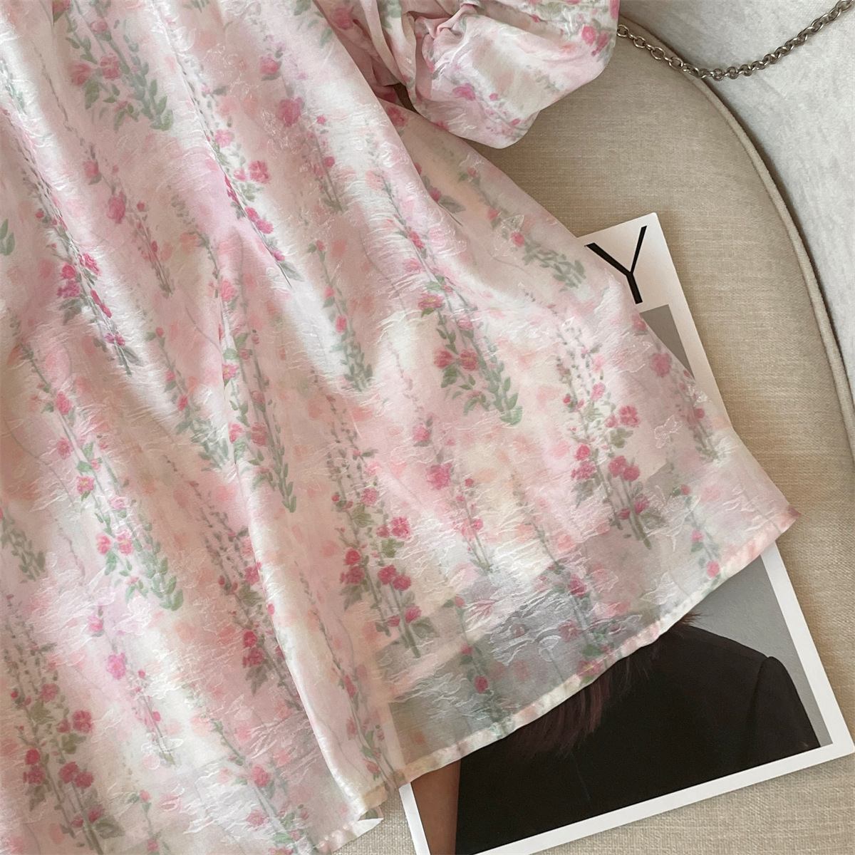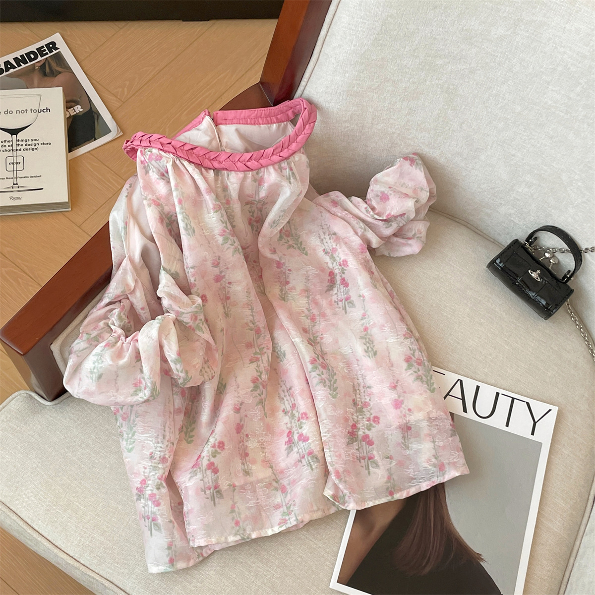 리얼 샷 고급 사교계 스타일 오프 숄더 핑크 쉬폰 셔츠 여자 여름 새 짠 라운드 넥 소프트 왁스 반소매 탑스토어 가기