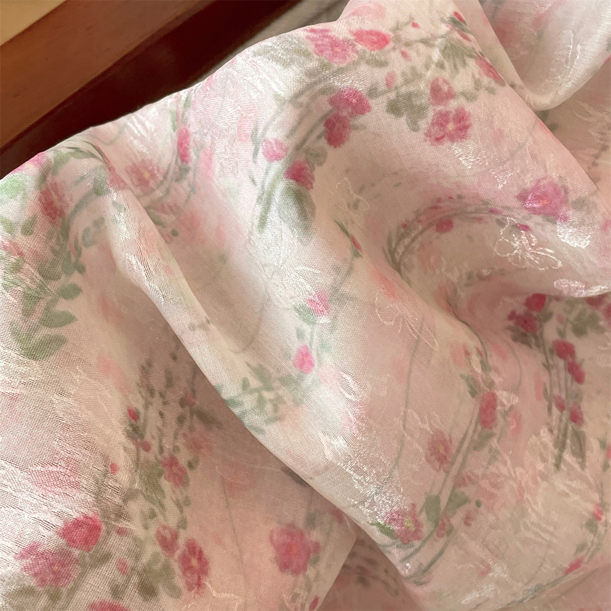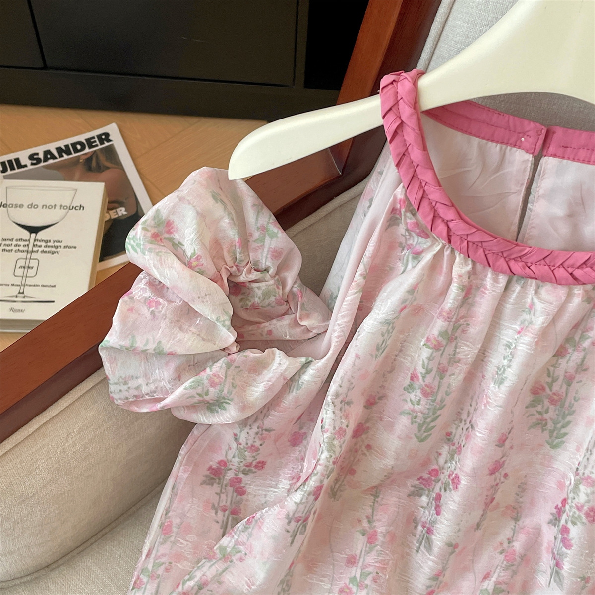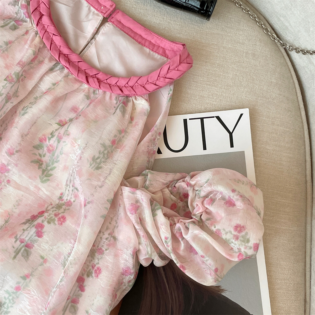 리얼 샷 고급 사교계 스타일 오프 숄더 핑크 쉬폰 셔츠 여자 여름 새 짠 라운드 넥 소프트 왁스 반소매 탑