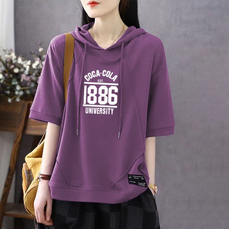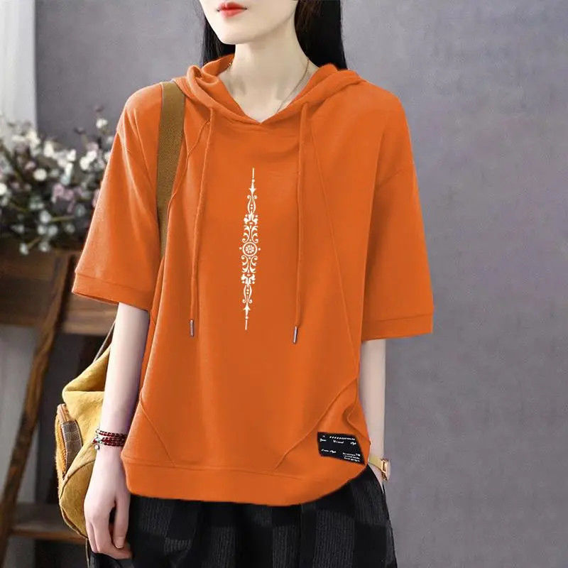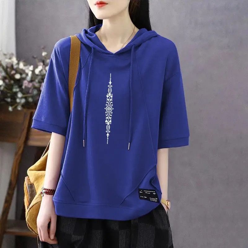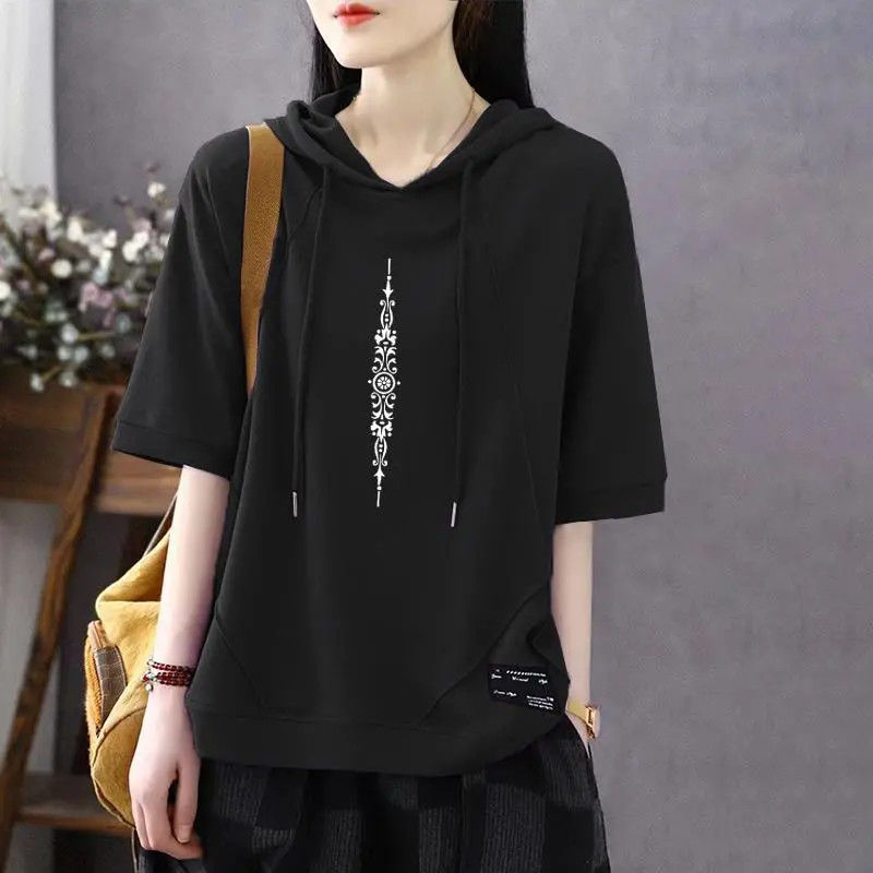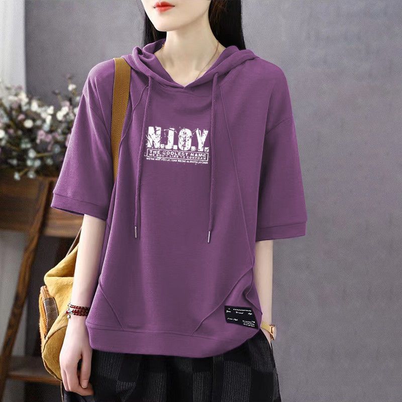 100% 면 새로운 여름 뚱뚱한 소녀 후드 반팔 셔츠 여성의 플러스 사이즈 느슨한 예술적 캐주얼 지방 탑