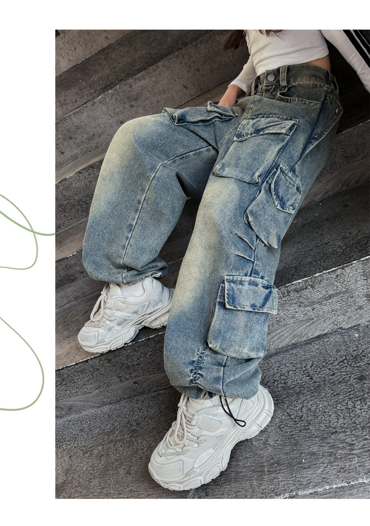 소녀 작업 청바지 2024 봄 새로운 큰 포켓 작업 바지 조수 시원한 튀긴 거리 힙합 공연 옷스토어 가기