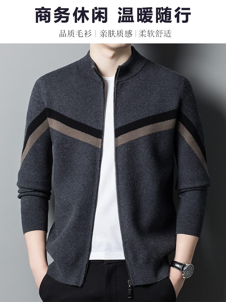젊은 남성 하이 엔드 봄과 가을 새로운 스타일 수직 칼라 스트라이프 컬러 매칭 지퍼 캐주얼 루즈 심플 니트 긴팔 유행스토어 가기