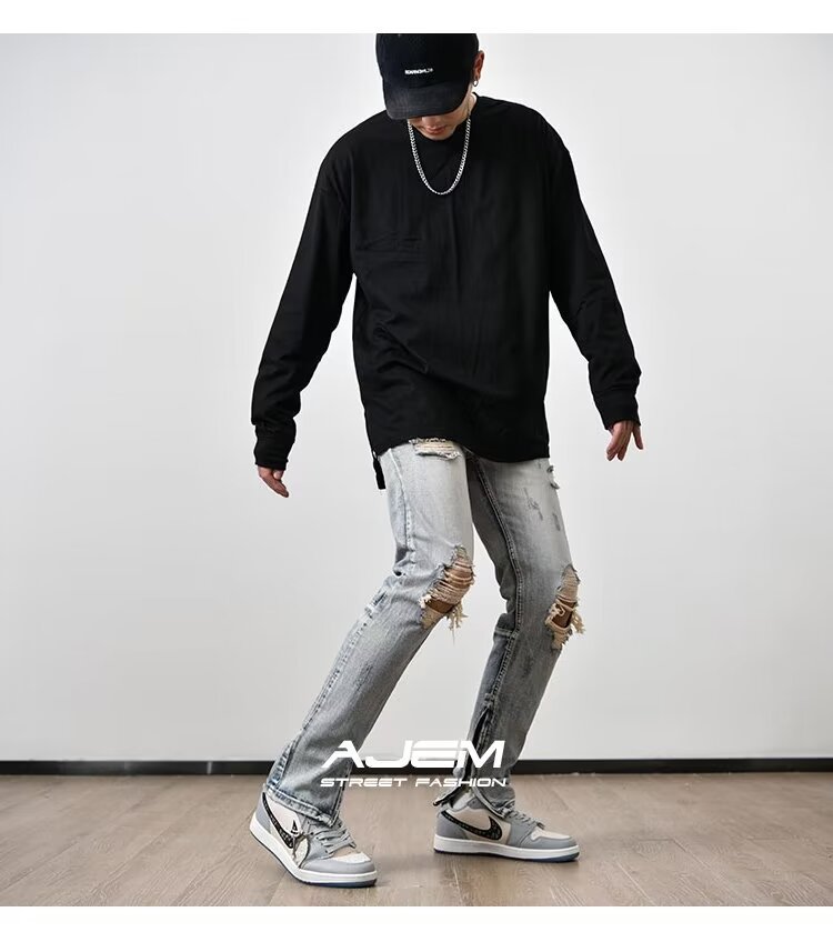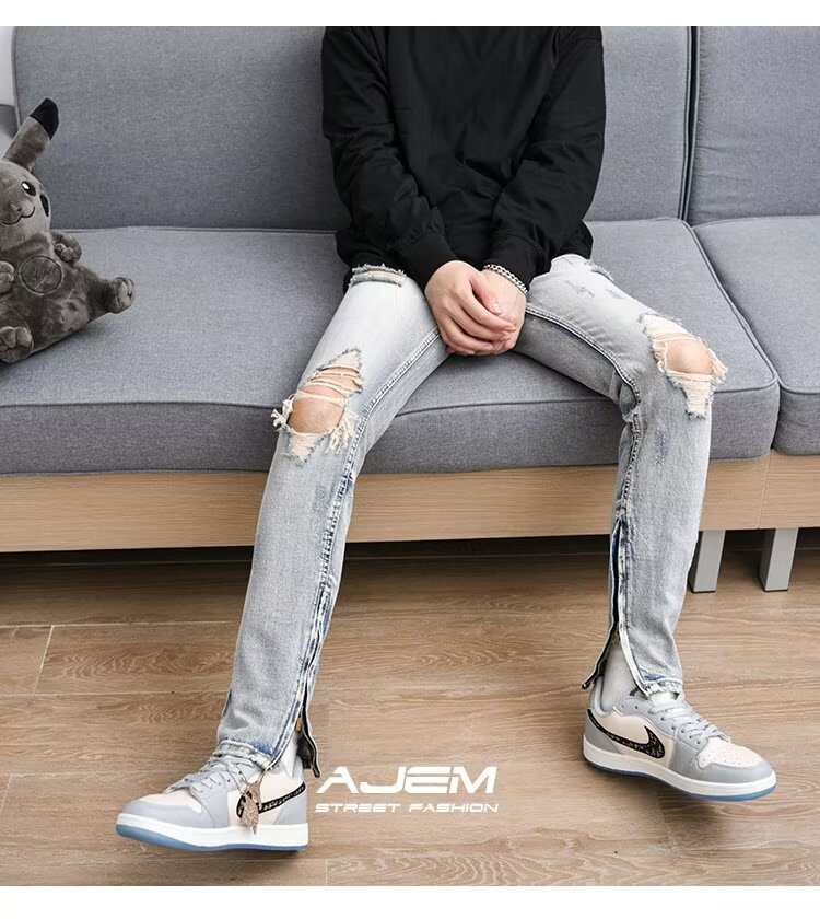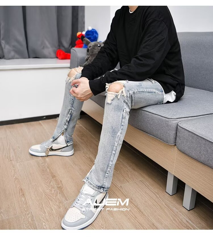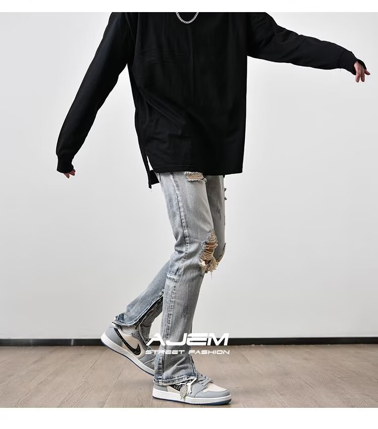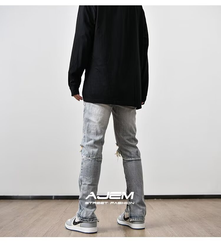 레트로 블루 리핑 아메리칸 청바지 남성용 얇은 클린 핏 바지 하이 스트리트 바이브 새그 바지스토어 가기