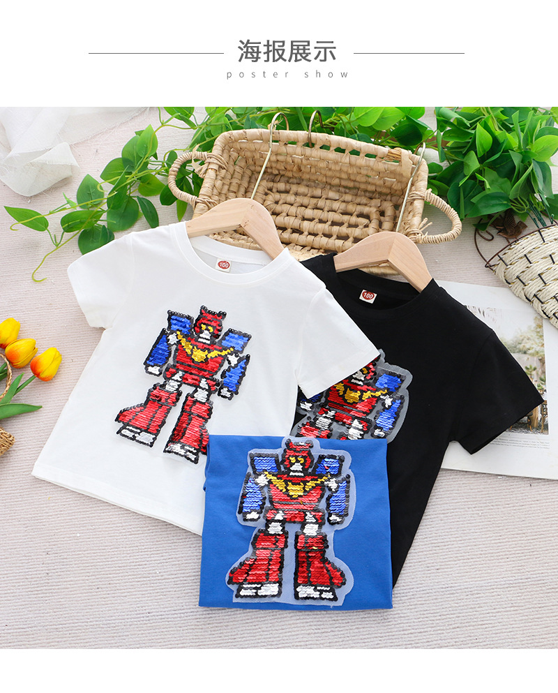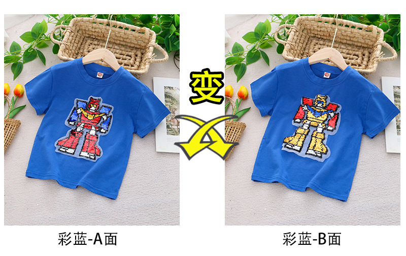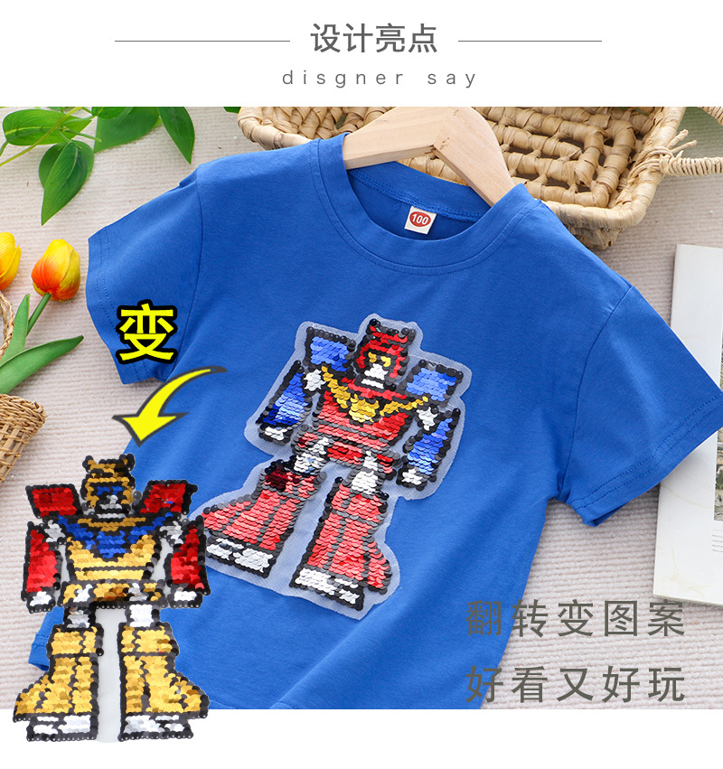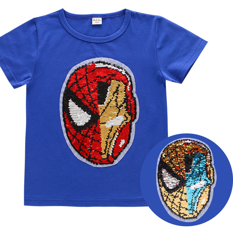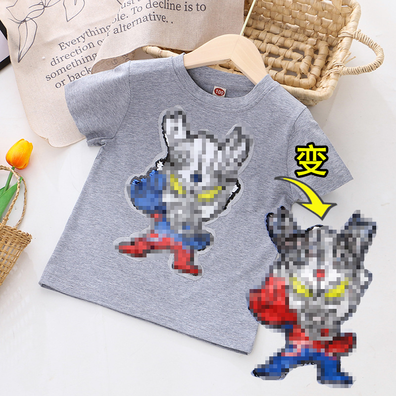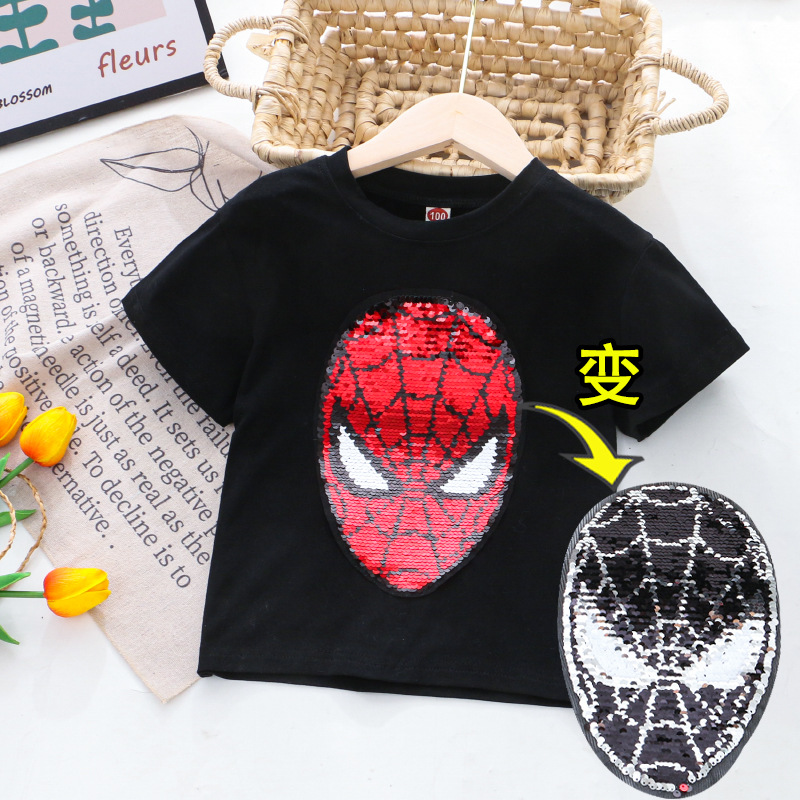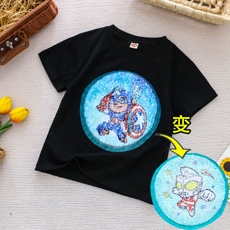 25 어린이 여름 아동복 소년 짧은 소매 티셔츠 색상 변경 스팽글 슈퍼맨 영웅 옷 해외 무역 머리카락 세대