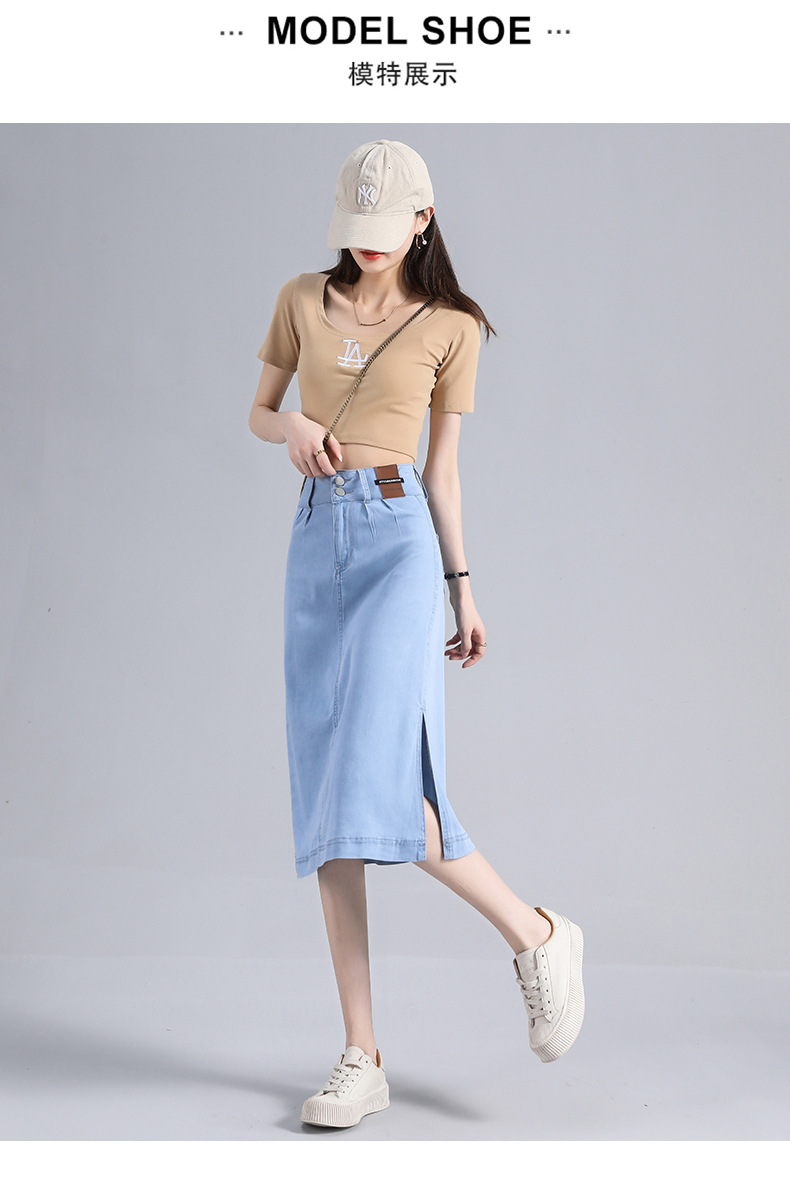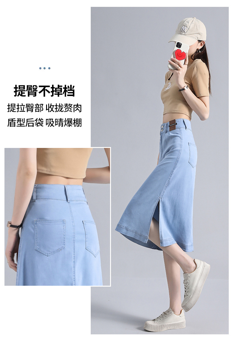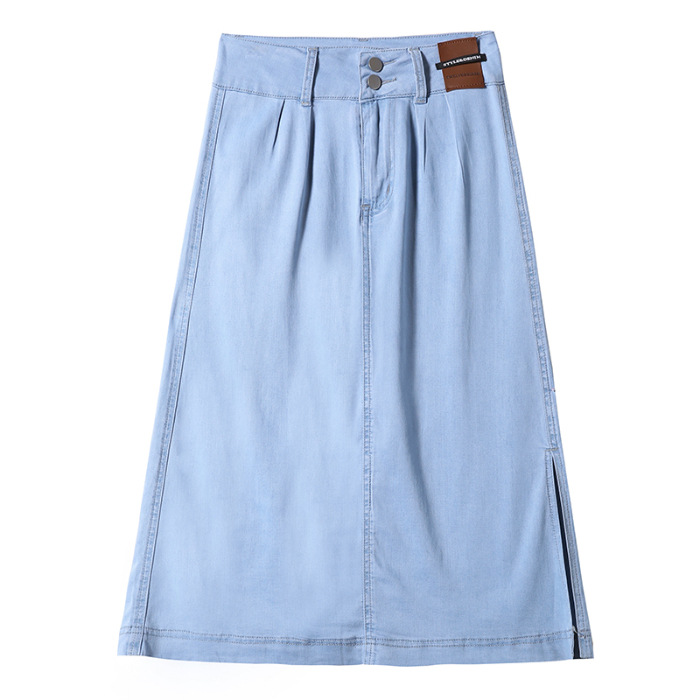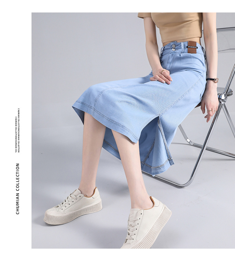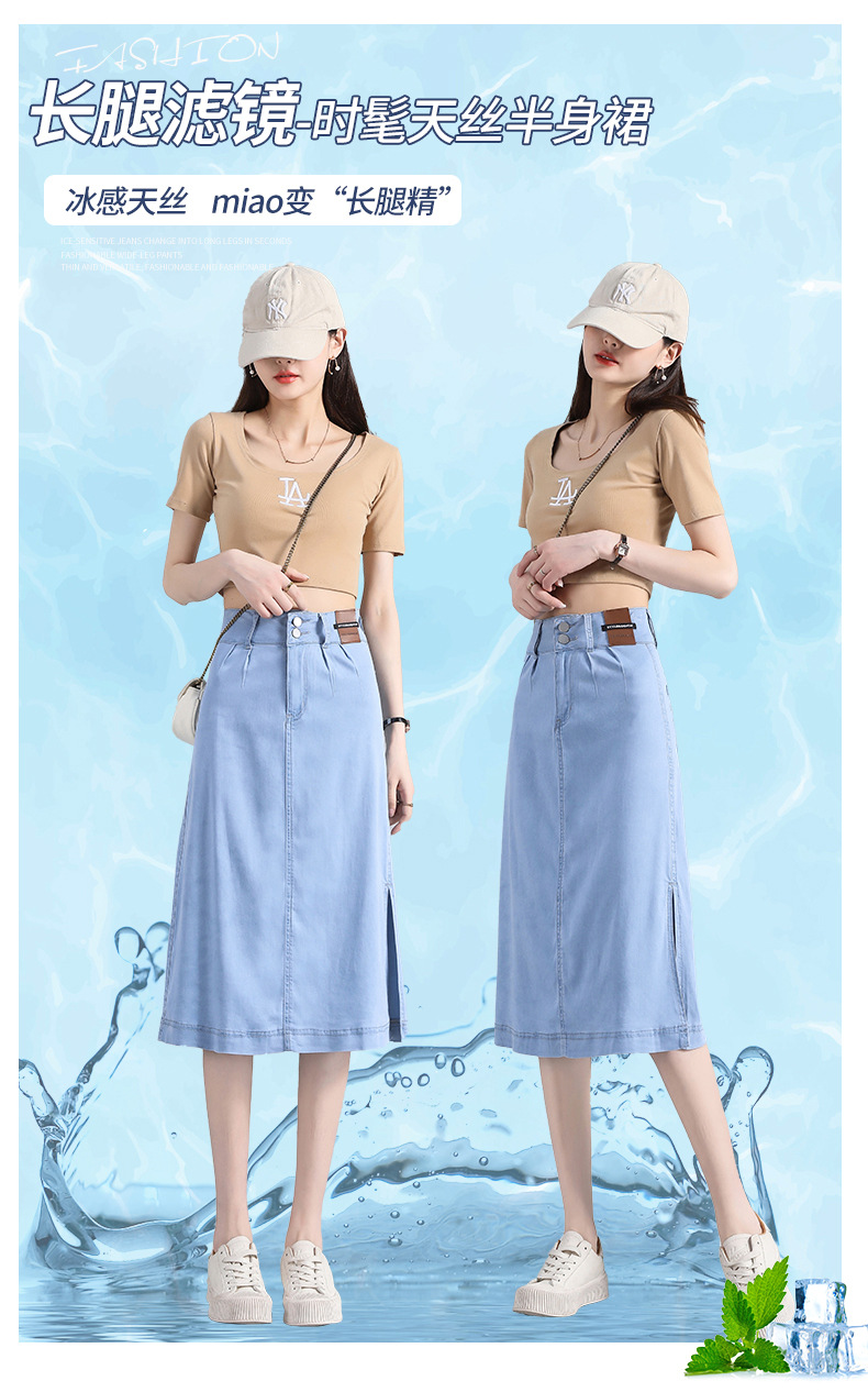 라이트 블루 높은 웨이스트 텐셀 데님 스커트 여자 2024 년 여름 새로운 도착 사이드 스플릿 패션 올 매치 통기성 스커트스토어 가기