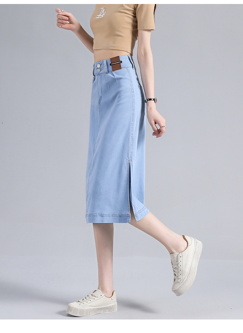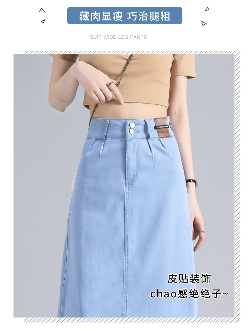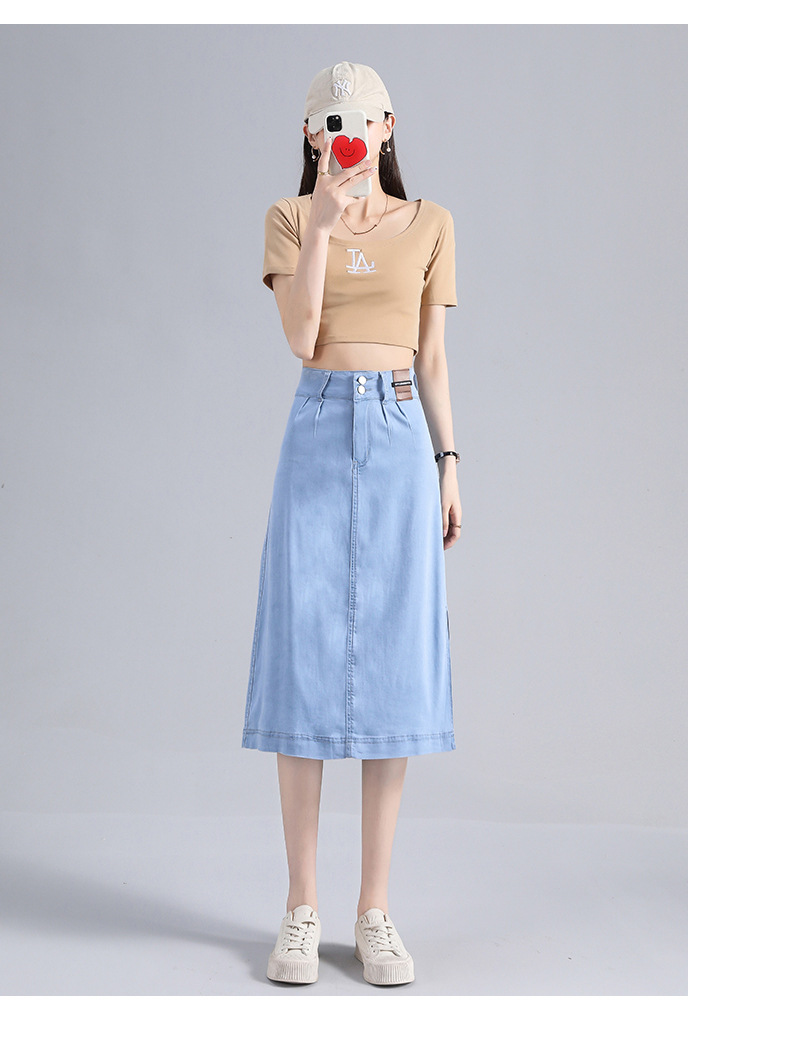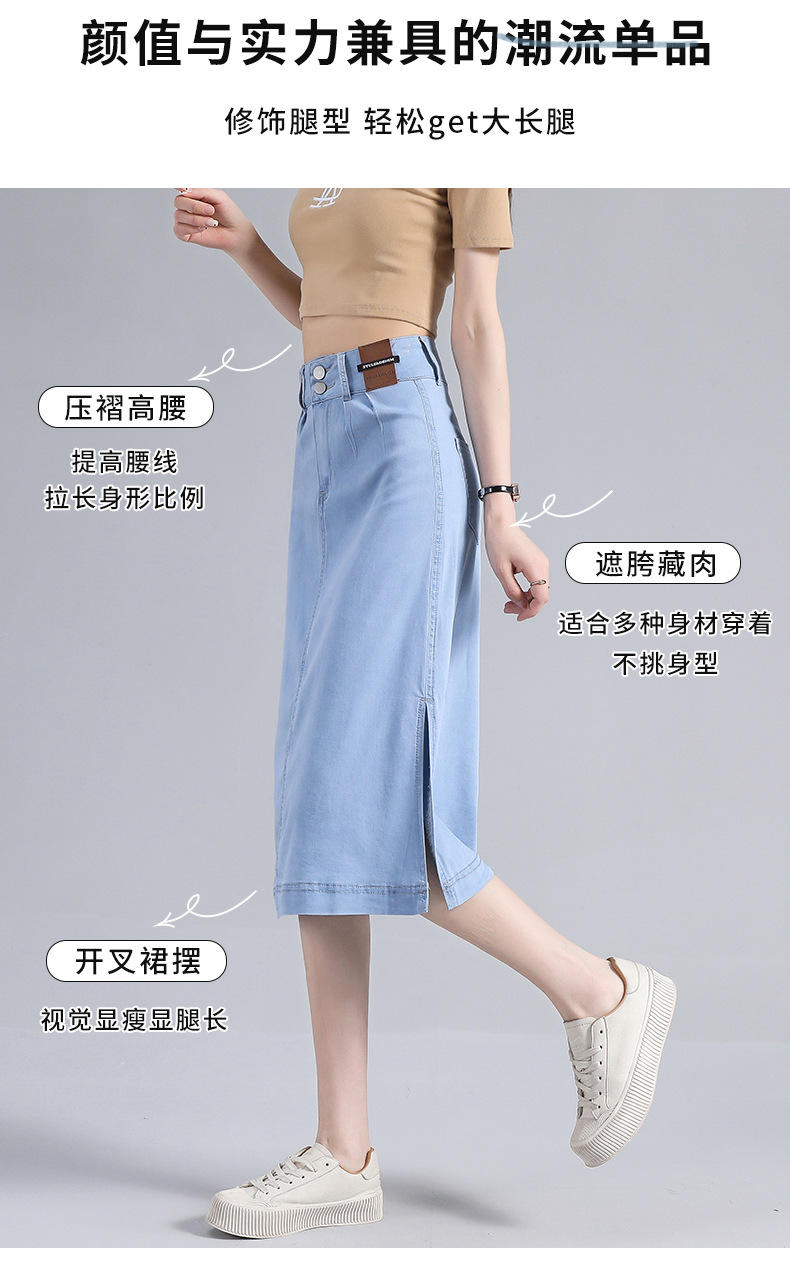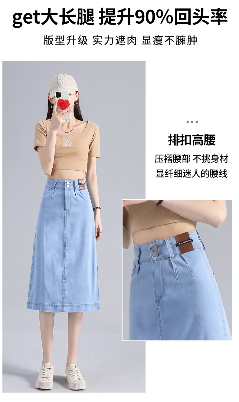 라이트 블루 높은 웨이스트 텐셀 데님 스커트 여자 2024 년 여름 새로운 도착 사이드 스플릿 패션 올 매치 통기성 스커트스토어 가기