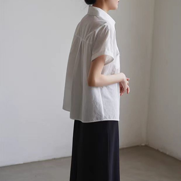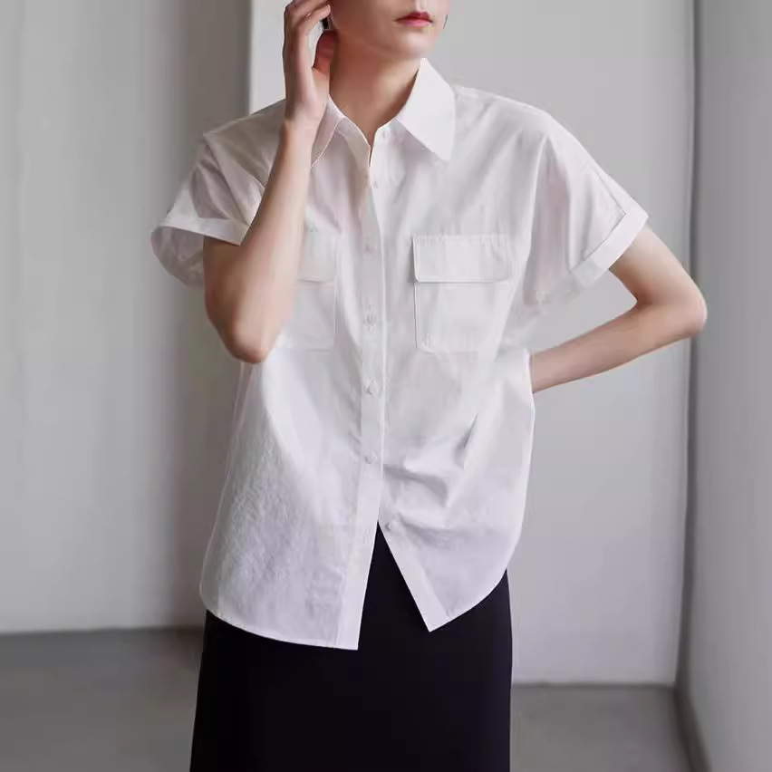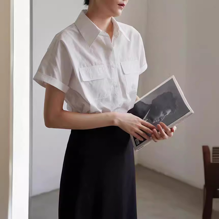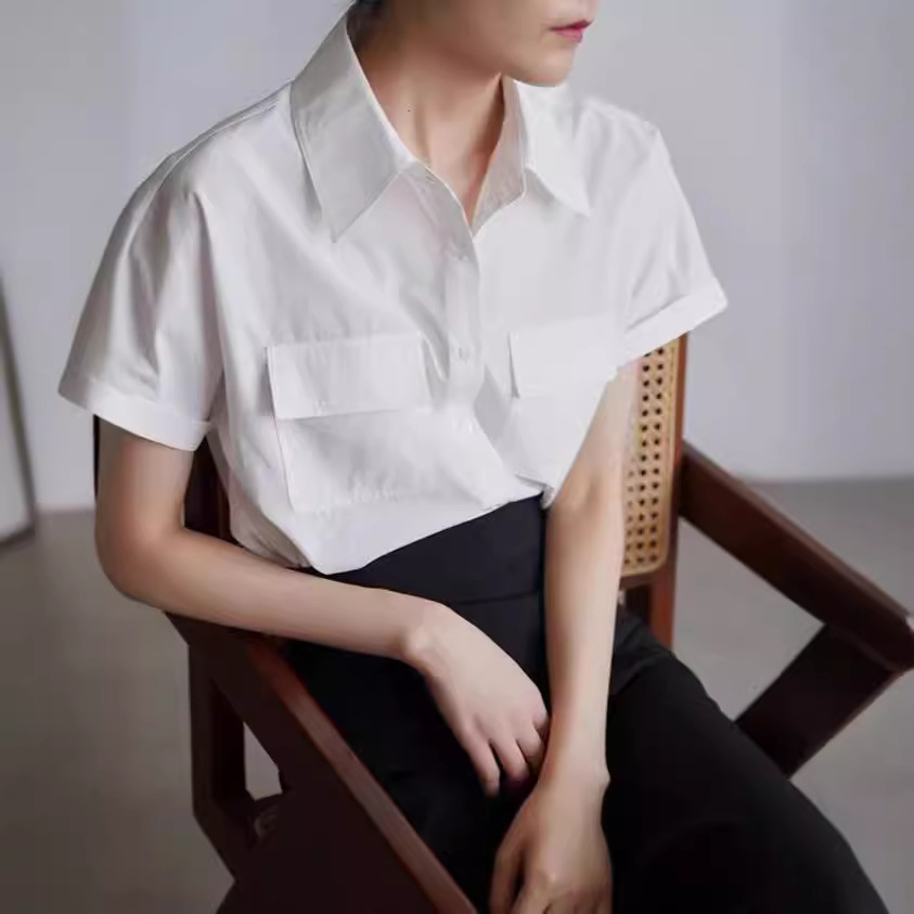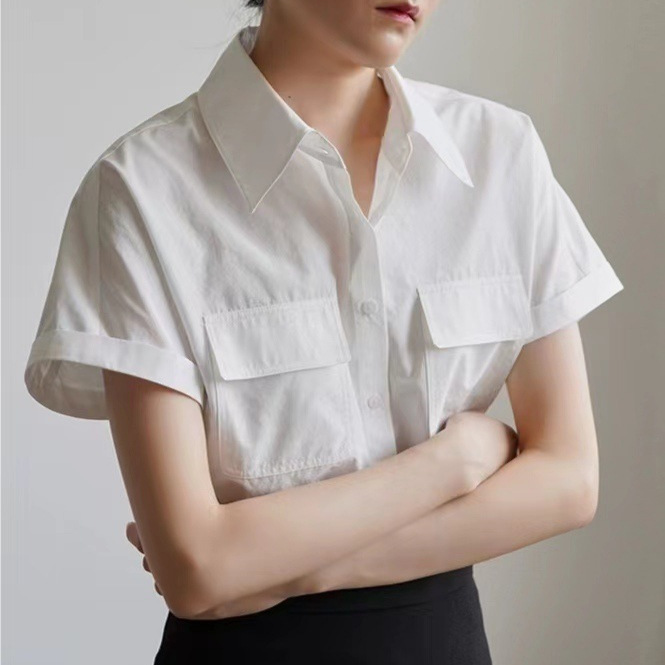 캐주얼 일본식 세련된 더블 포켓 반팔 단색 셔츠 여성용 여름 새 스타일 캐주얼 툴링 디자인 틈새