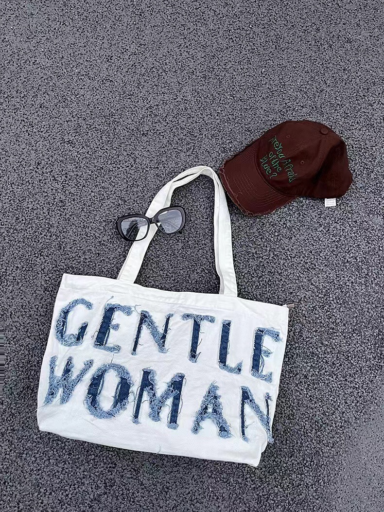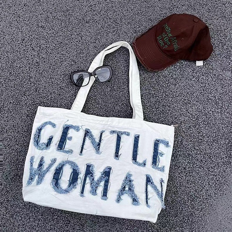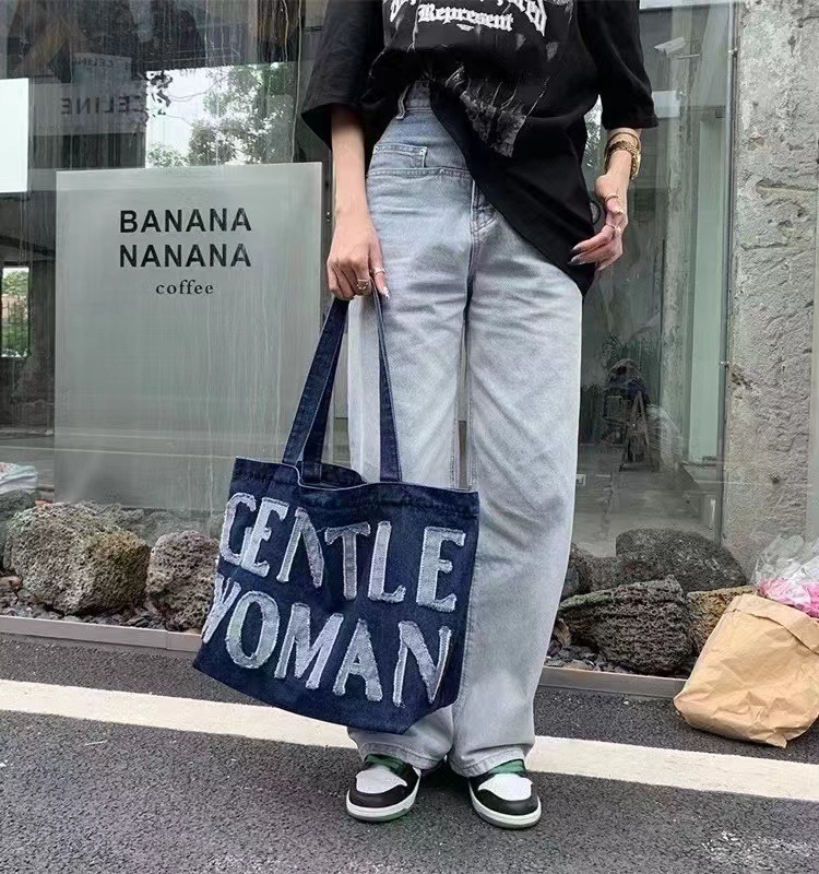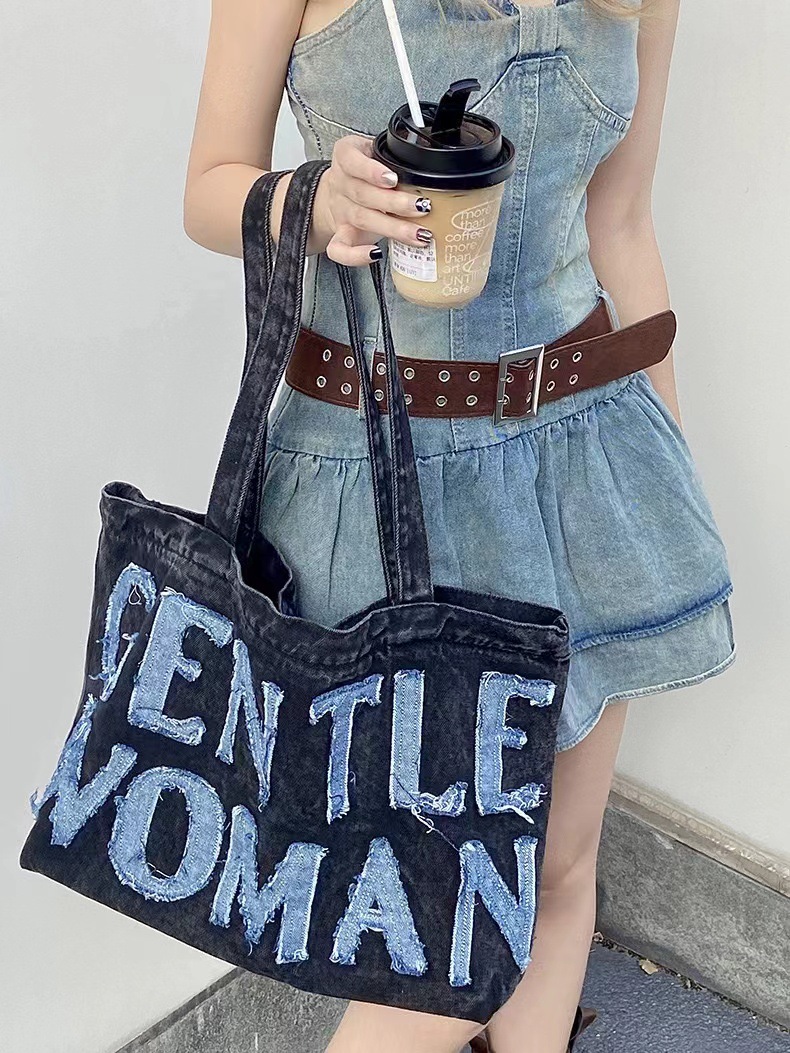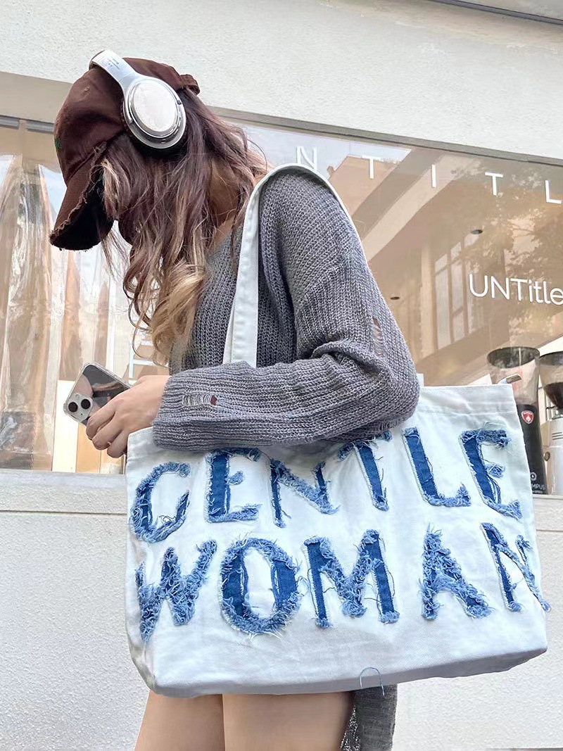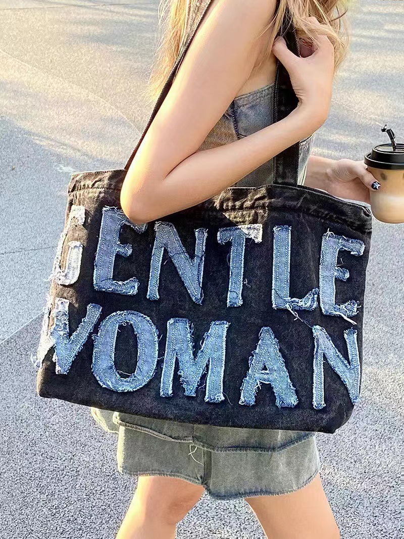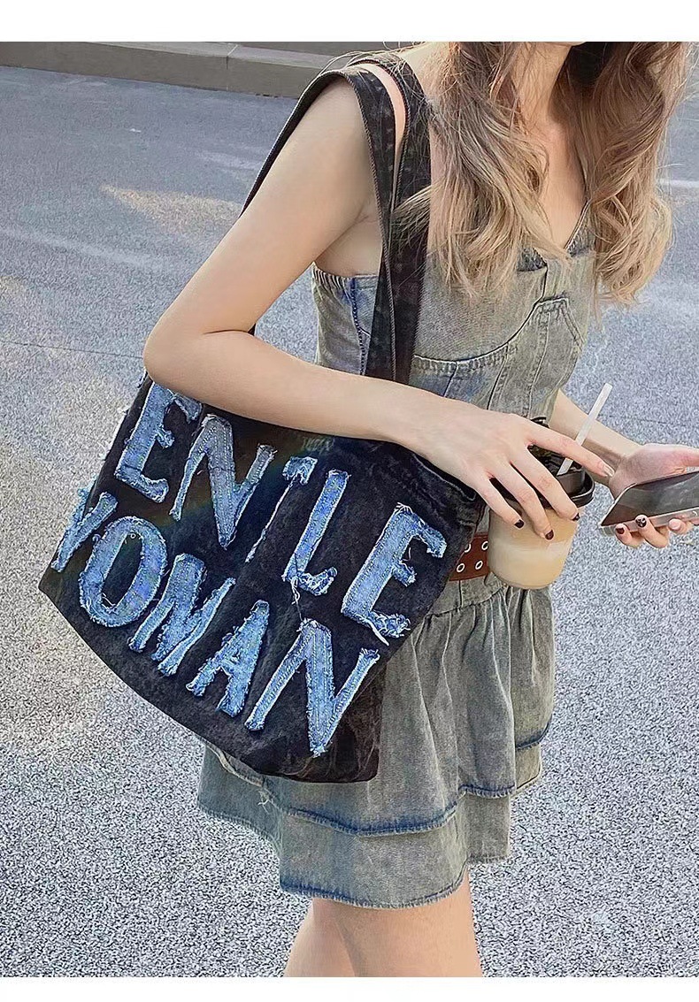 데님 가방 태국 트렌드 브랜드 대용량 핸드백 레터링 백 숄더백 데님 레터링 패치 백 스트리트 패션