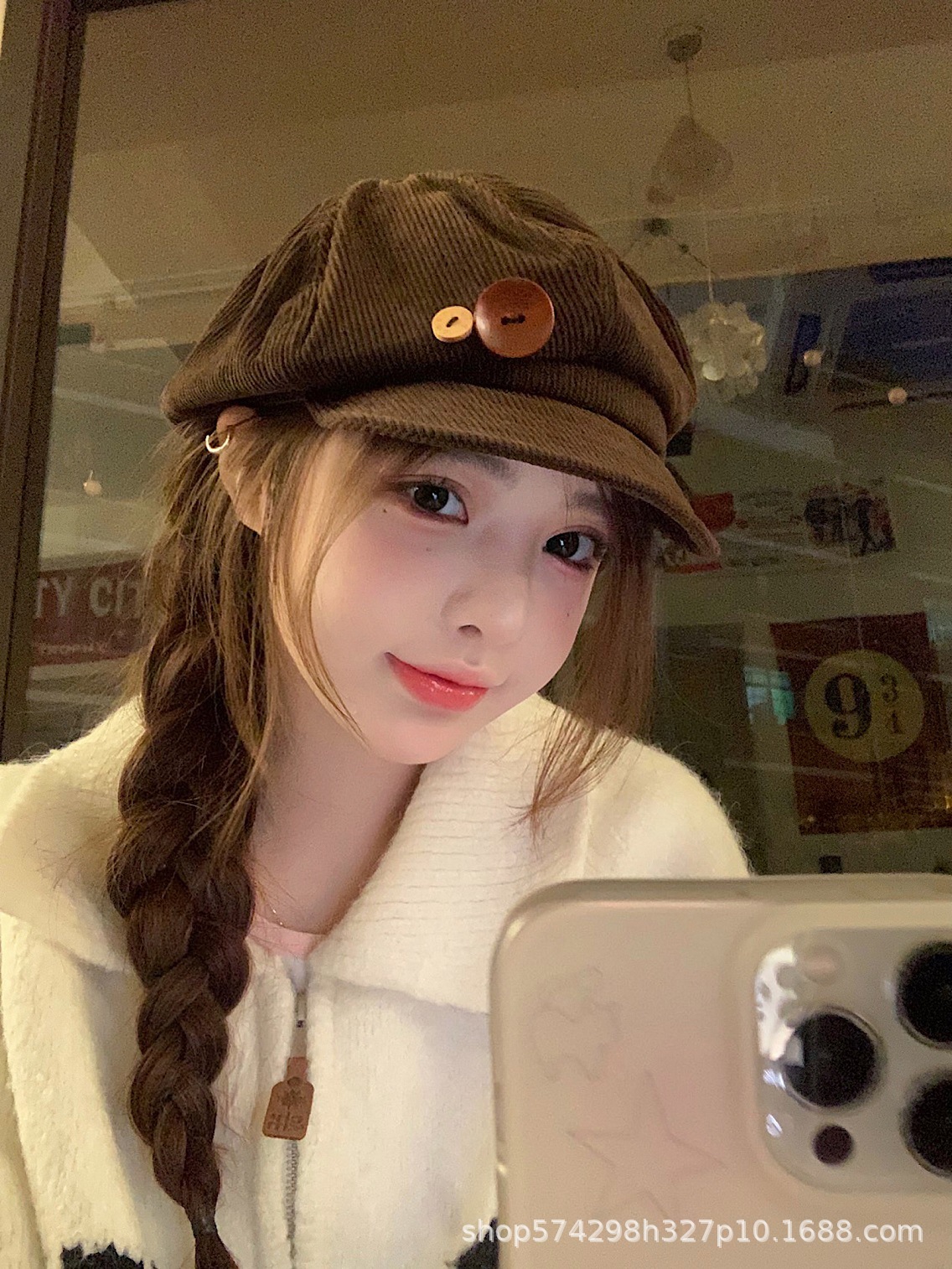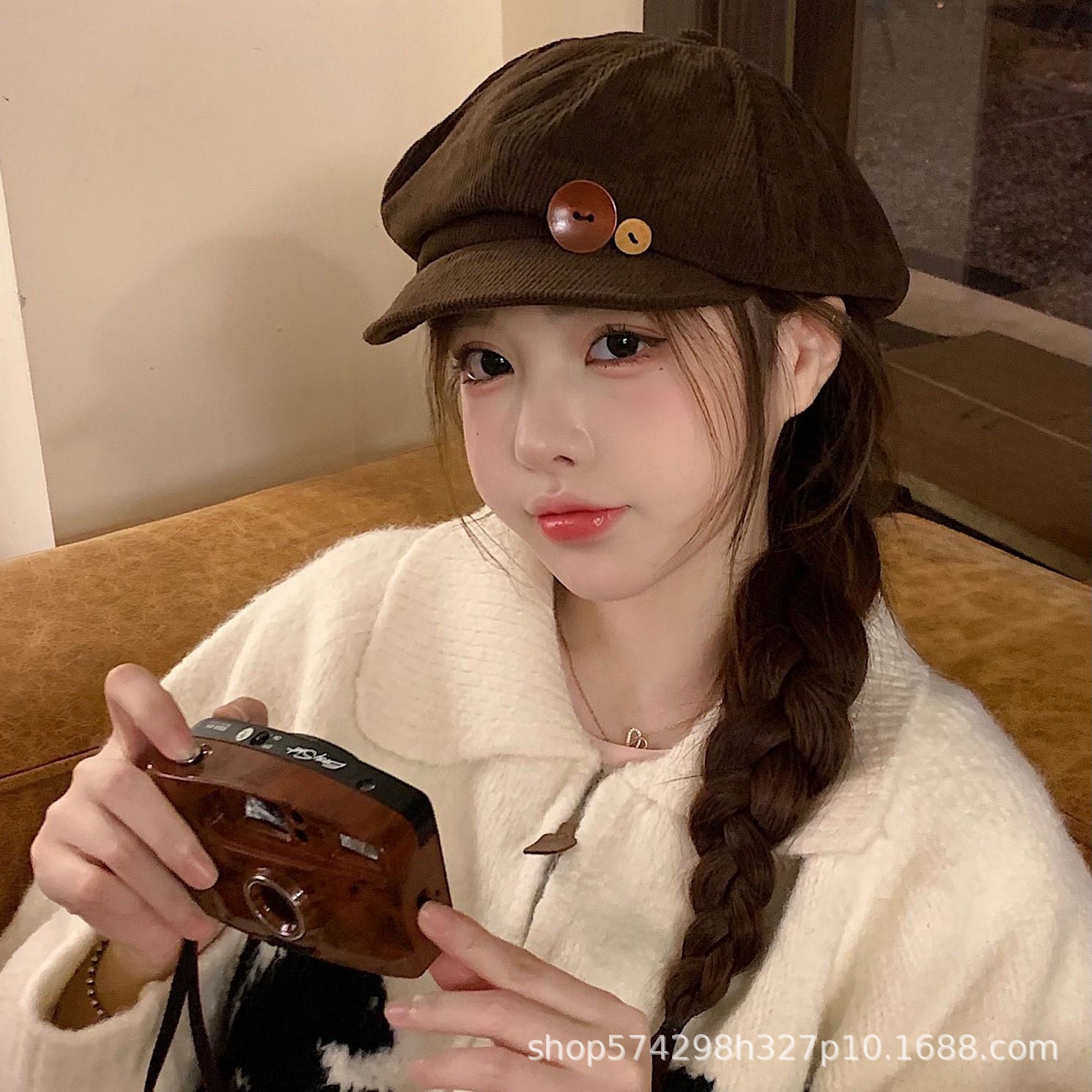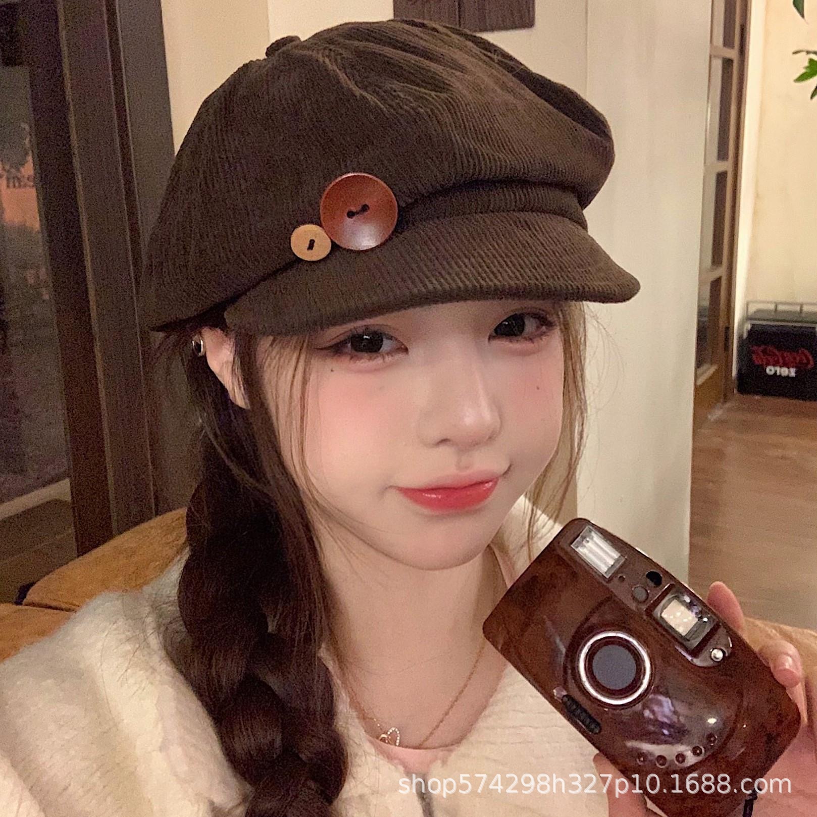 모자 여자 가을 겨울 일본 스타일 다크 브라운 빈티지 버튼 코듀로이 팔각형 시즌 올 매치 페이스 쇼 작은 화가 모자 뉴스 보이 모자스토어 가기