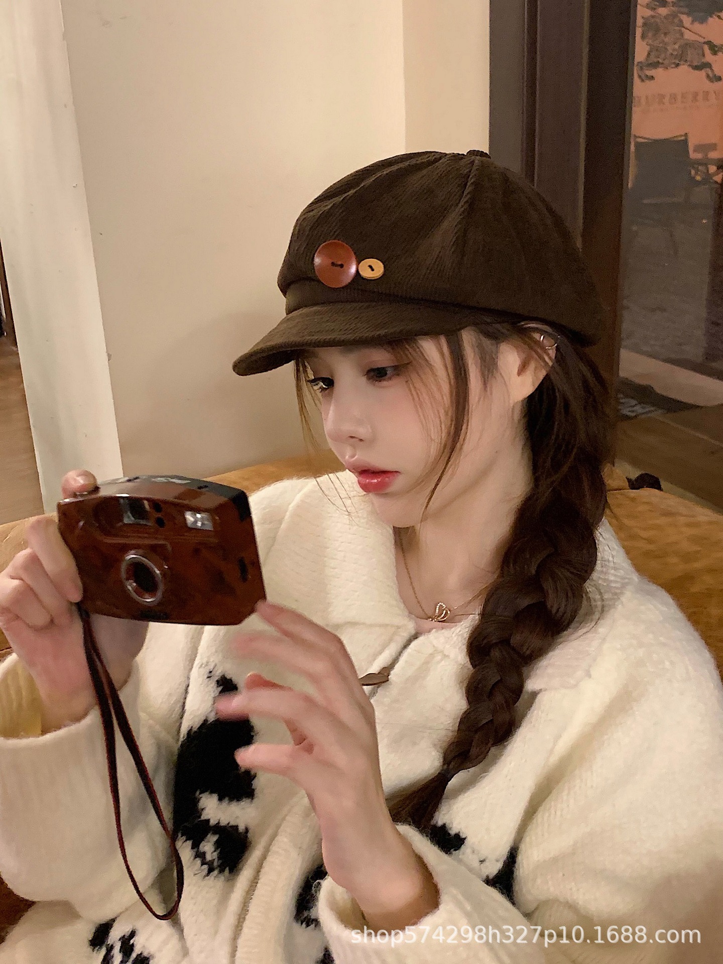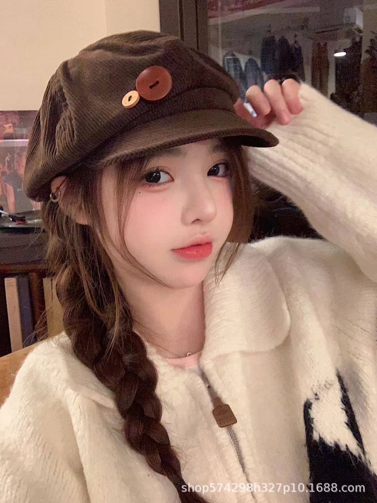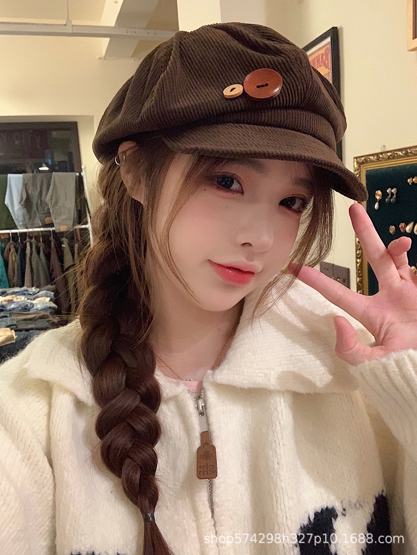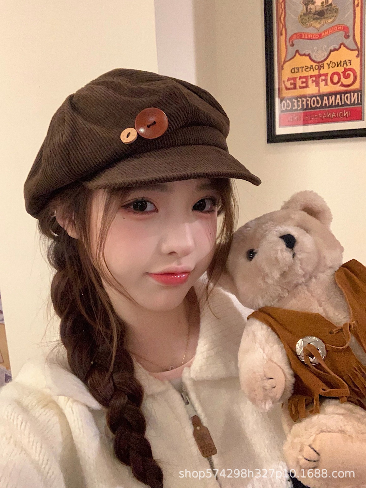 모자 여자 가을 겨울 일본 스타일 다크 브라운 빈티지 버튼 코듀로이 팔각형 시즌 올 매치 페이스 쇼 작은 화가 모자 뉴스 보이 모자스토어 가기