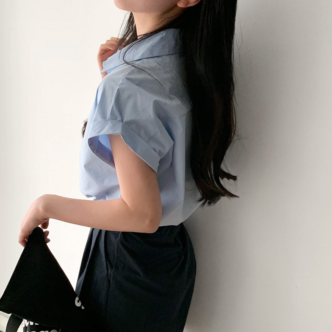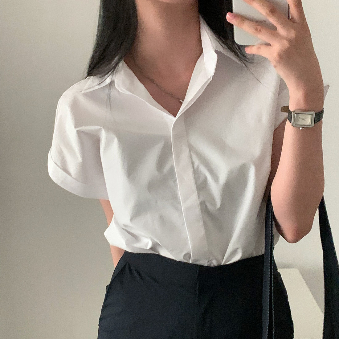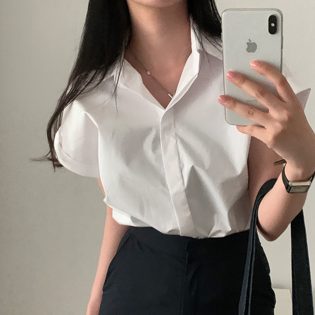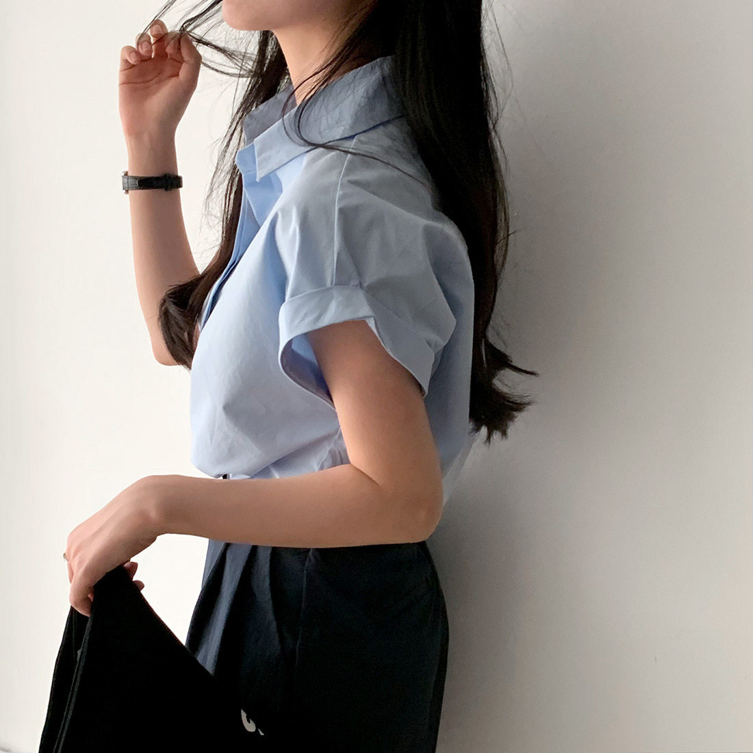 한국식 세련된 여름 간단한 기본 올매치 옷깃 싱글 브레스트 느슨한 단색 반팔 셔츠 탑