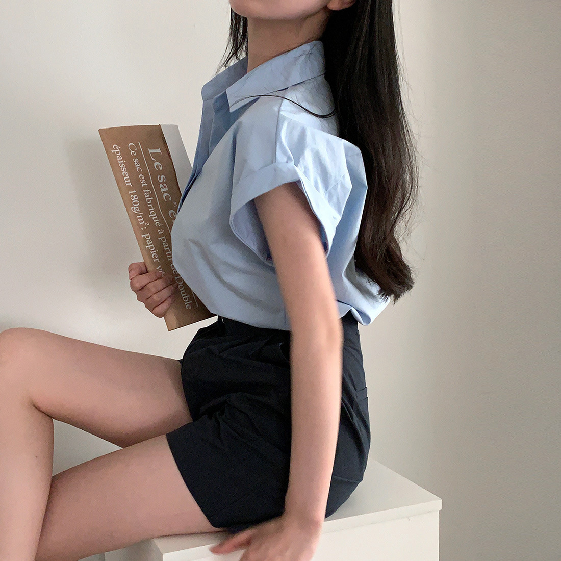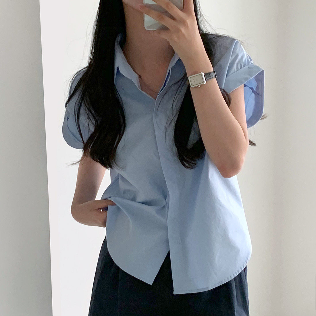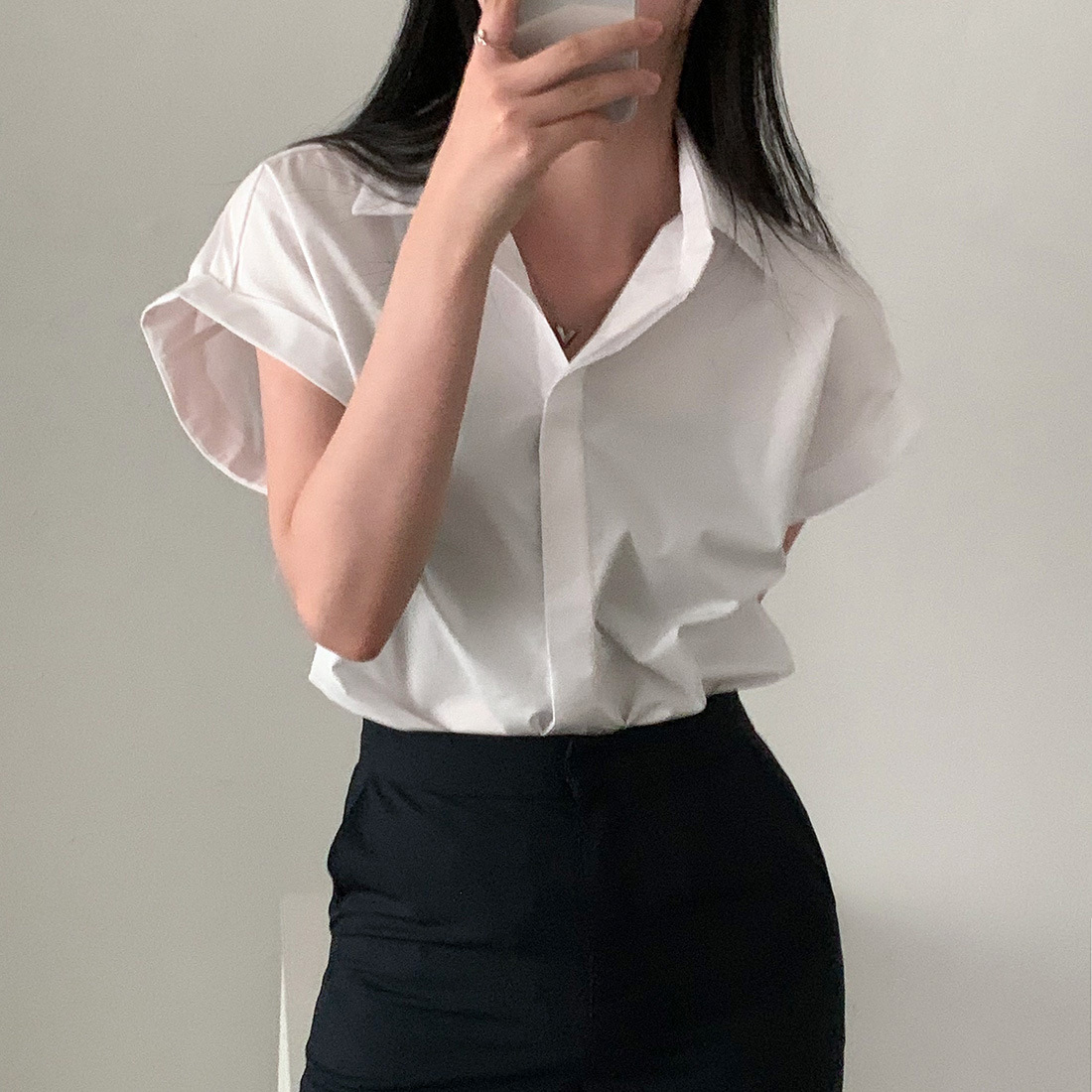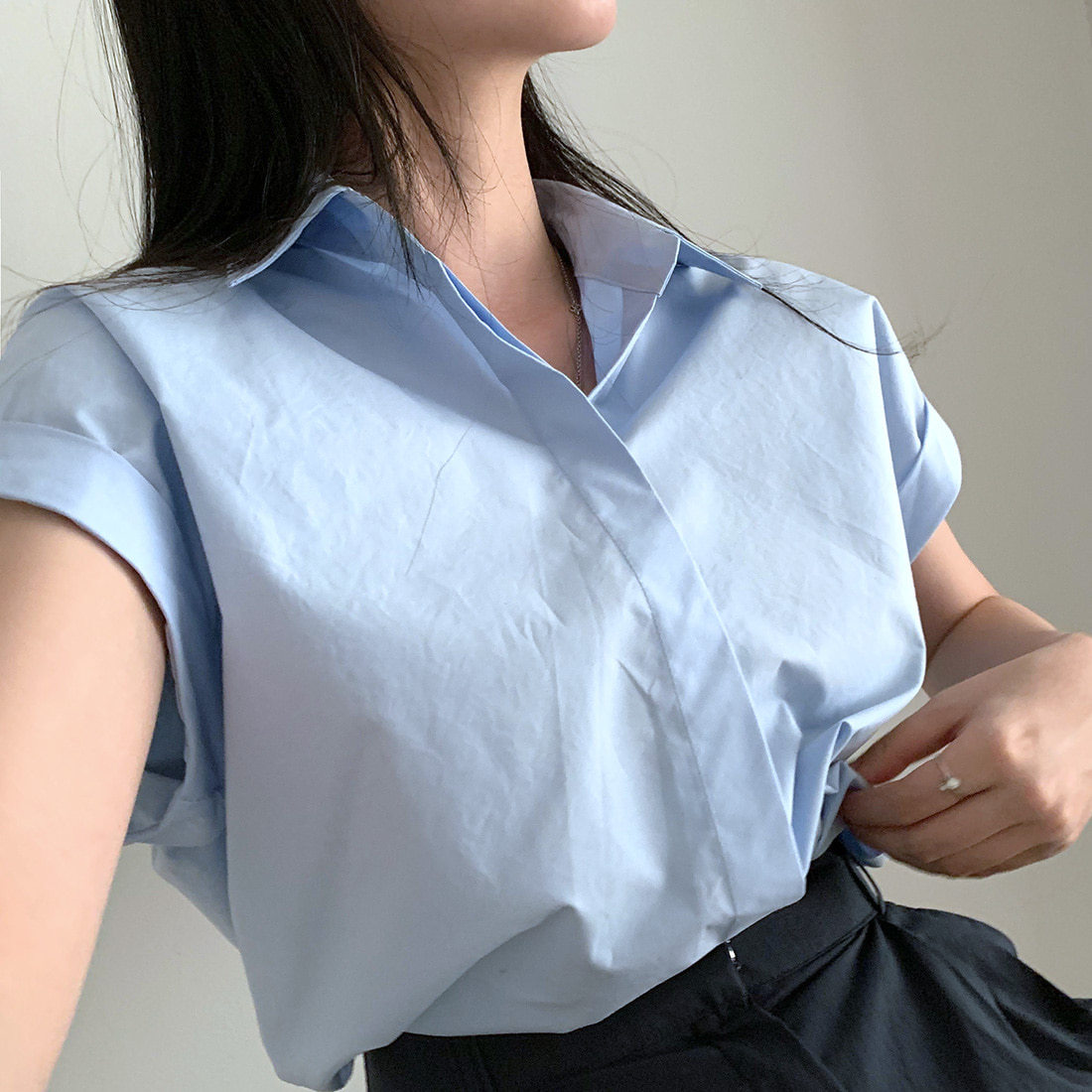 한국식 세련된 여름 간단한 기본 올매치 옷깃 싱글 브레스트 느슨한 단색 반팔 셔츠 탑