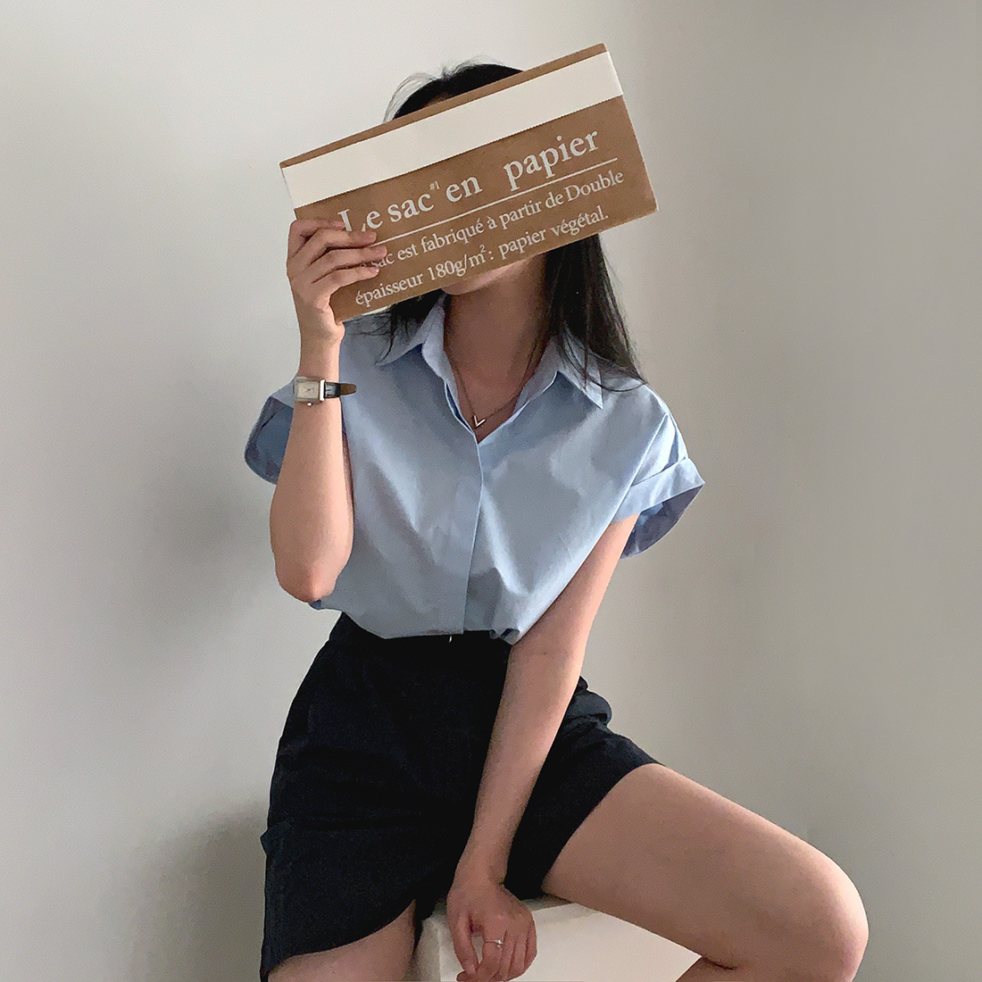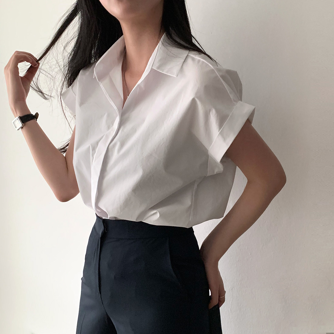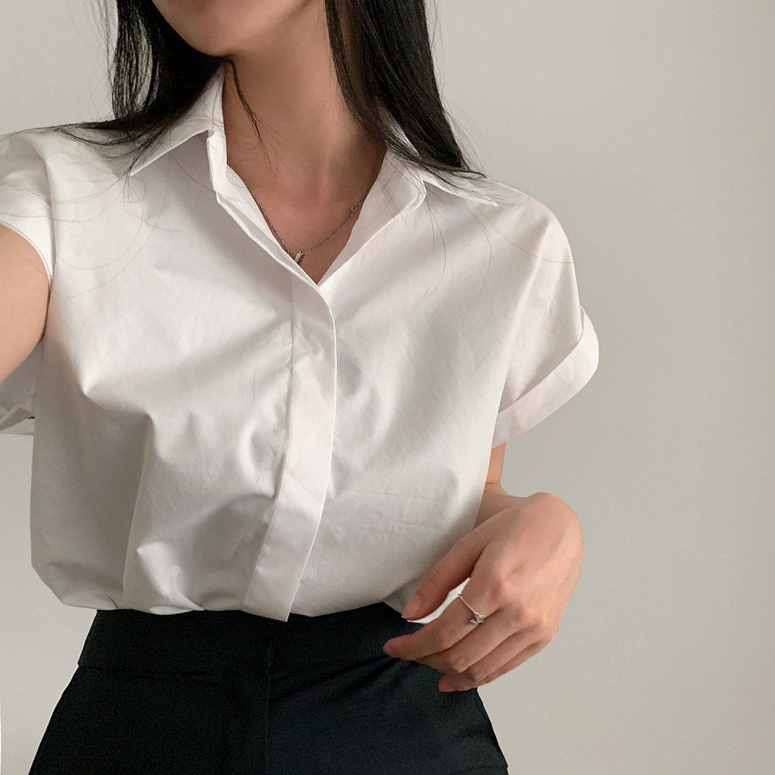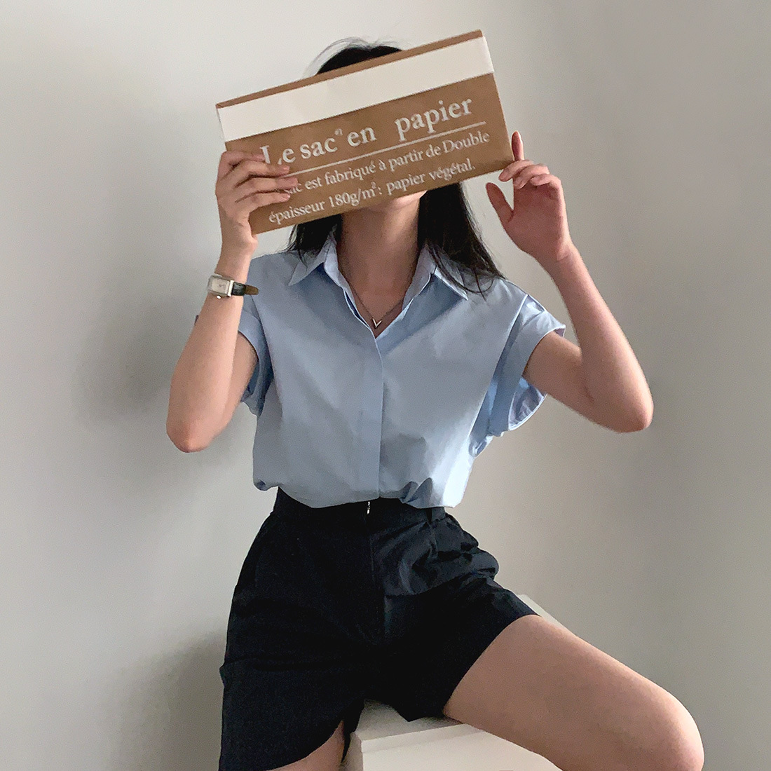 한국식 세련된 여름 간단한 기본 올매치 옷깃 싱글 브레스트 느슨한 단색 반팔 셔츠 탑