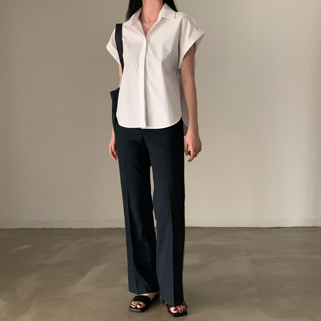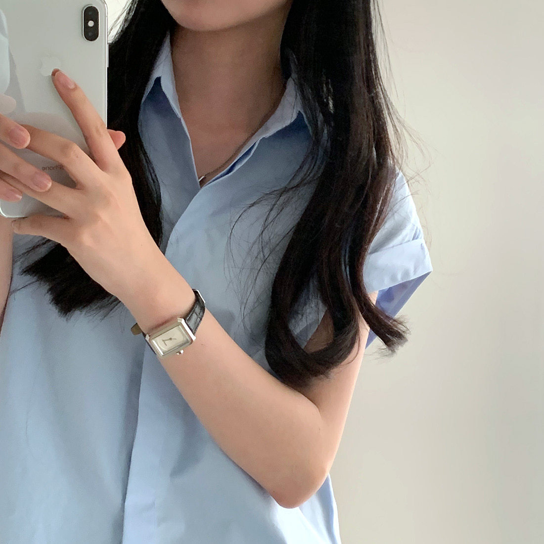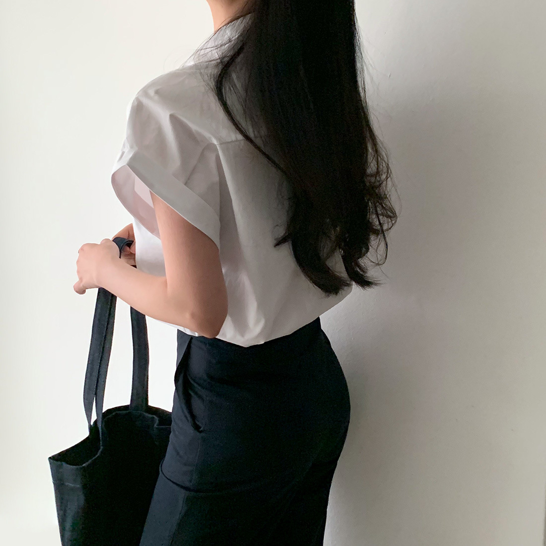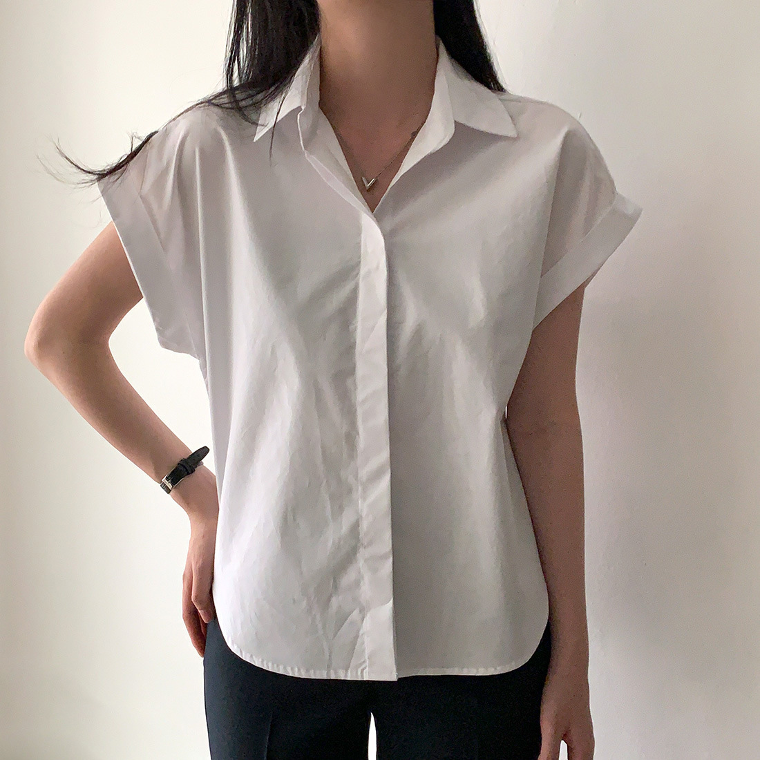 한국식 세련된 여름 간단한 기본 올매치 옷깃 싱글 브레스트 느슨한 단색 반팔 셔츠 탑