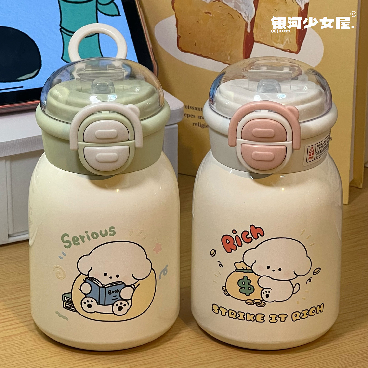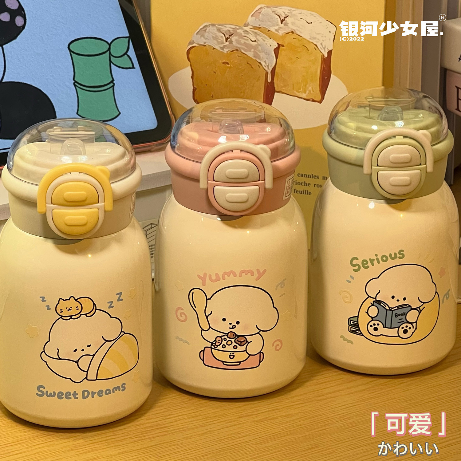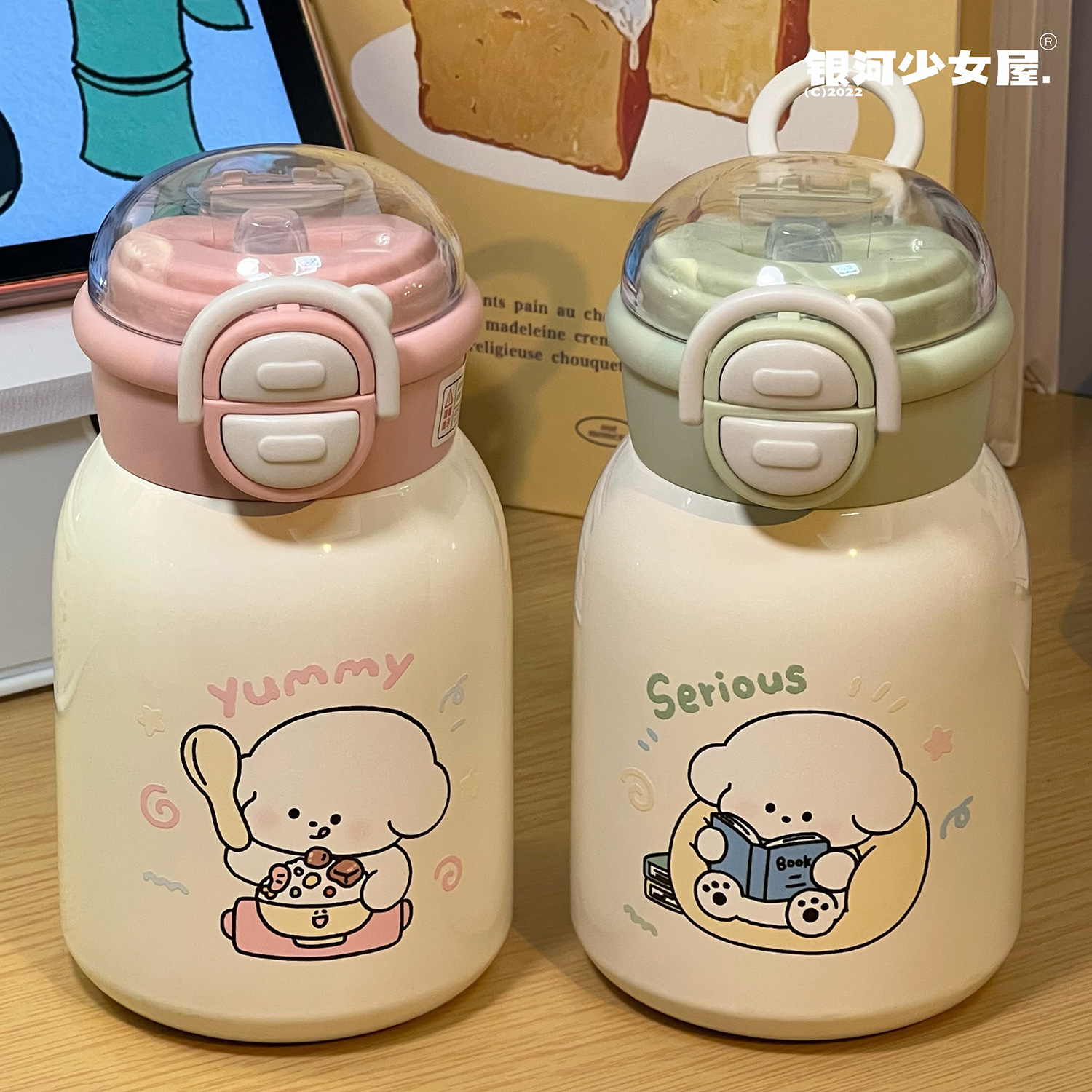간단한 보온병 컵 Ins 소녀 높은 가치 316 스테인레스 스틸 휴대용 밀짚 새로운 귀여운 학생 만화 물 컵스토어 가기