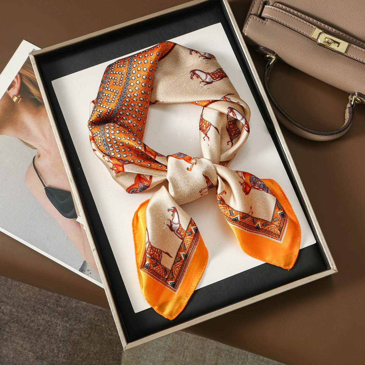 프랑스 빈티지 프린트 포니 컬러 매칭 실크 스카프 스퀘어 고급 올 매치 여성 여름 선스크린 헤드 스카프