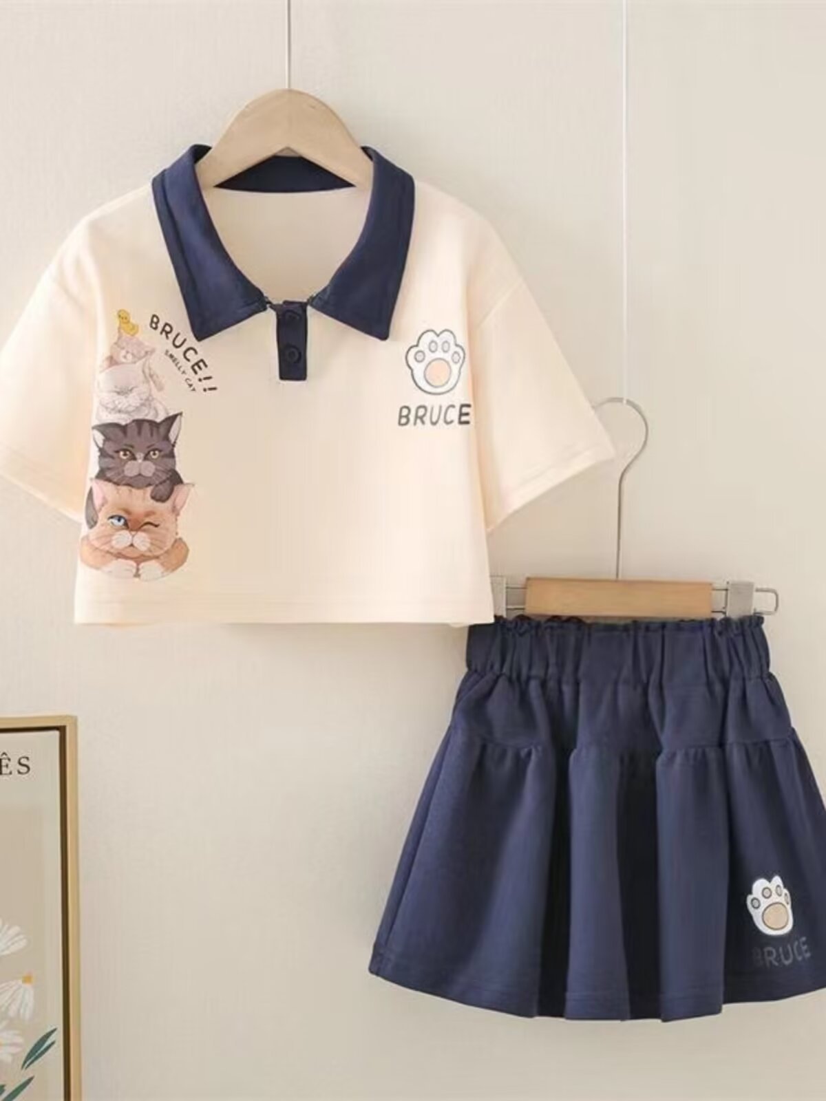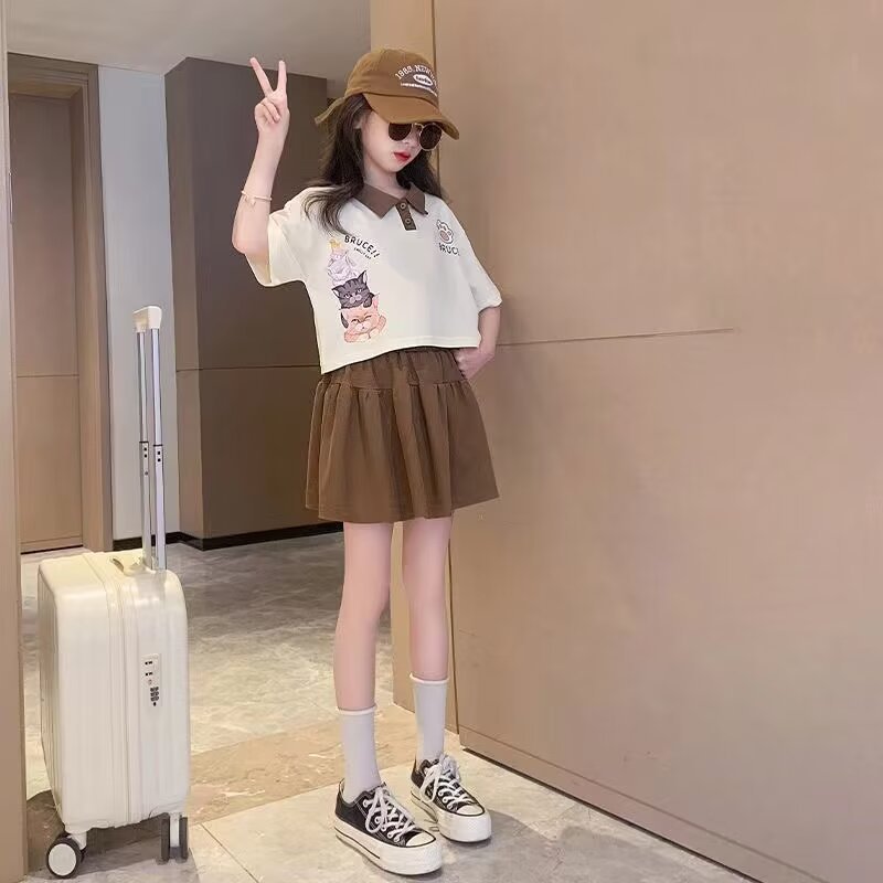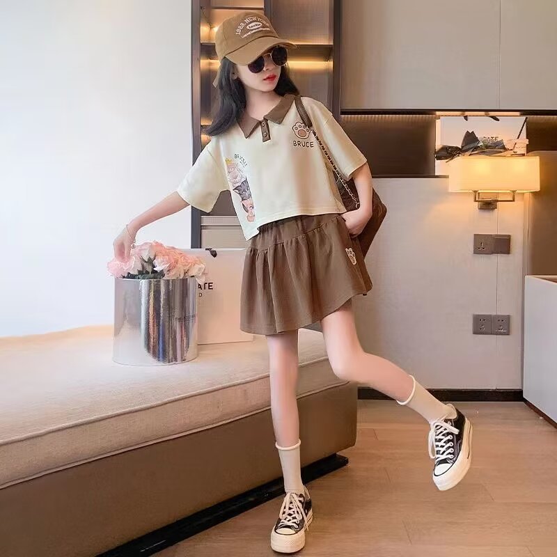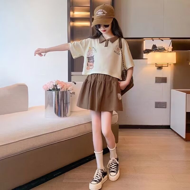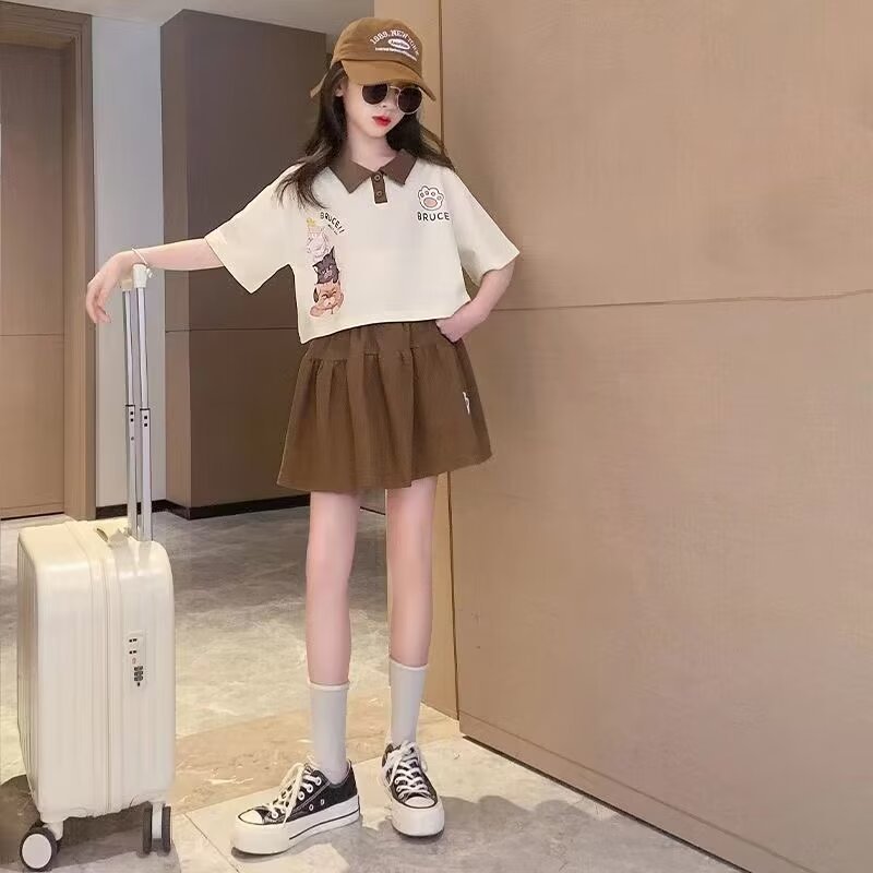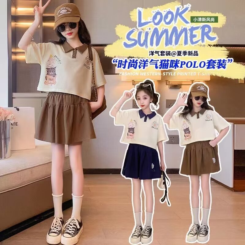 소녀 여름 반팔 원피스 2024 여름 새로운 스타일 서양식 캐주얼 중대형 어린이 폴로 셔츠 짧은 스커트 투피스 세트스토어 가기
