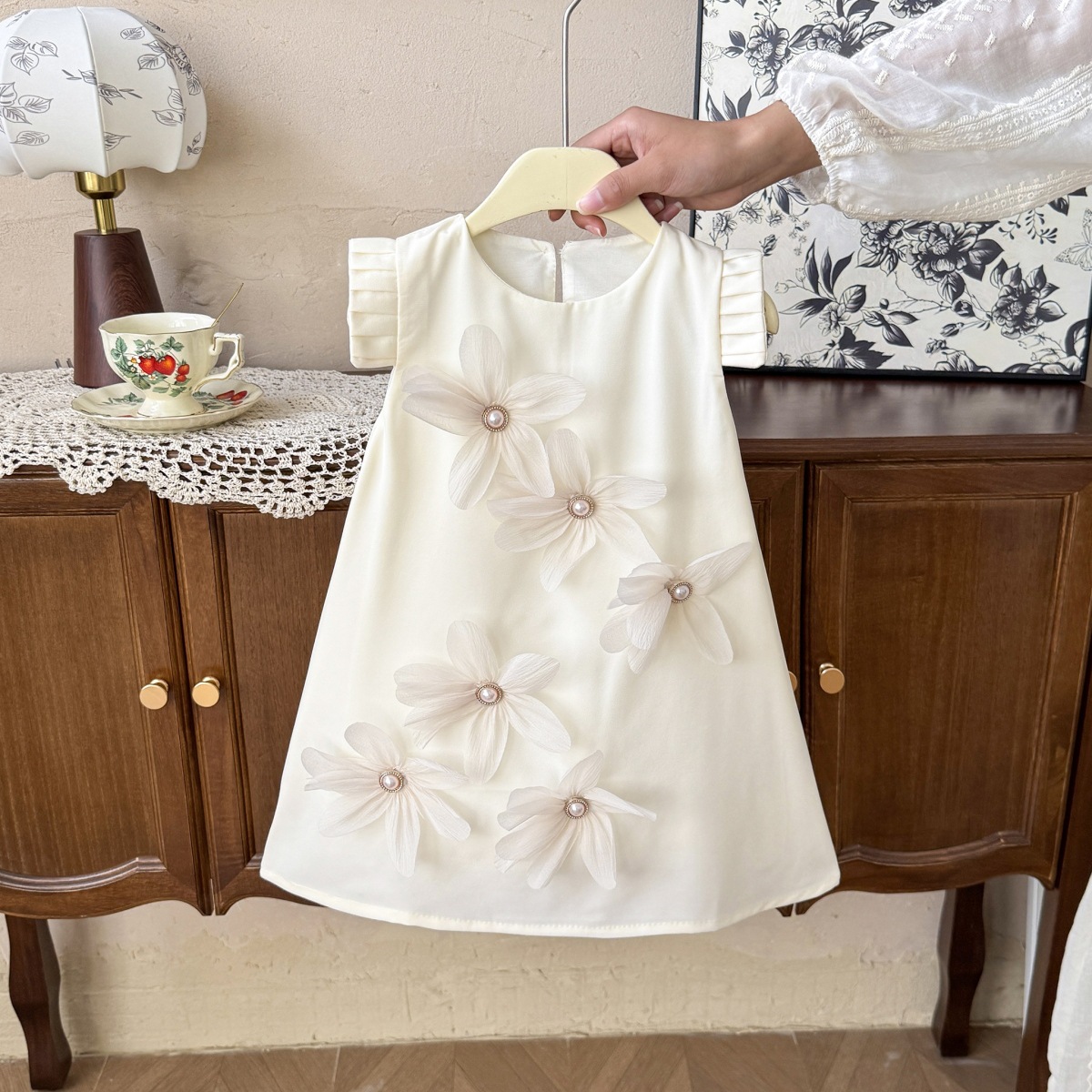 77321 2025 여름 새로운 한국 스타일 소녀 꽃 주름 플라이 슬리브 롱 스커트 소녀 기질 아름다운 드레스스토어 가기
