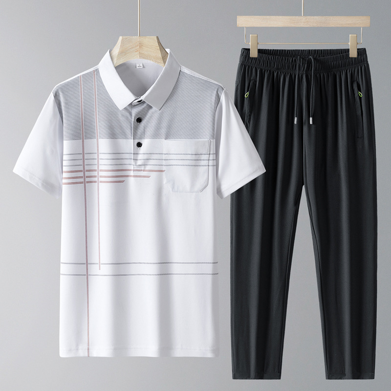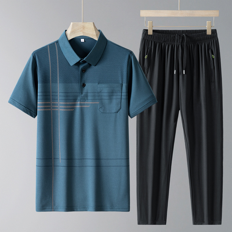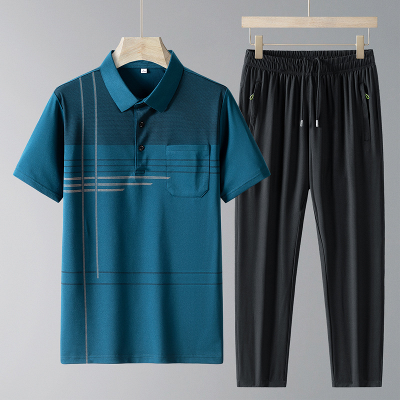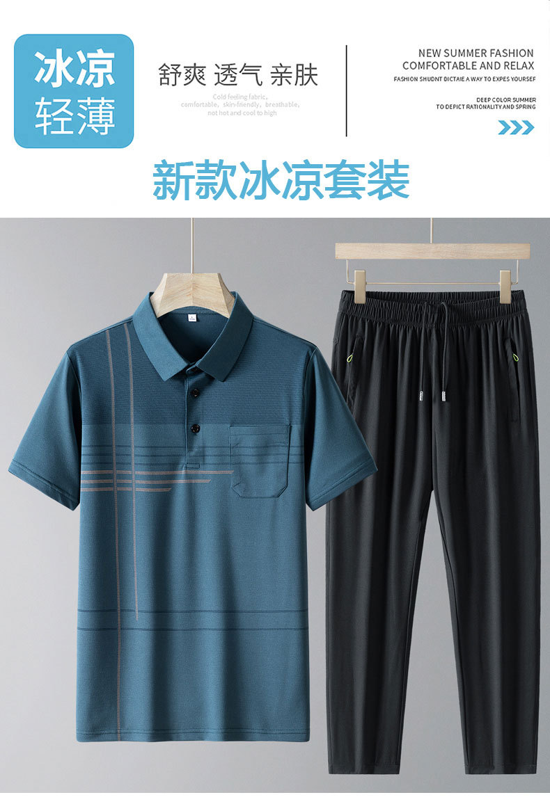 아빠 여름 옷 아이스 실크 스포츠 세트 남자 여름 반팔 바지 남자 캐주얼 운동복 중년 및 노인 투피스 세트